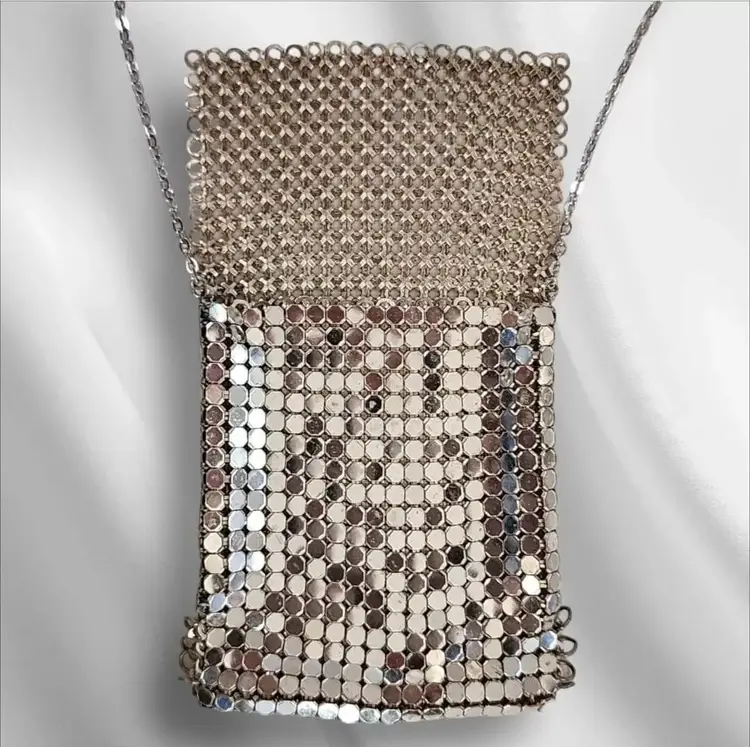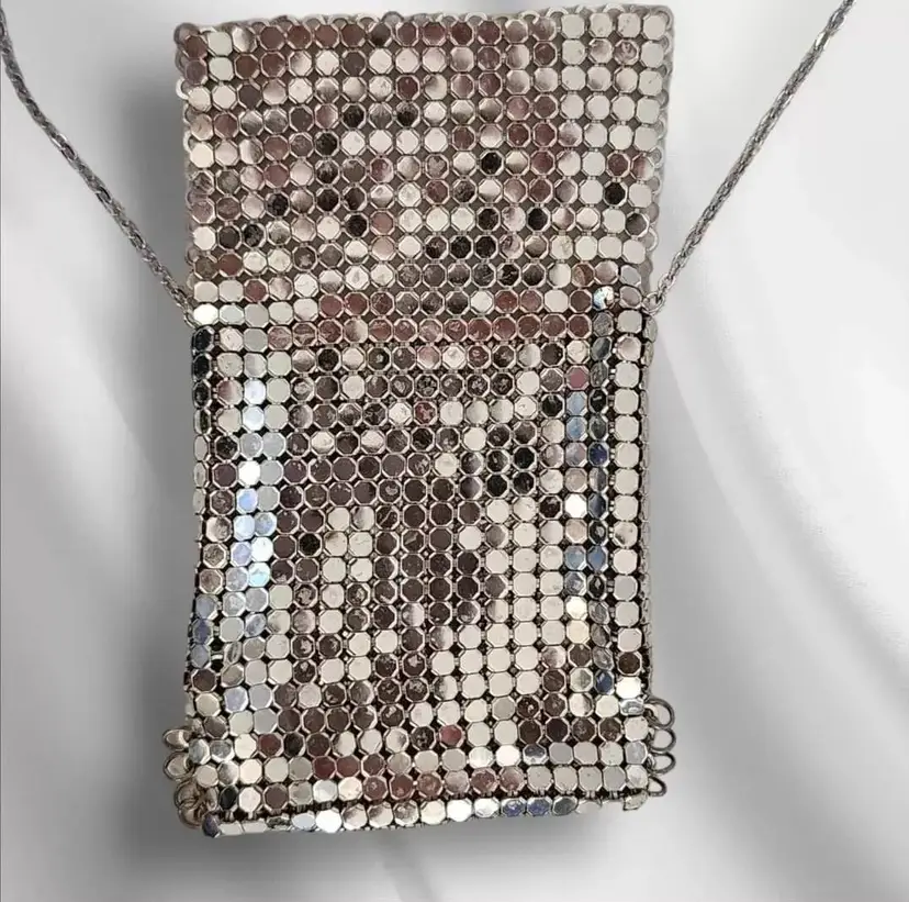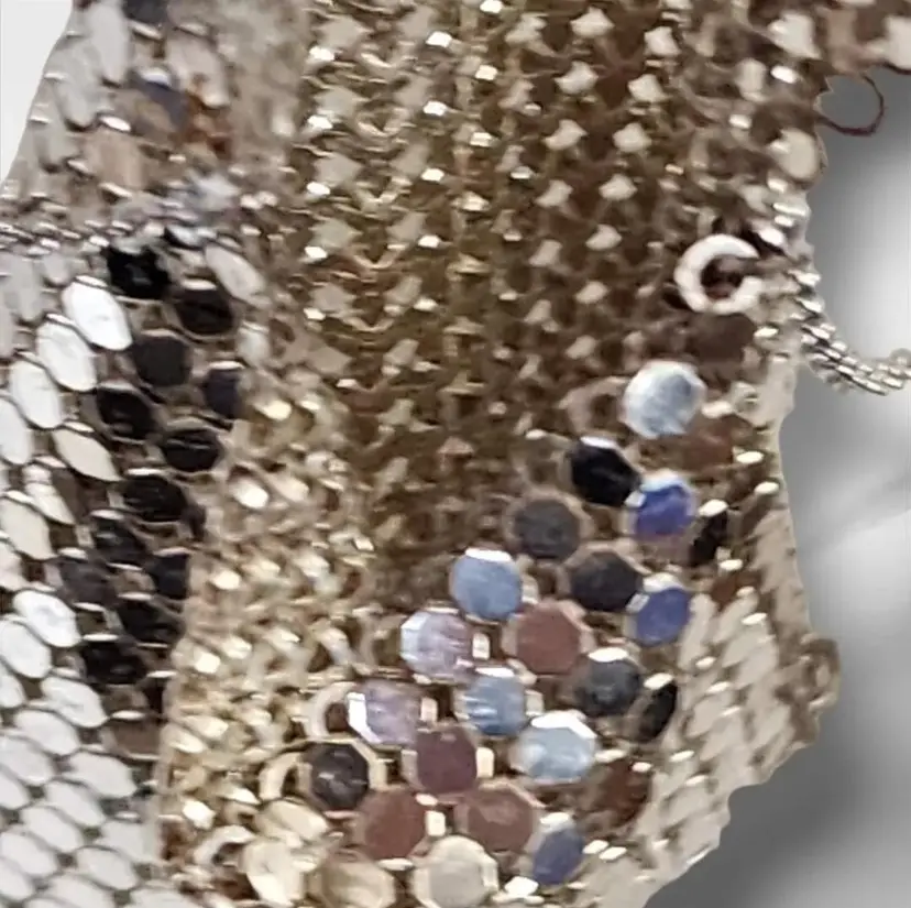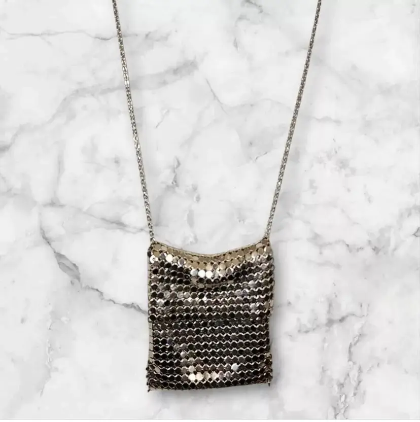 Intricate chainmail mesh pouch pendant purse Hung from an silver-tone chain with spring ring closure. Fold-over mesh closure The necklace is pre-owned, but has been well-maintained and is in great condition. Unsigned