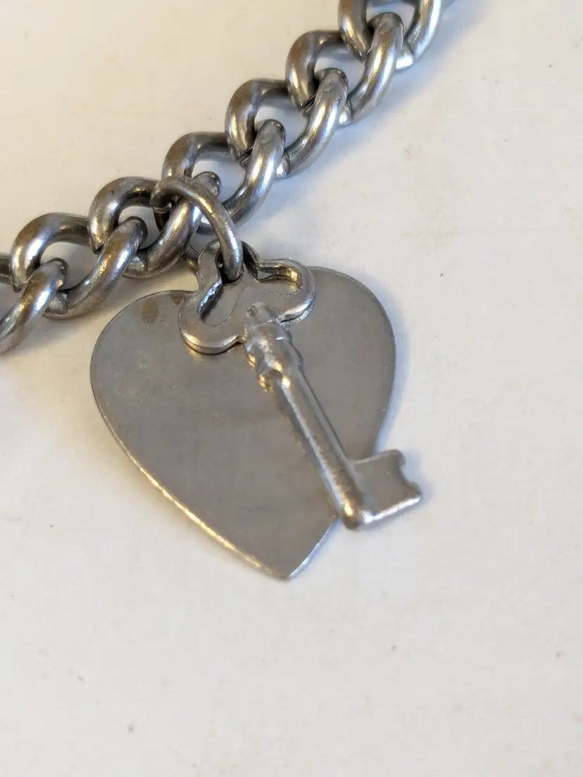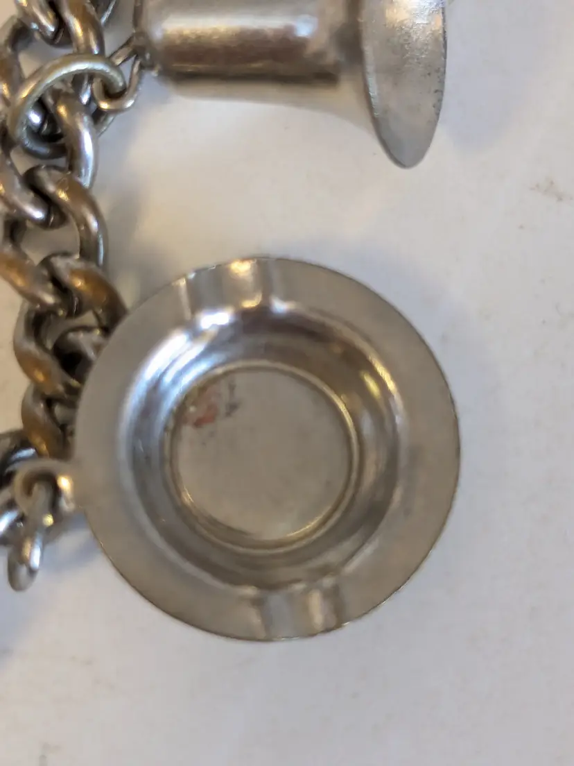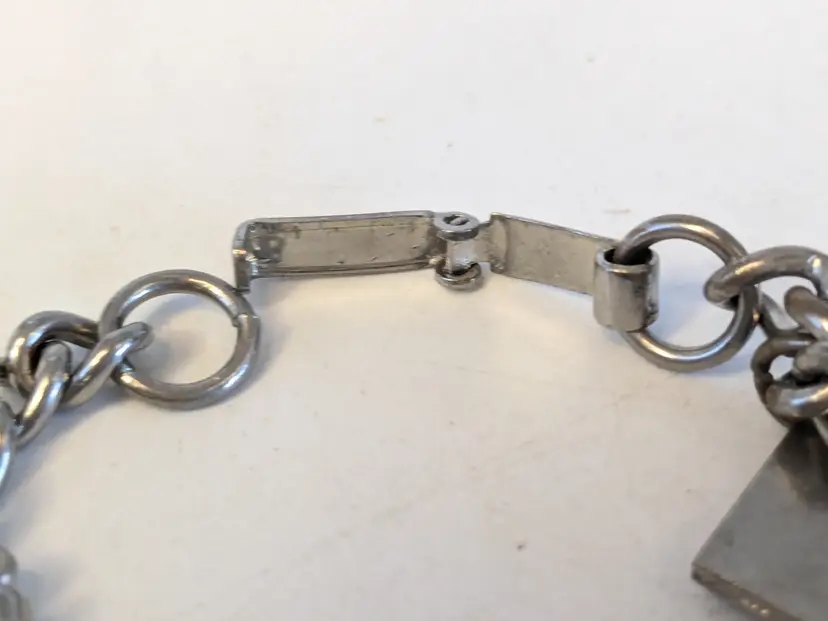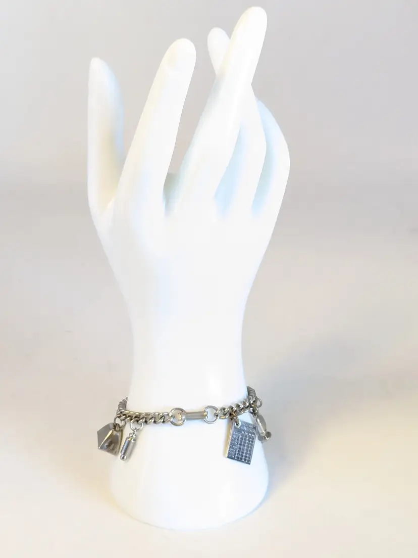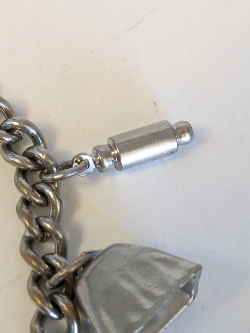 So kitschy! Good vintage condition. Silver tone. Bracelet has eight charms and a fold over clasp. Measures 6 1/2". wen