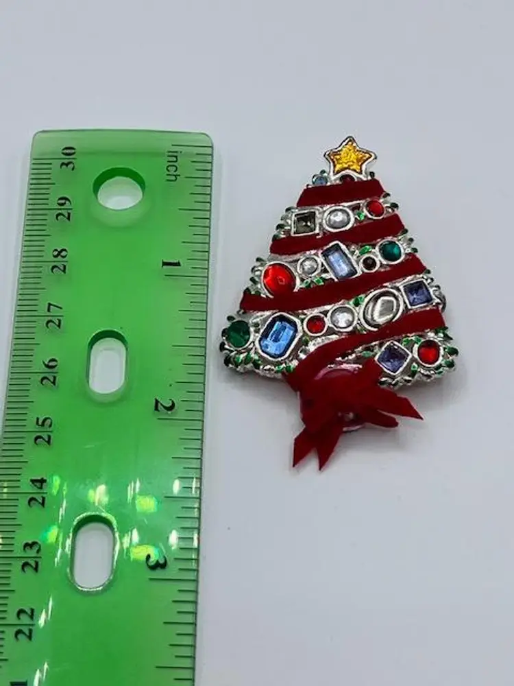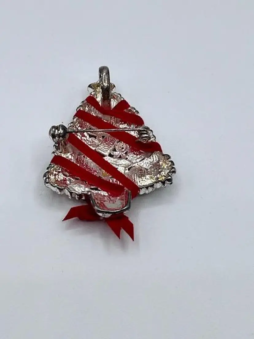 Add a festive touch to your holiday outfit with this vintage silver tone Christmas tree brooch pendant. Featuring different shaped large rhinestones and a red ribbon, this brooch is perfect for any Christmas occasion. The tree shape is embellished with multicolor rhinestones that capture the holiday spirit. Whether you wear it as a pendant or brooch, this Christmas tree accessory will make a statement.