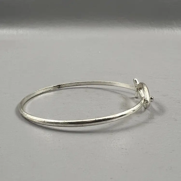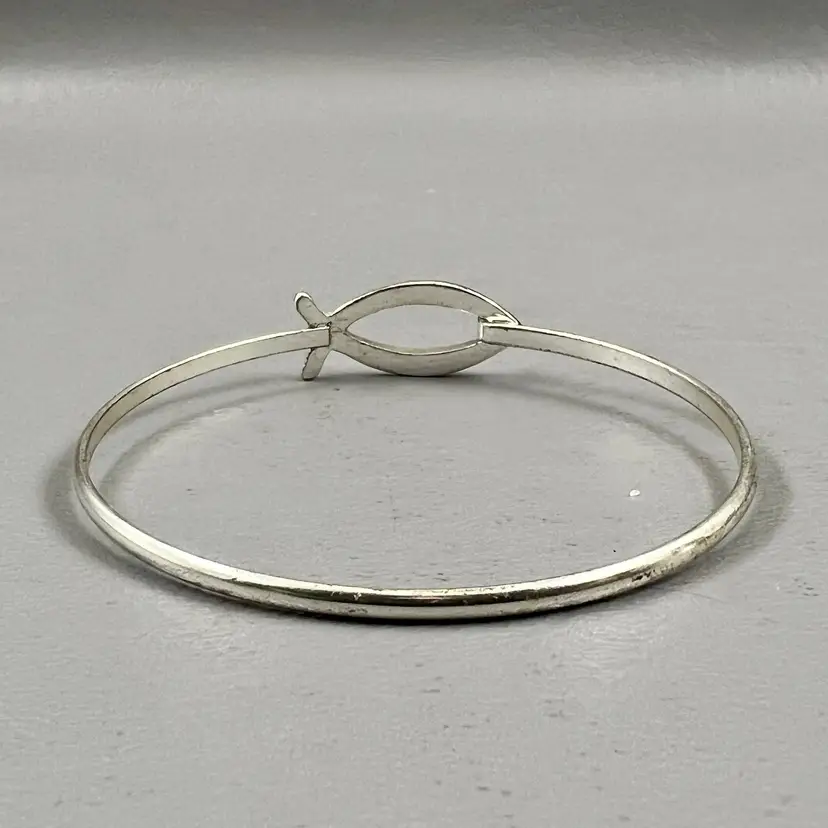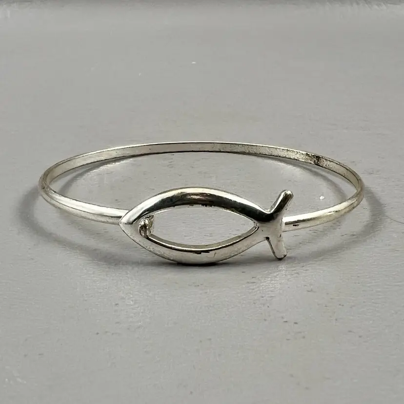 Vintage Silver Tone Ichthus Jesus Fish On Hook Bangle Bracelet Christian