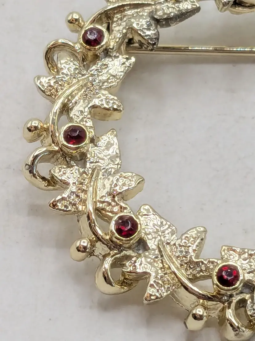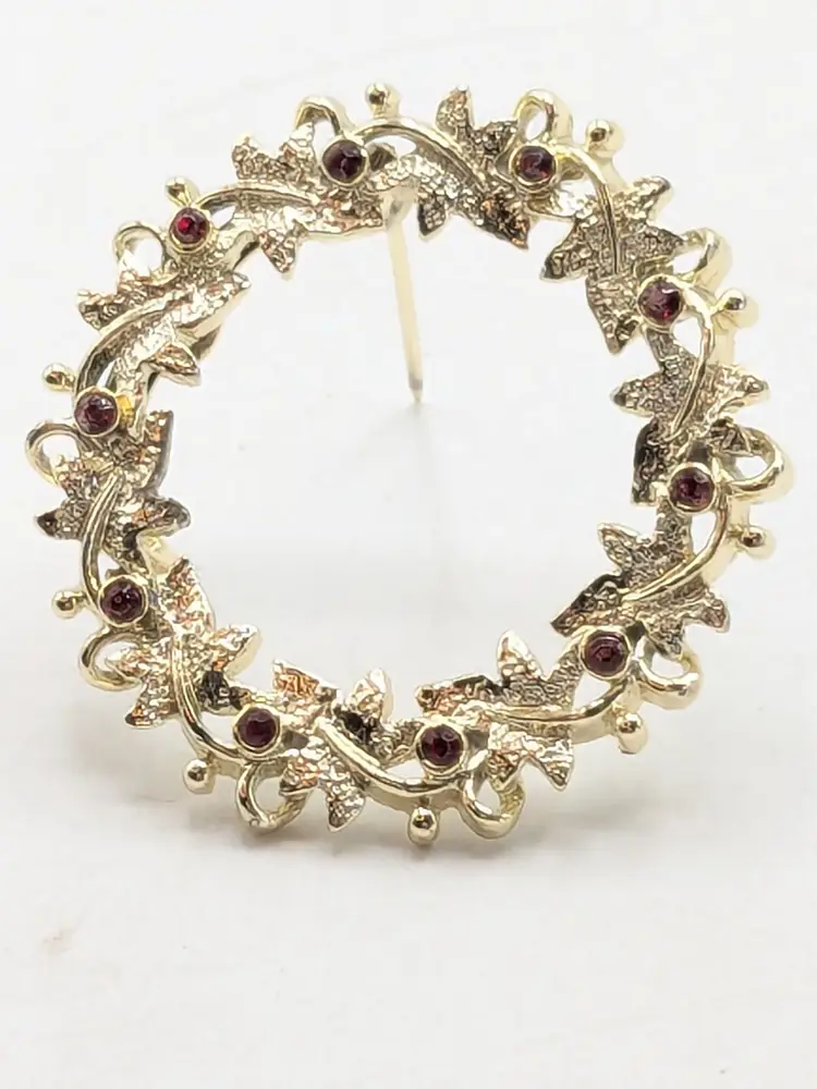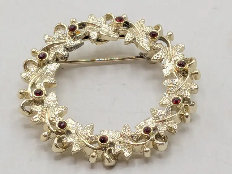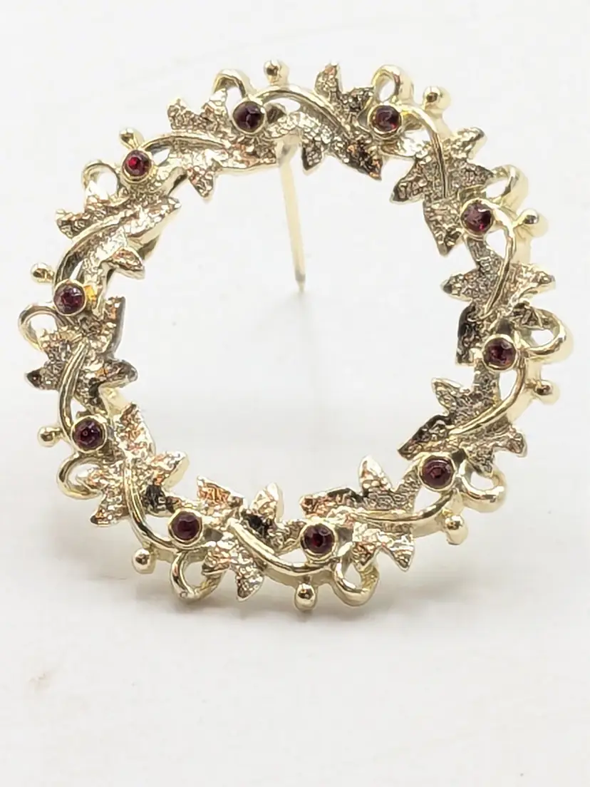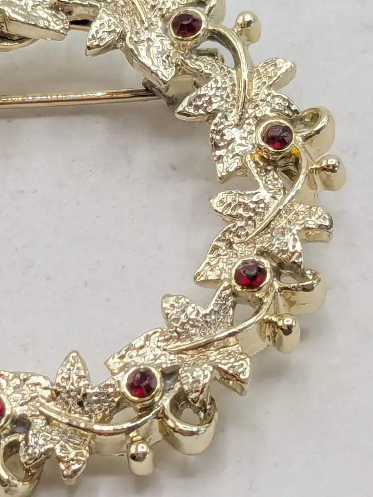 Good condition. Features a circular leaf wreath design with red rhinestones. Silver tone is bright and shiny with no color loss. Brooch is marked but I cannot make out signature. Measures 1.5". wen