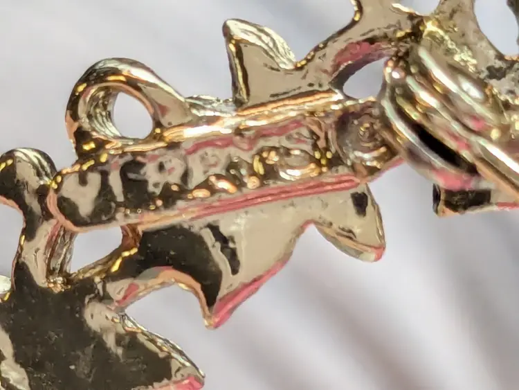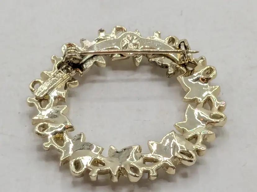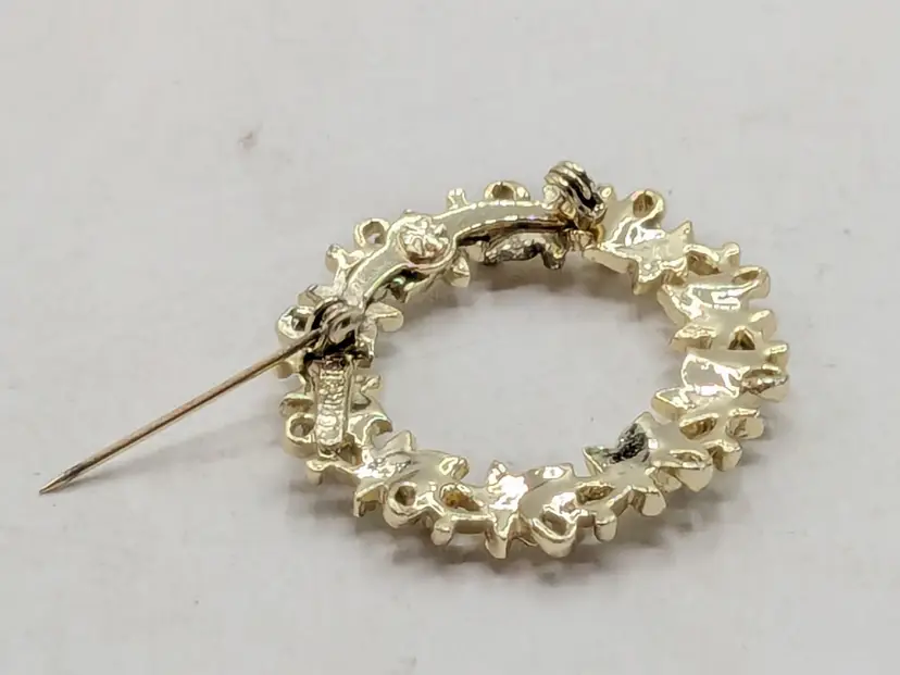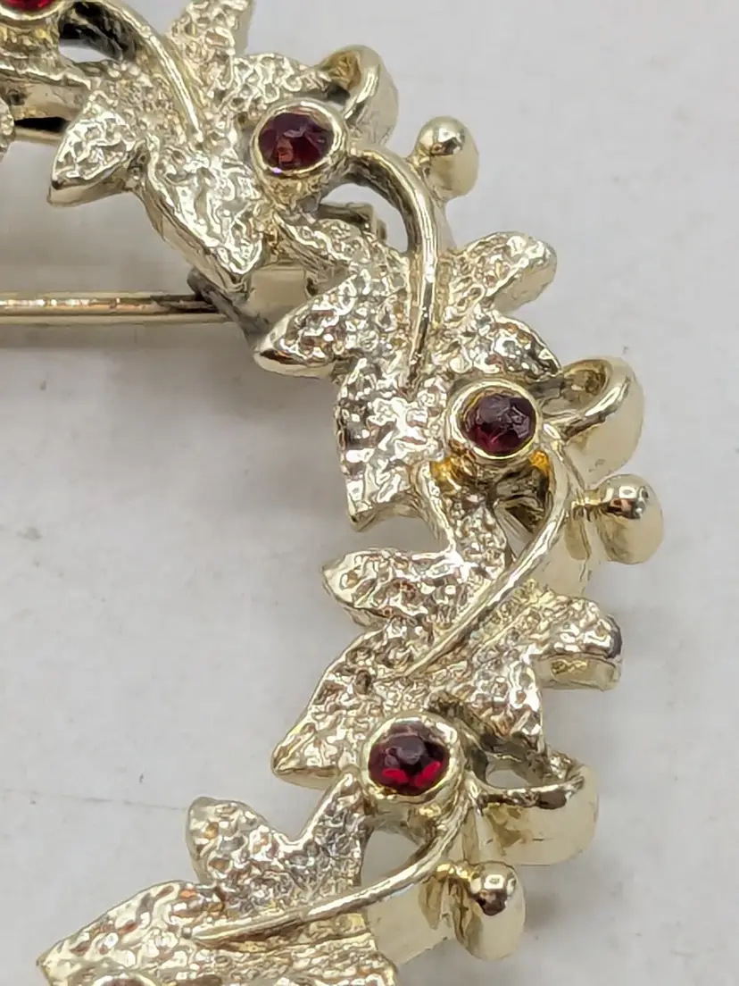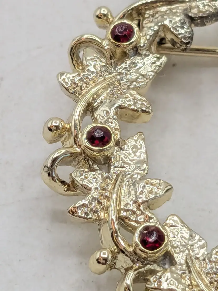 Good condition. Features a circular leaf wreath design with red rhinestones. Silver tone is bright and shiny with no color loss. Brooch is marked but I cannot make out signature. Measures 1.5". wen