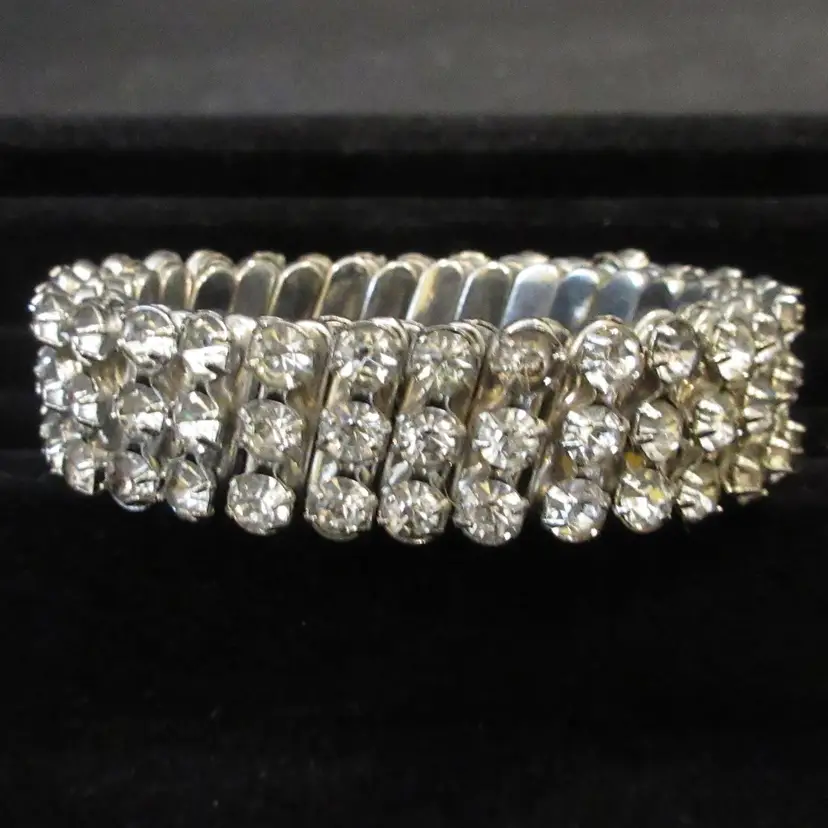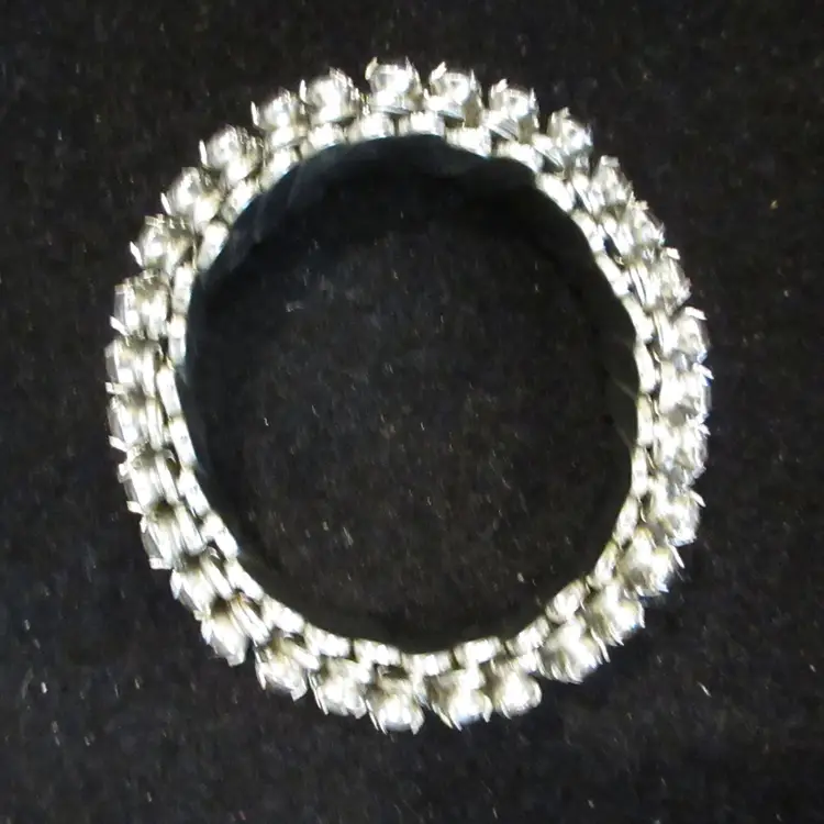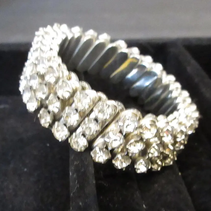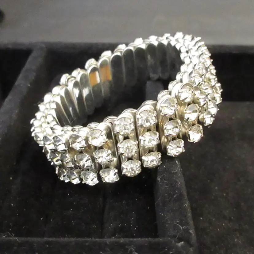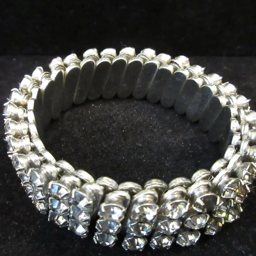 This is an AMAZING silver tone metal and clear rhinestone stretch bracelet. The bracelet is designed like an accordion and separates into smaller sections when stretched. Each section contains 3 clear rhinestones that have been prong-set into the silver metal. This bracelet is 2.5 inches in diameter when not stretched, but can double that size when stretched.