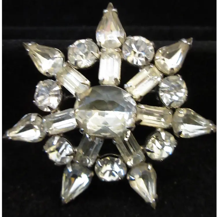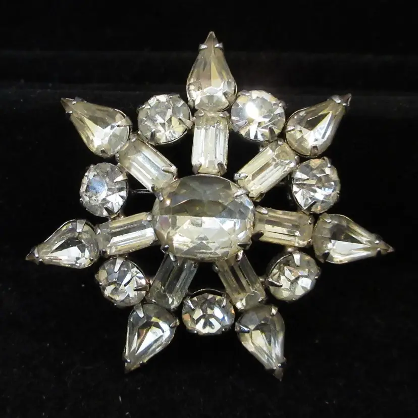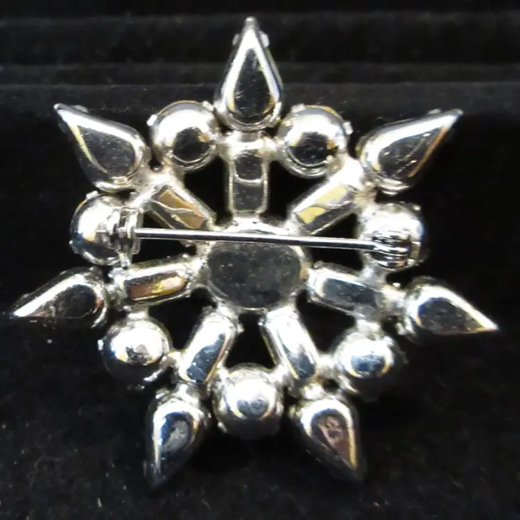 This is a BEAUTIFUL vintage silver tone metal and clear crystal rhinestone brooch. The brooch is made of various shaped rhinestones to resemble a snowflake or a star. It's the perfect accent to any holiday outfit, or for a night out! This brooch has marquis, teardrop, and round rhinestones, all prong-set in the silver tone metal. They are clear, so the metal shows through, giving it a shimmery effect, like a snowflake. This brooch is about 1.5 inches in diameter and has a pin back with a sliding C closure.