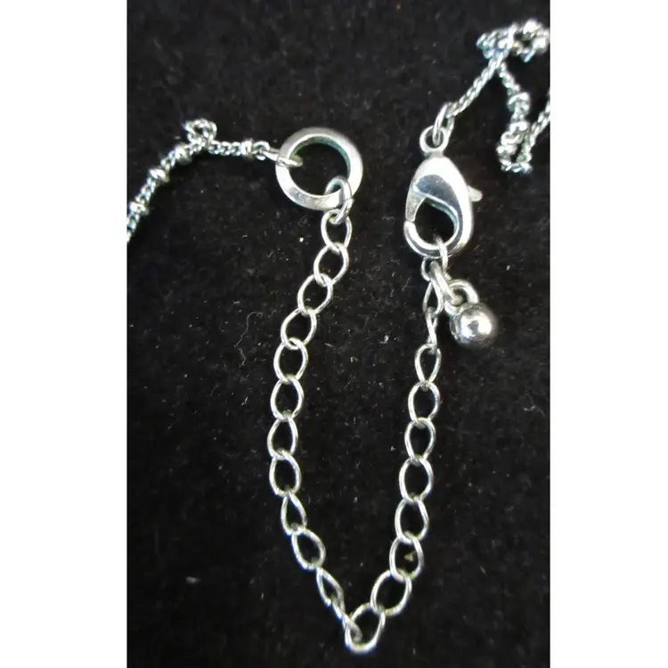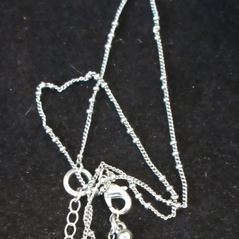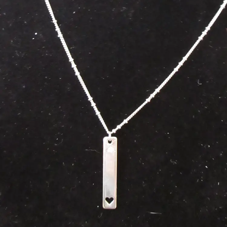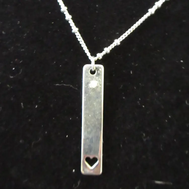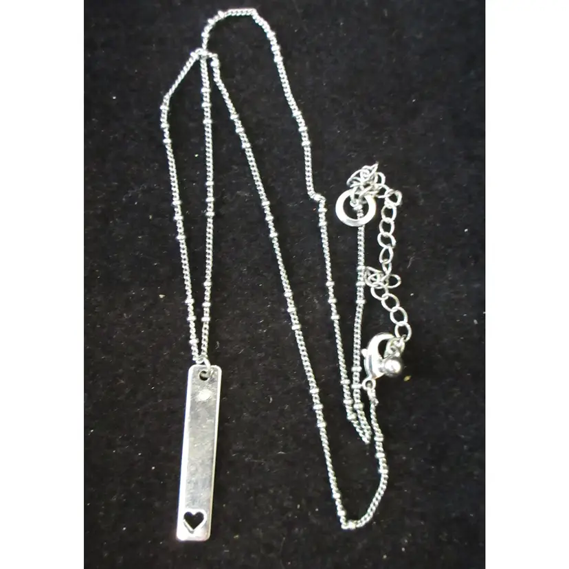 This is a beautiful vintage silver tone metal bar pendant necklace from the 1980s. It's most likely Avon, but is not marked. The bar has a small hear cut out at the bottom end and a single rhinestone set at the top. The necklace is a small cable chain with alternating silver tone metal balls for an amazing effect. The necklace is 20 inches long (with the extender) and closes with a lobster claw.