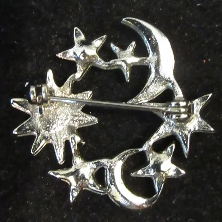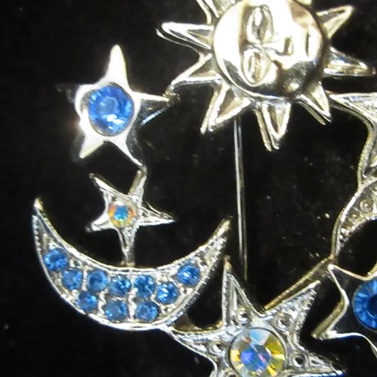 This is an AMAZING vintage silver tone metal brooch shaped like a sun, moons and stars in a circle. The moons and stars feature aurora borealis and blue rhinestones, which make them seem like they're glowing in the night. The sun is silver tone metal and has an anthropomorphic face. This brooch is 1.25 inches in diameter and has a pin back with a sliding C closure.