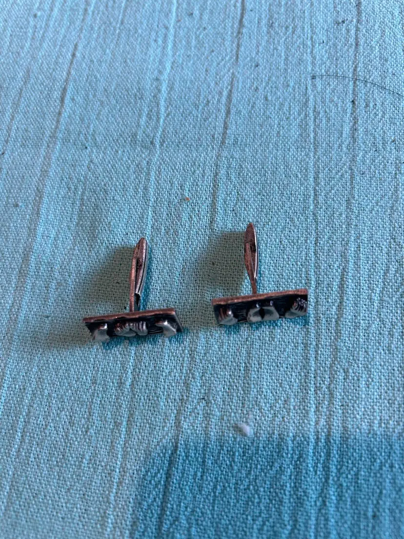 Add a touch of vintage charm to your outfit with these silver tone cufflinks and tie clip on from Pat. The rectangular shape and double button, bullet back style make them perfect for any occasion, whether it be a formal event or a casual day out. The intricate design features a naughty feet theme, making them a unique and playful addition to your collection.