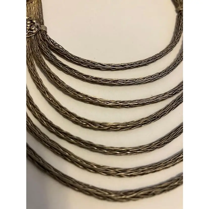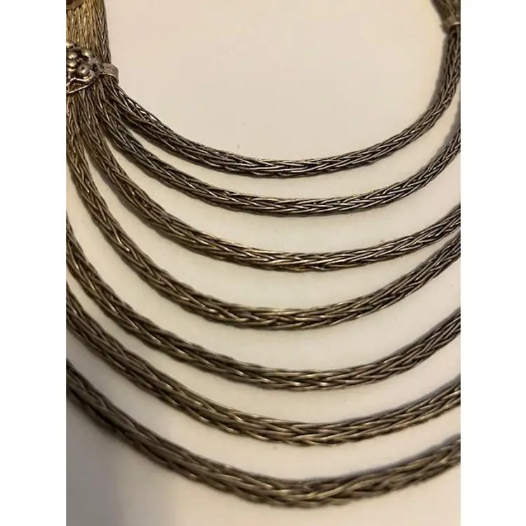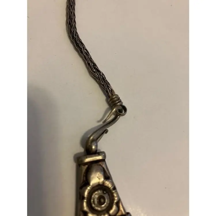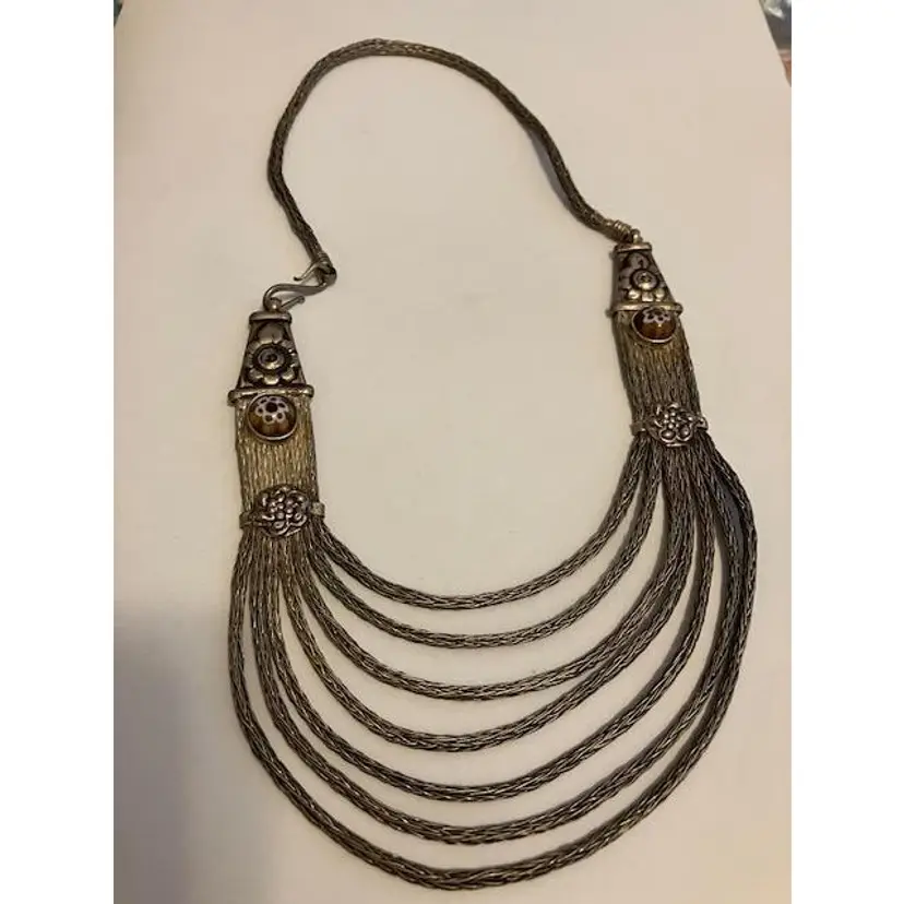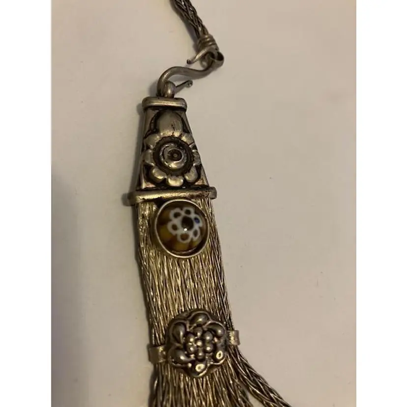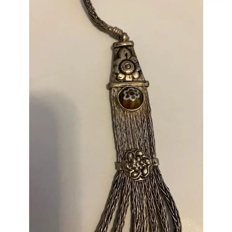 Silver tone snake chain. Silver tone floral accents. Acrylic white and amber colored accents. Measures 19" long. 9 1/2" hang length. Hook closure. Very well made. No marks or signatures. Great condition.