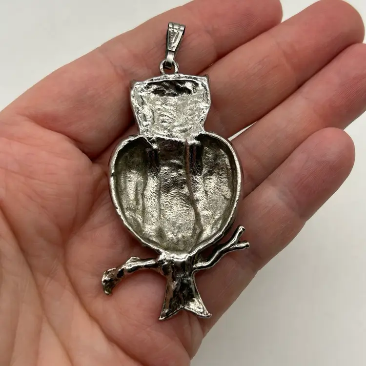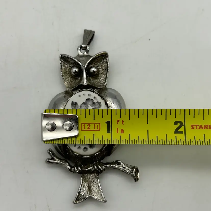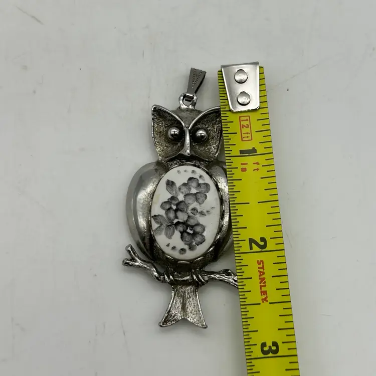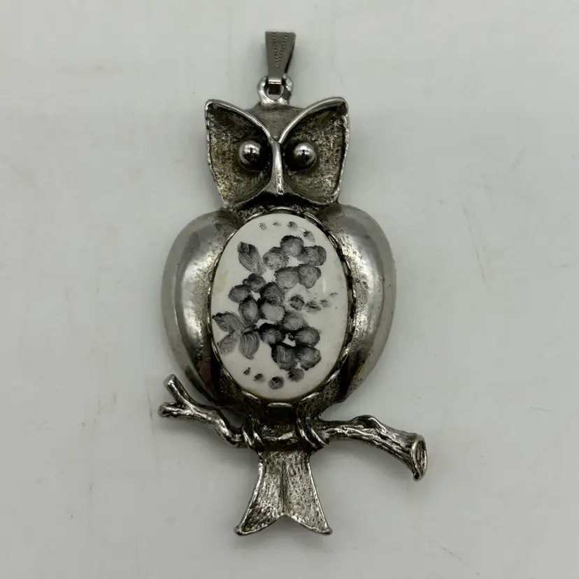 Vintage Silver-tone Owl Pendant Ceramic black and white Floral Accent.