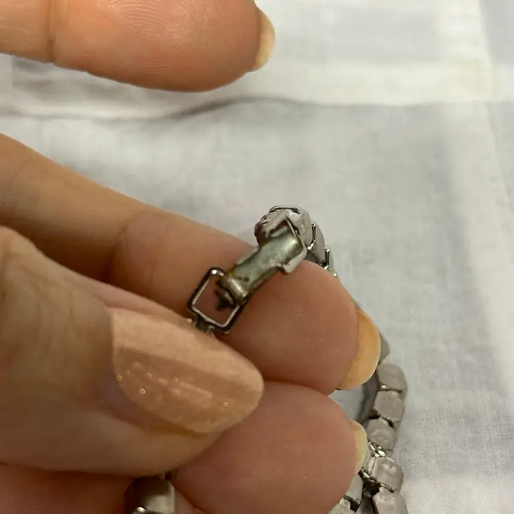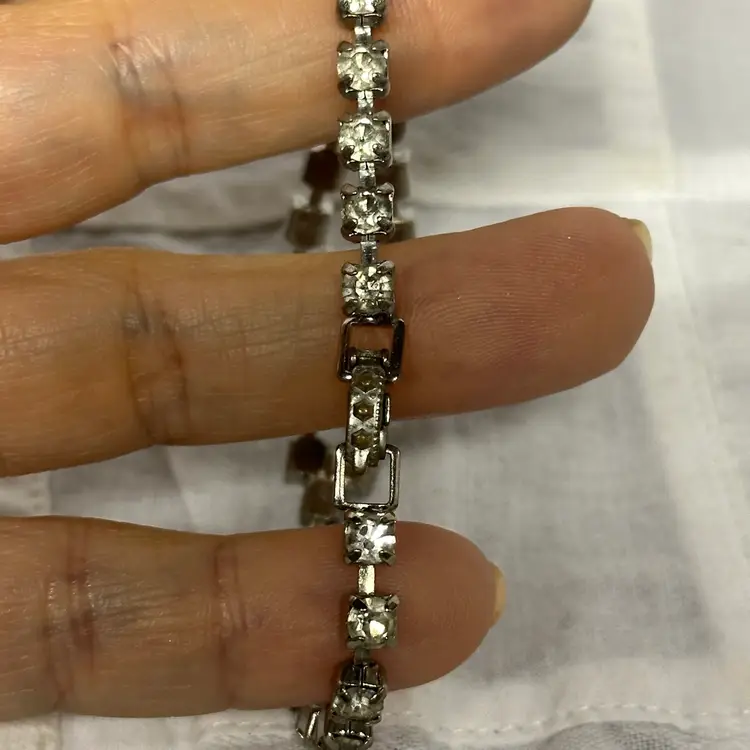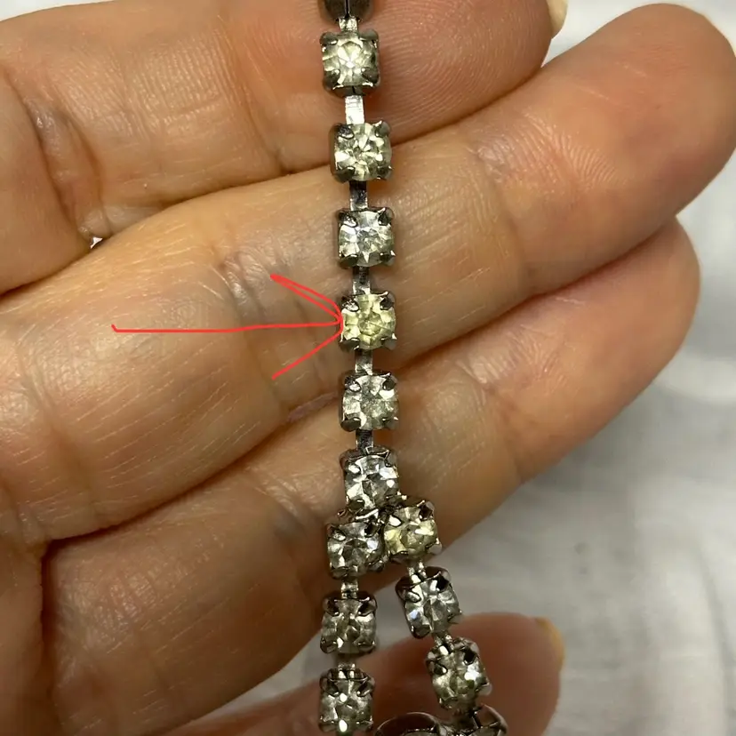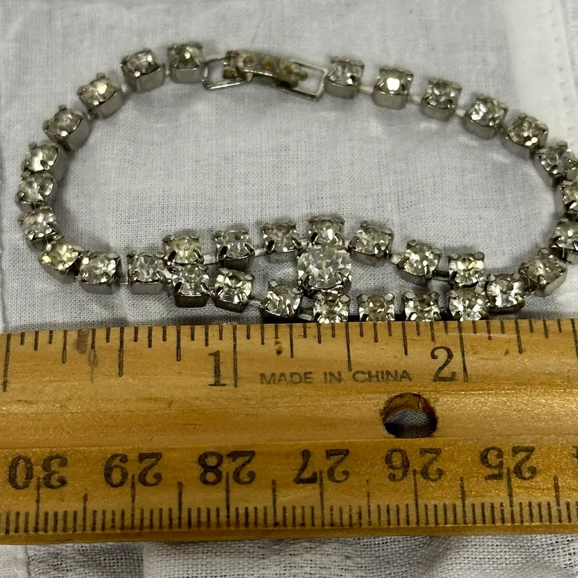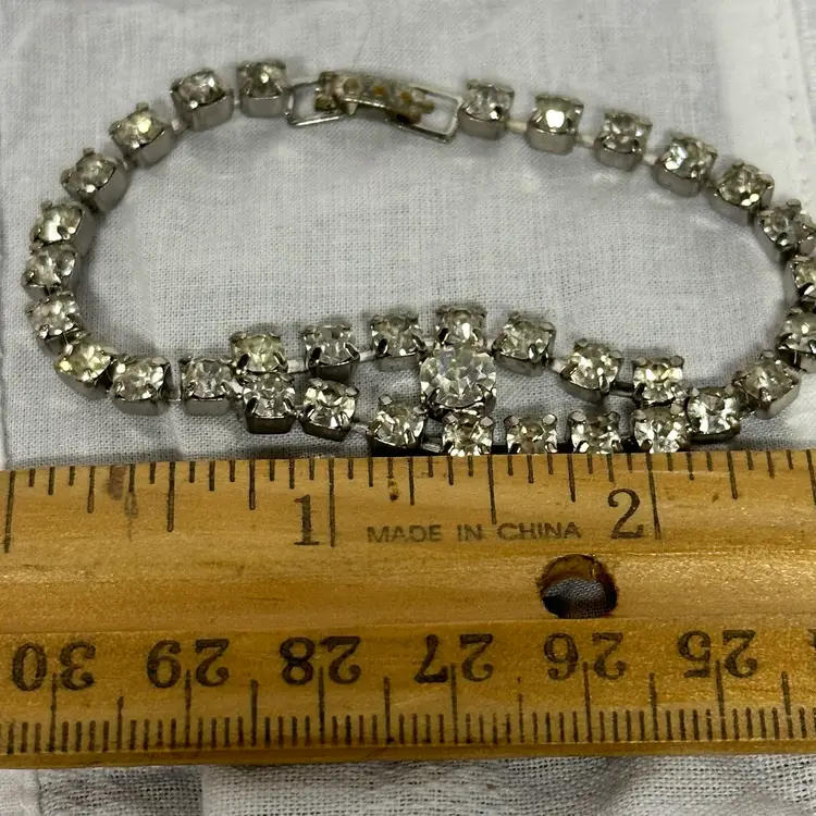 This a beautiful bracelet. One stone is slightly yellowed as shown, however, overall it is in nice condition. Approx. 6 1/2”