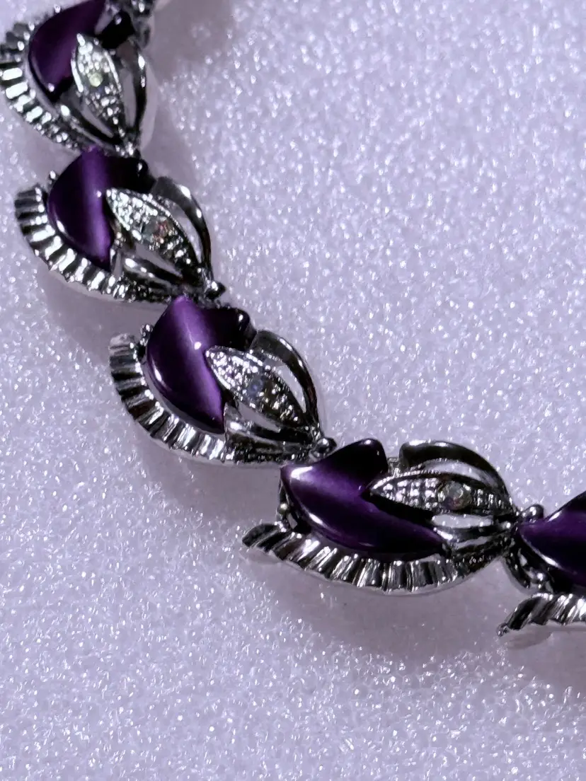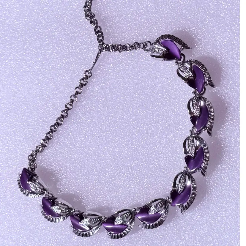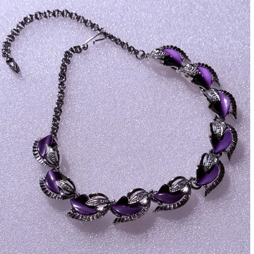 This Thermoset Necklace/Choker Is Approximately 16 Inches. With Purple & Silver Tones As Well As Rhinestones. Please view all photos as this is the piece you’ll be purchasing. Vintage items may have some wear due to age, but this necklace is in good condition. Vintage items are sold as is, unless there is a mistake on my part.