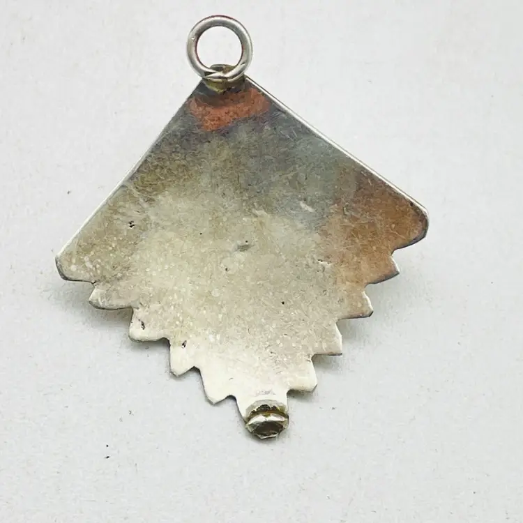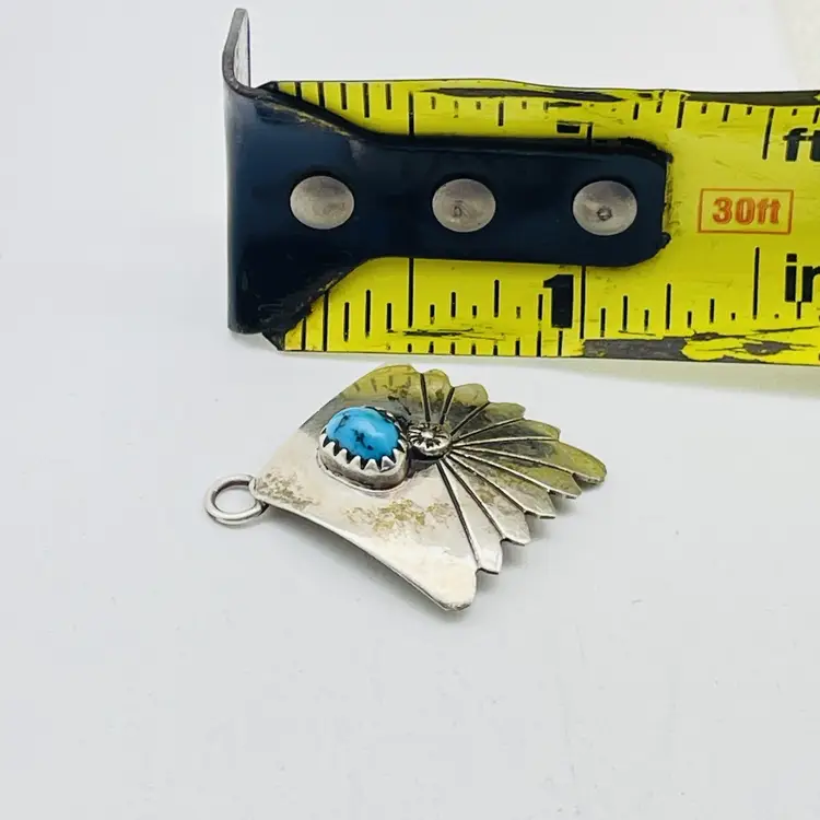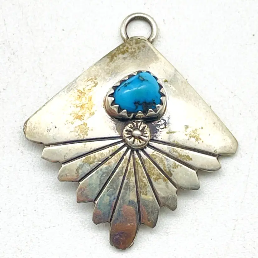 Vintage silver tone pendant featuring a turquoise cabochon set in a fan-shaped design with stamped accents. A bold Southwestern-inspired piece perfect for boho or retro jewelry lovers. Features Silver tone metal pendant Turquoise cabochon stone (simulated or natural, not tested) Fan-shaped design with stamped detailing Southwestern / boho style Pendant size: approx. 1"