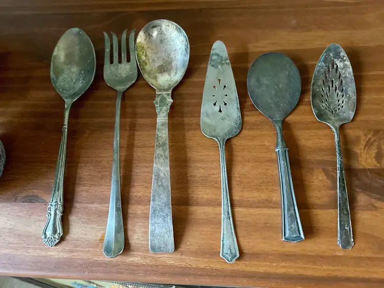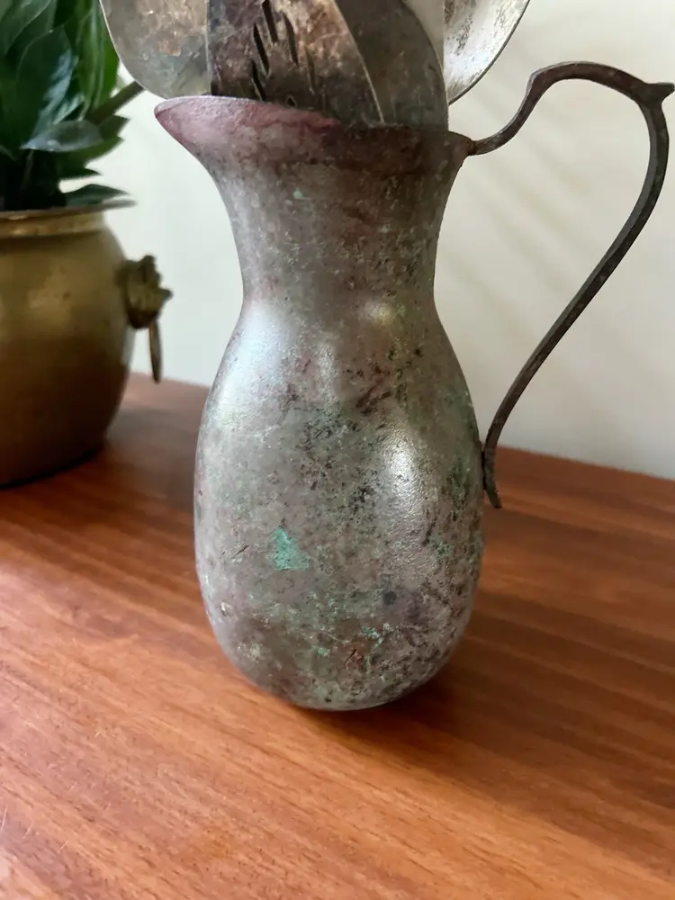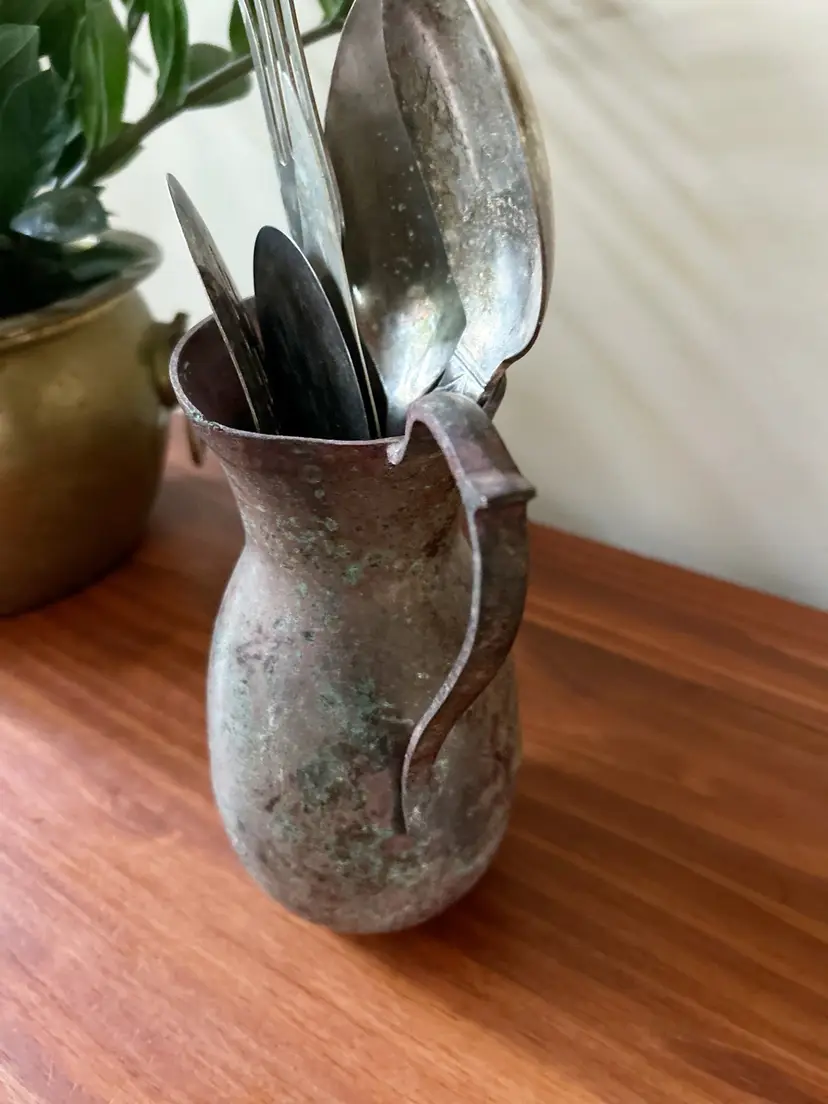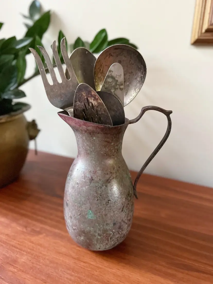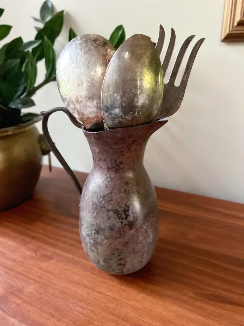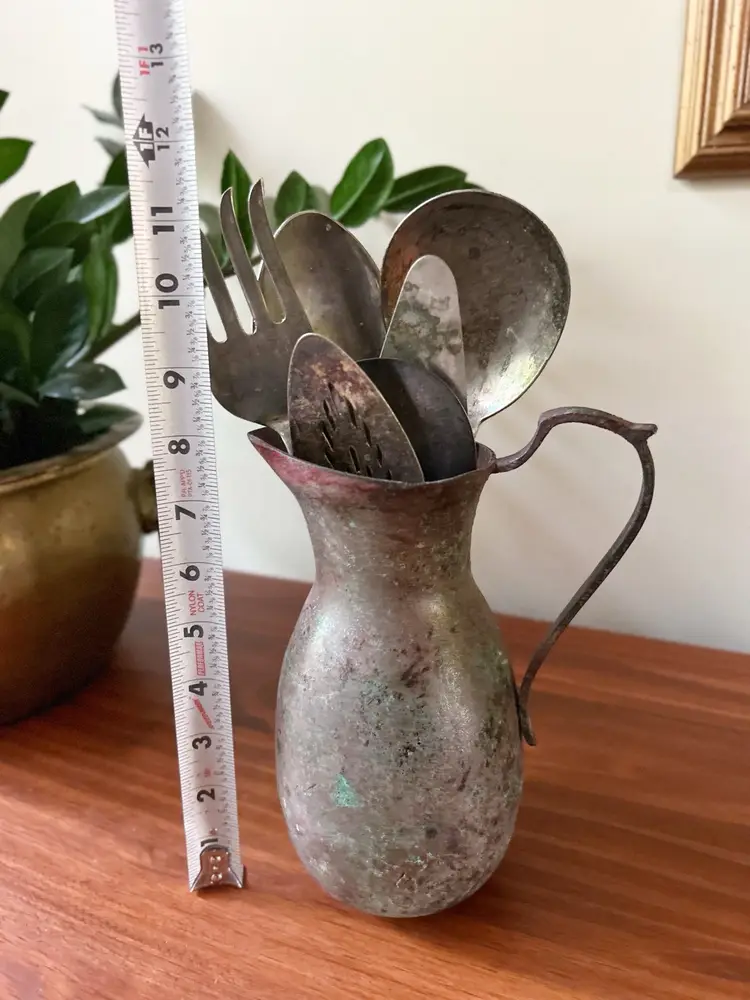 Vintage set of 6 utensils in old pitcher. Measures approximately 11.5 inches tall.
