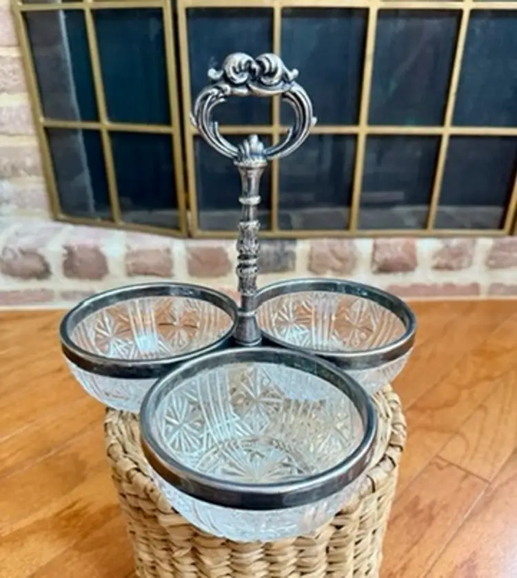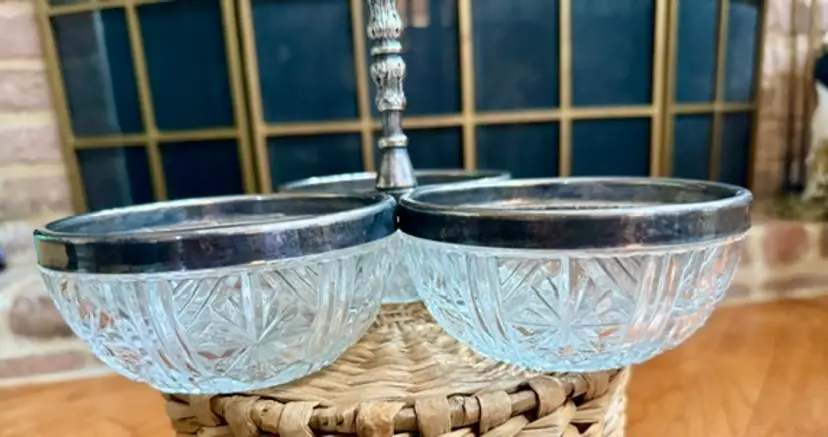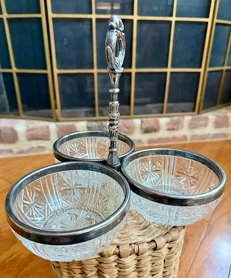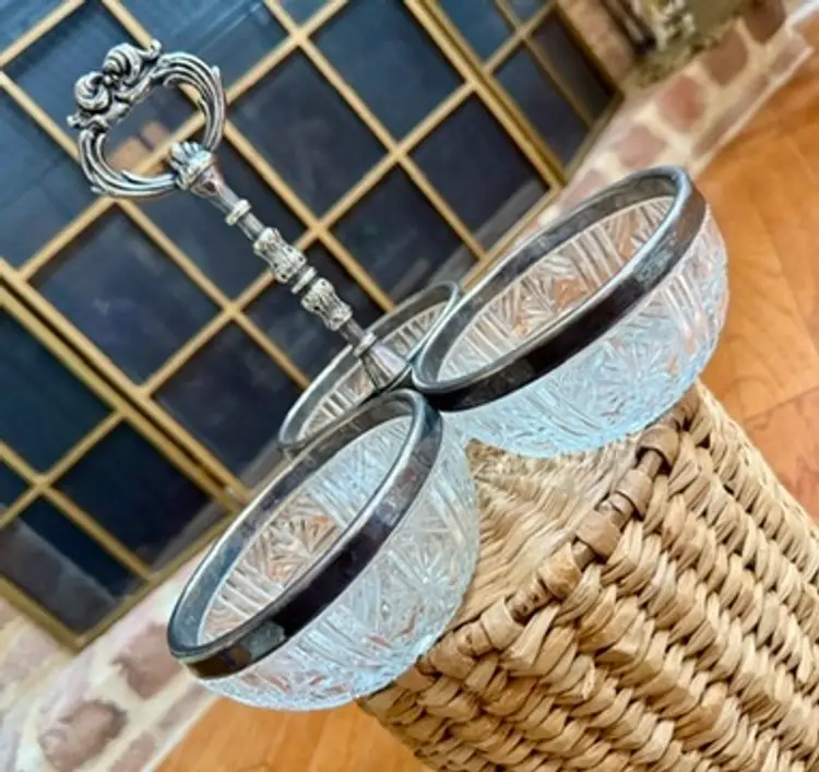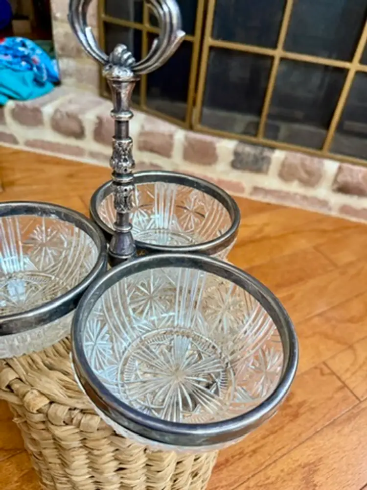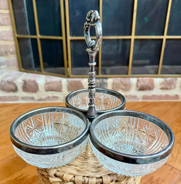 Add a touch of timeless elegance to your table with this vintage three-bowl condiment server. Each clear cut-glass bowl features a brilliant starburst pattern and is rimmed in silver-tone metal, joined by an ornate central handle for easy carrying. Perfect for relishes, nuts, sauces, or candy.