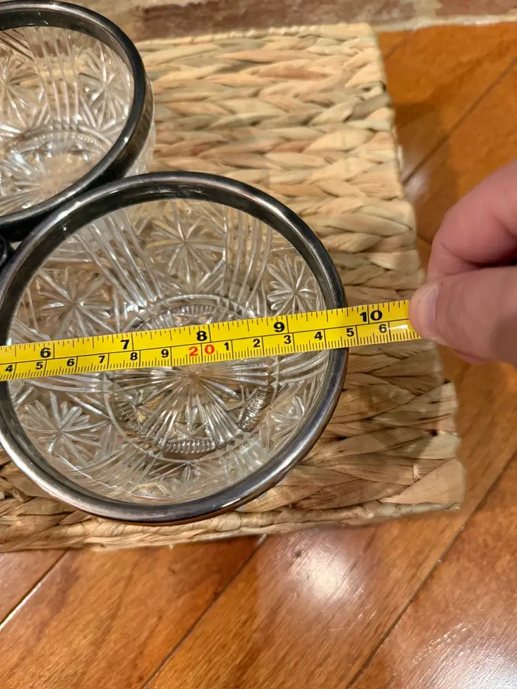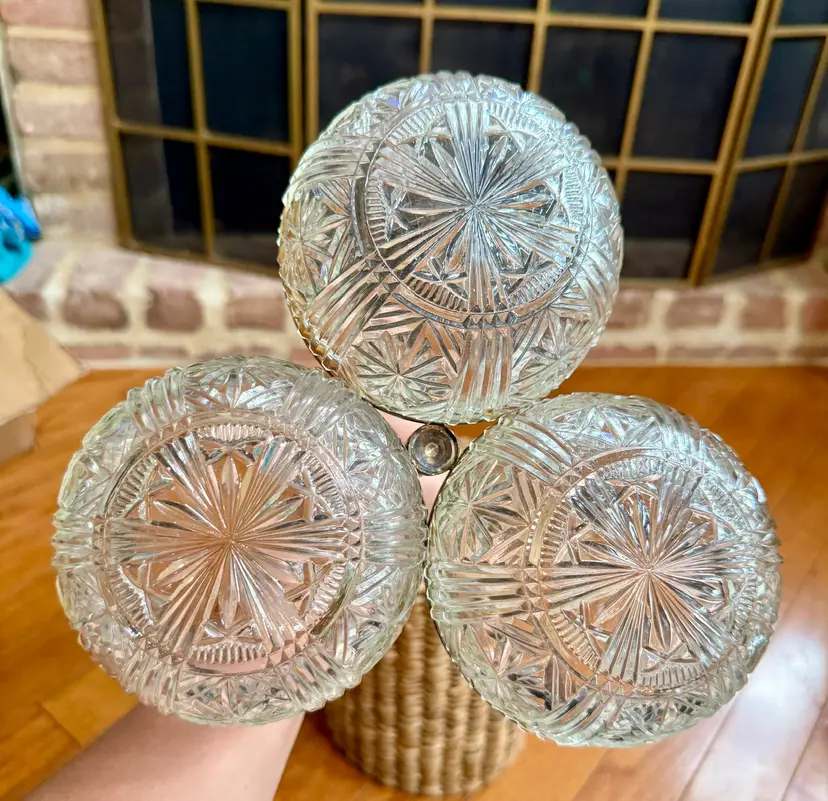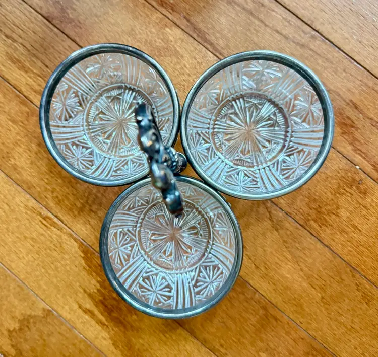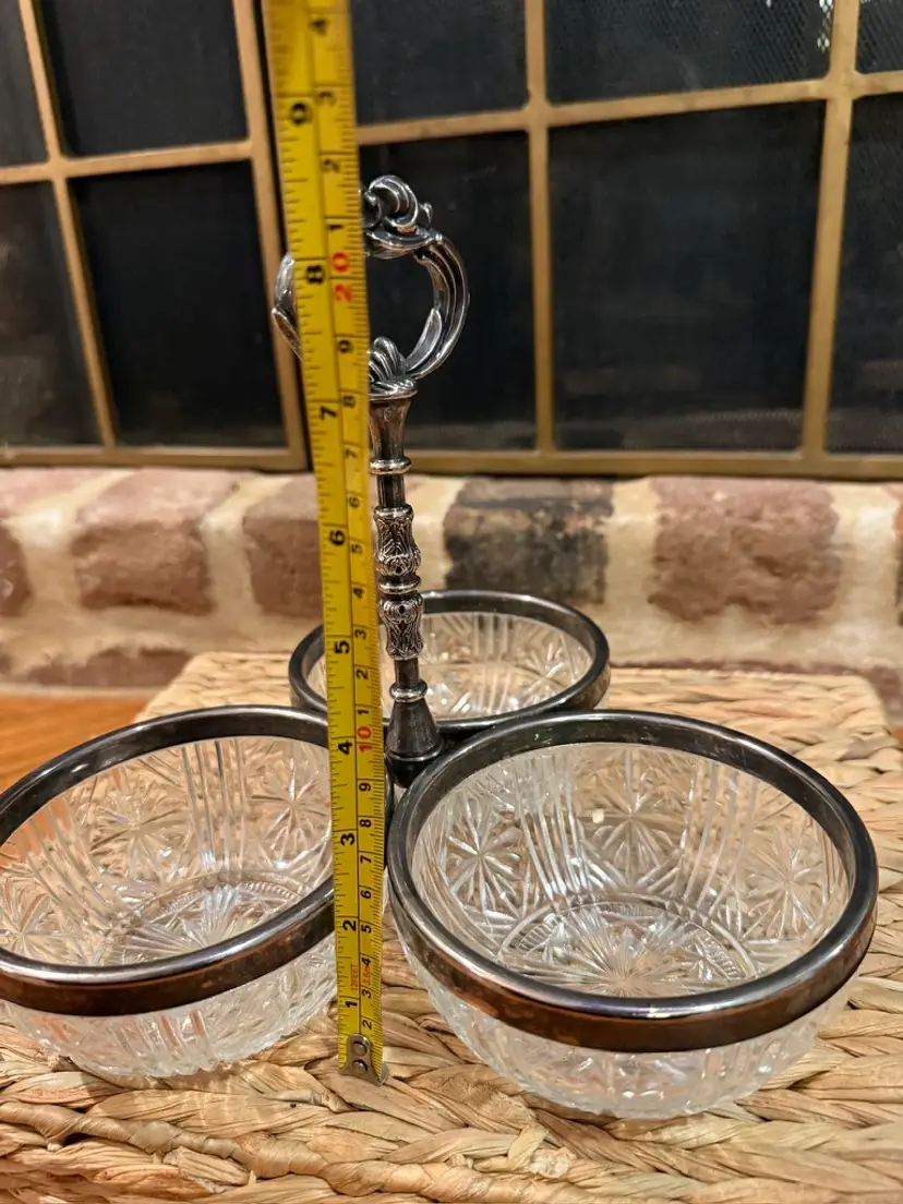 Details Set of three attached glass bowls with silver-tone holder Approx. 7.5″ tall × 8.5″ wide × 4″ deep Each bowl: ~4″ diameter Clear cut glass with intricate starburst design Silver metal rim and decorative handle Good vintage condition – minor patina consistent with age