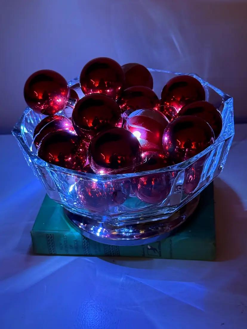 The bowl’s mid-century design combines elegance and versatility — equally at home filled with fresh fruit, ornaments, flowers, or candles. The silverplate base shows light natural patina consistent with age, confirming its genuine plating (not chrome). The glass is clear and bright with no chips or cracks.