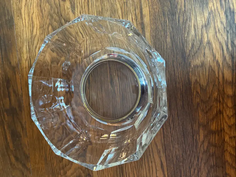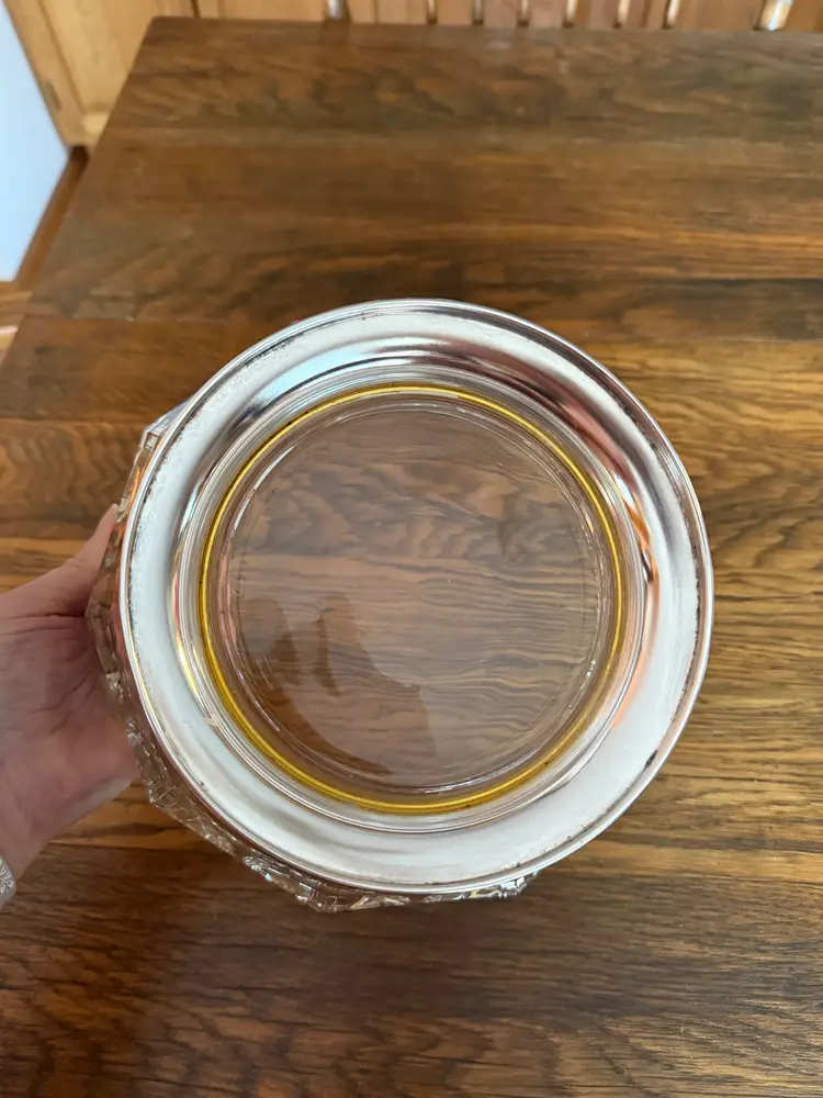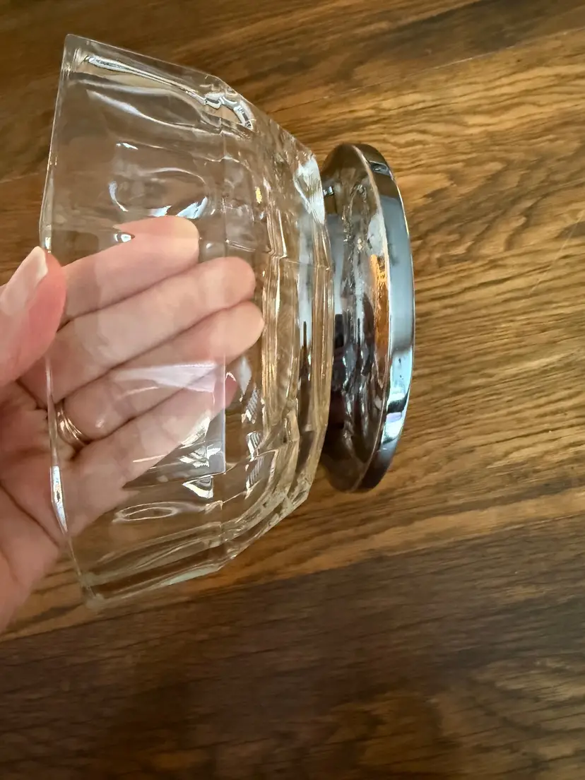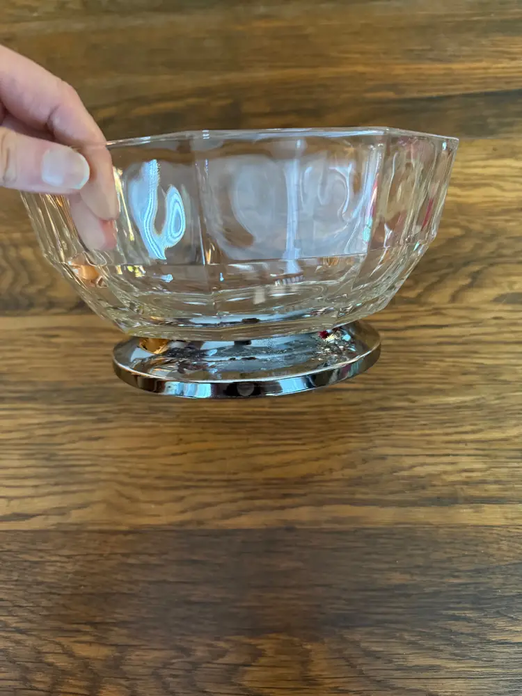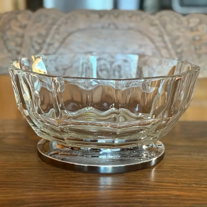 This beautiful vintage glass centerpiece bowl from Paige’s Plates features sparkling pressed glass with a geometric paneled design and a gleaming silver-plated footed base. Measuring approximately 8.5 inches wide and 4.5 inches tall, it’s the perfect size for fruit, salad, or decorative display.