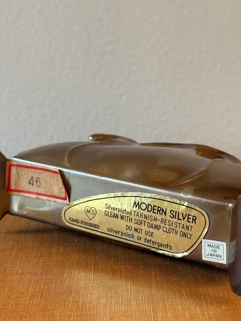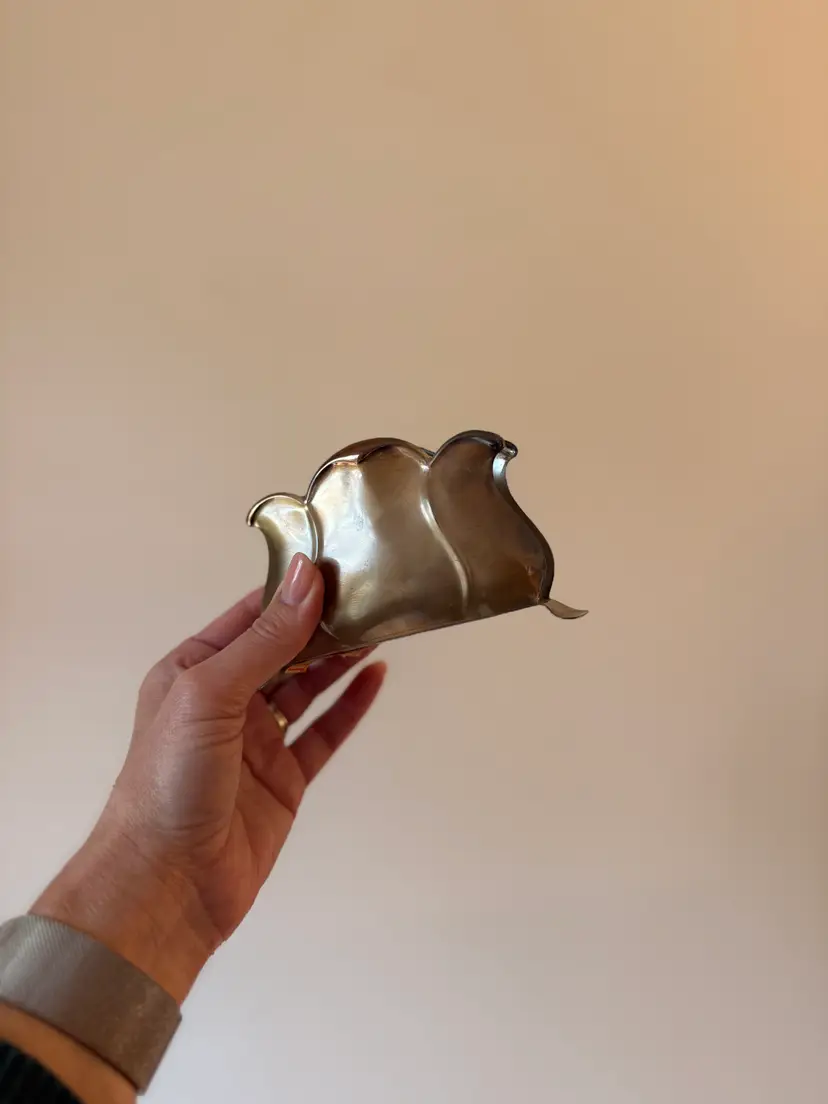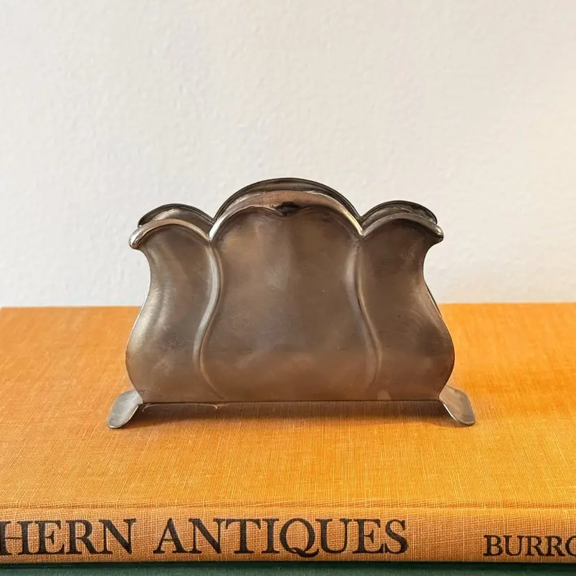 Charming silver-plated napkin or mail holder with a tulip-shaped design. Marked Modern Silver – Made in Japan. Tarnish-resistant finish with natural vintage patina.