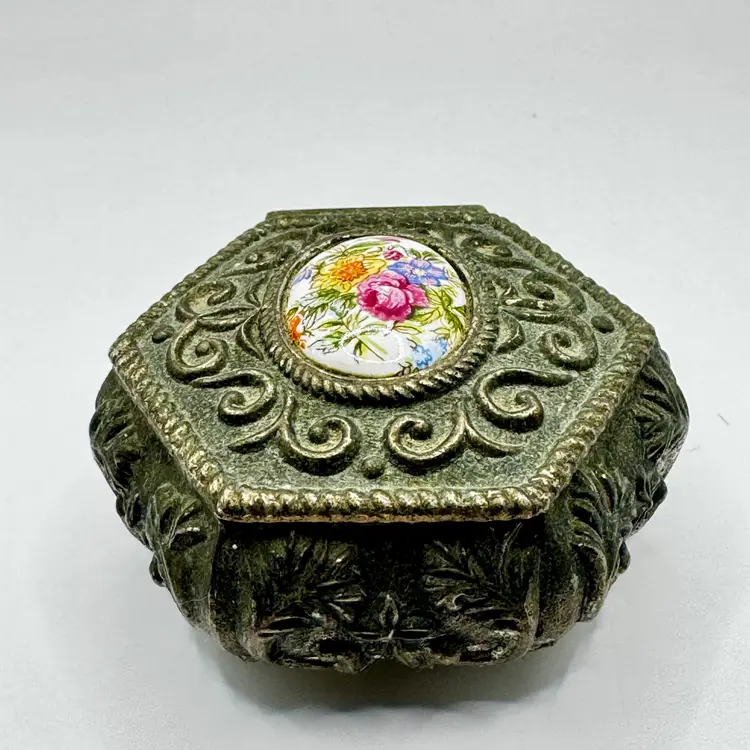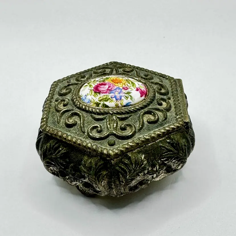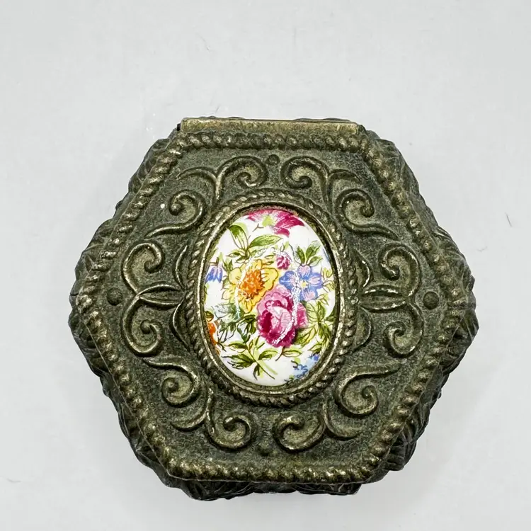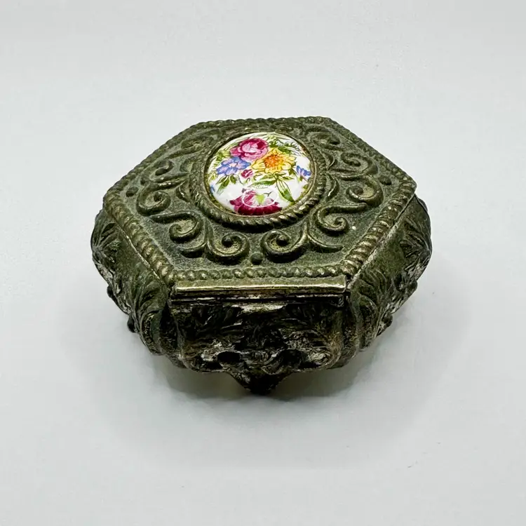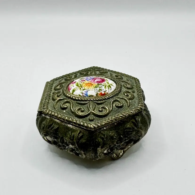 Gorgeous trinket box with hand painted floral cameo. No chips or cracks. Measures 3” Weights 6oz