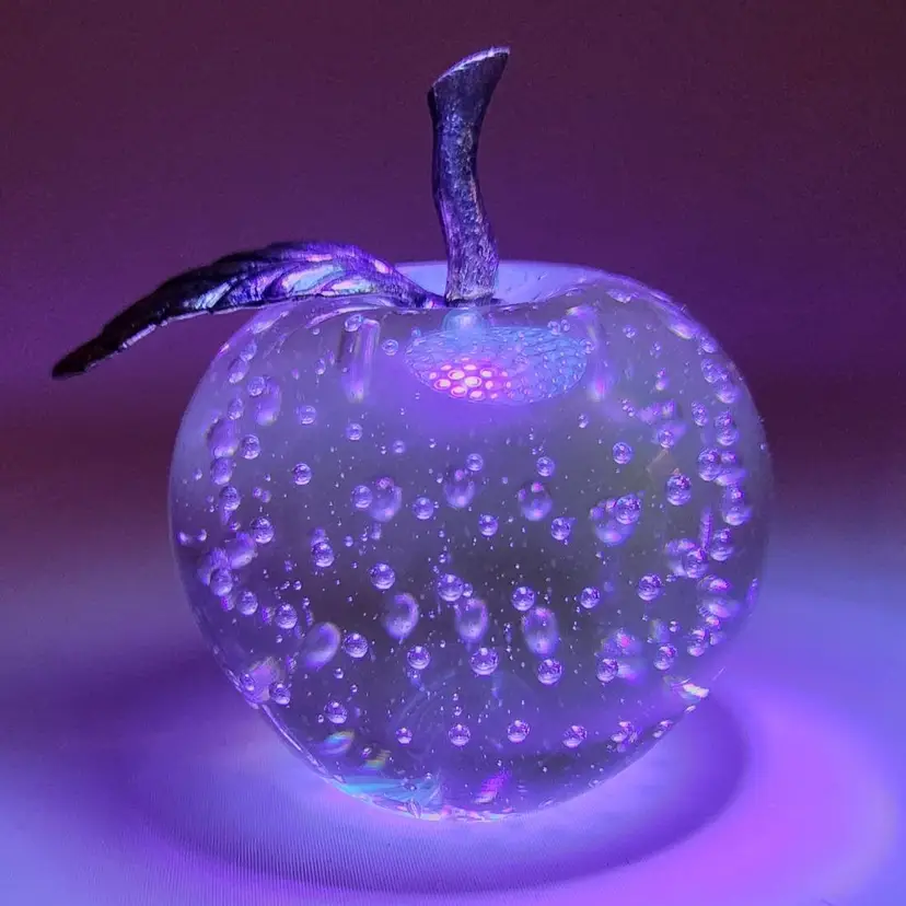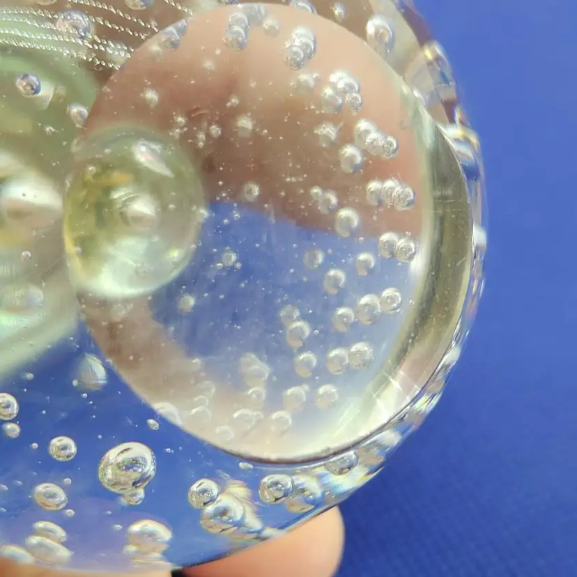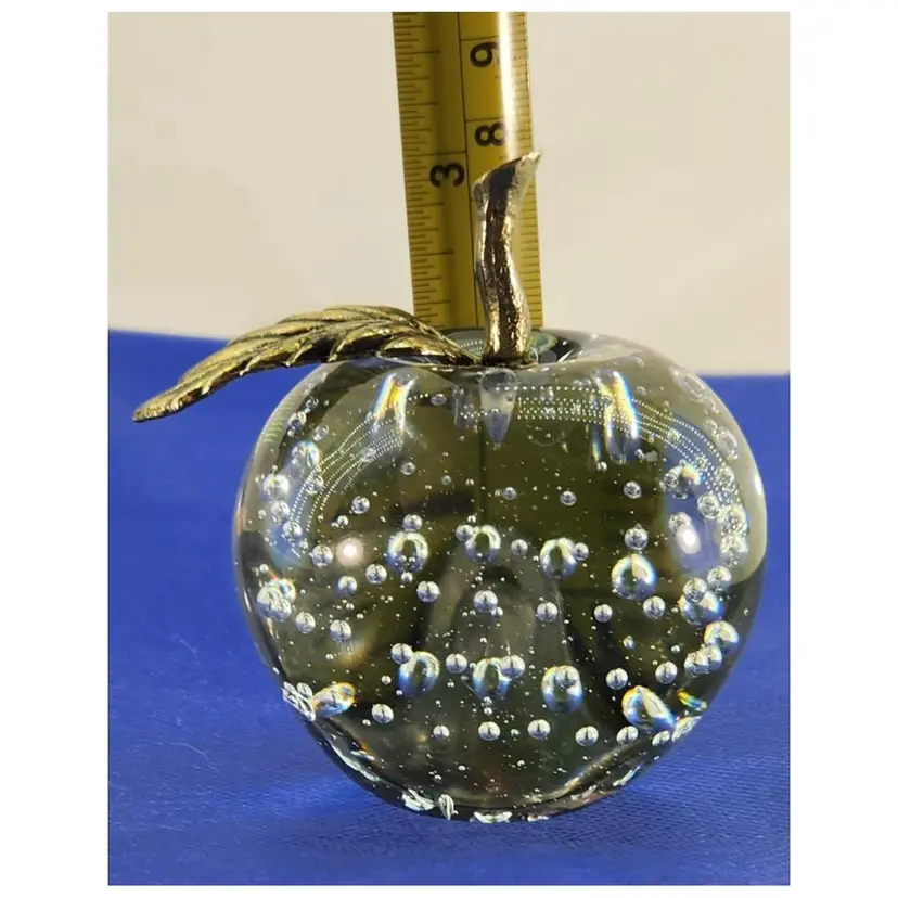This is made in Taiwan from a company called Silvestri. It's hard to see in the photo but it does have a slight green glow under black light. The brass stem is a bit tarnished, but there are no chips, cracks or flea bites in the glass.