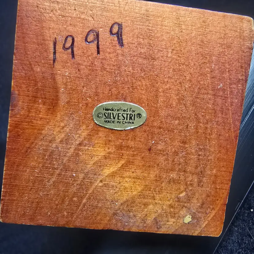 Celebrate the season with this vintage Silvestri pine-cone body Santa figurine. Crafted with a wood base and adorned in a felt coat and hat topped with pine-cone & greenery accents, this Santa stands just under 8″ tall and brings rustic holiday charm to any display. The underside label reads “Handcrafted for Silvestri® Made in China”.