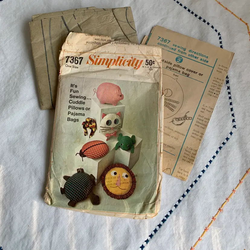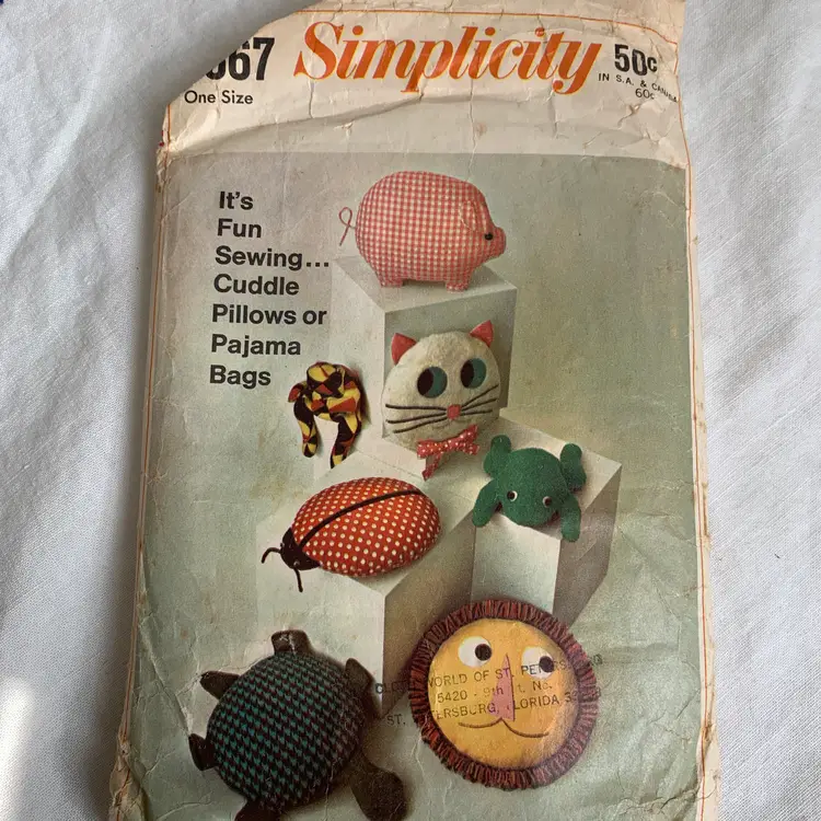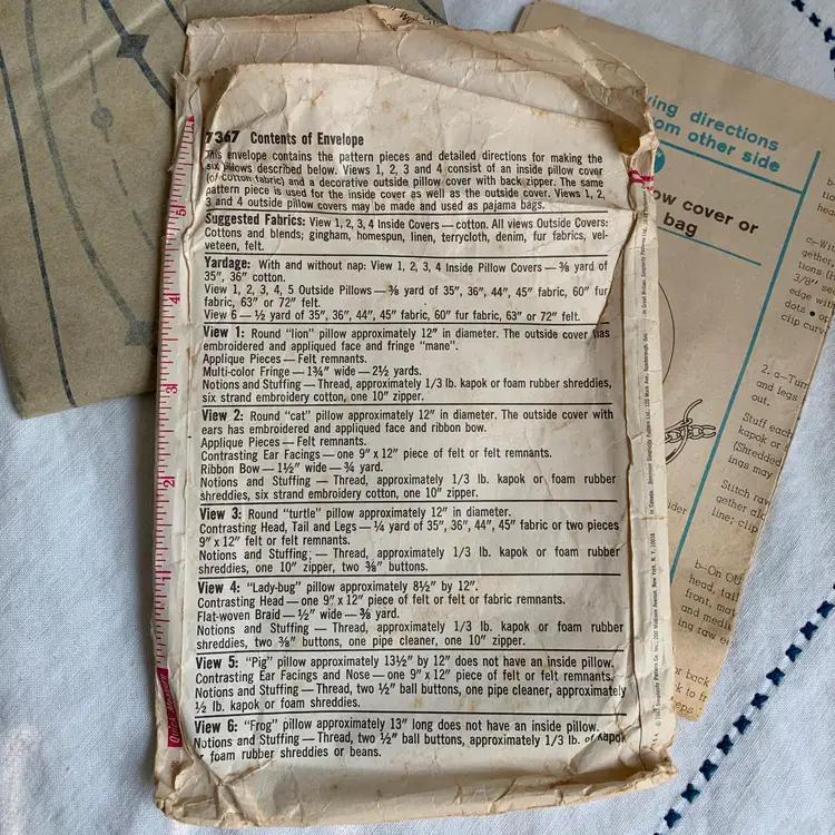 This vintage pattern contains instructions and patterns for 6 whimsical animal pillows/pajama bags. Zipper back. Requires sewing, applique and stitchery. All patterns uncut except for the frog. Envelope in delicate condition and has tears on flap, sides and corners. Pattern pieces good. Pattern # 7367 Simplicity 1967. I have made many of these thru the years, this is not my original pattern.