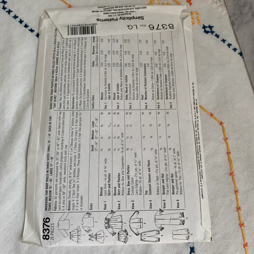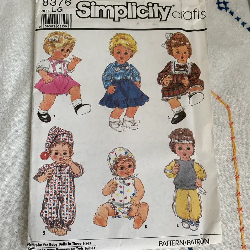 Great pattern for baby doll wardrobe to sew from the 1987. Includes patterns for 6 outfits from sleepy time to Let's Get Physical! Uncut. Fit dolls S 13-14" Medium 15-16' Large 17-18". Pattern envelope in very good condition.