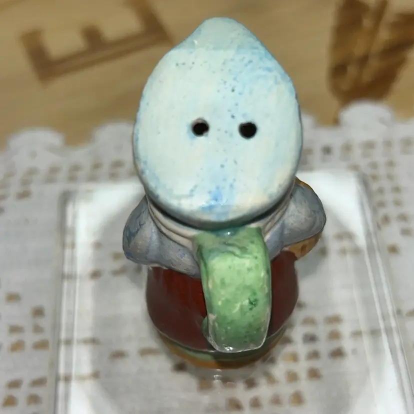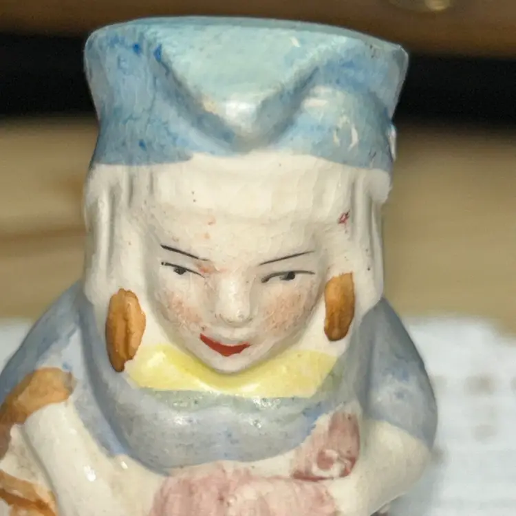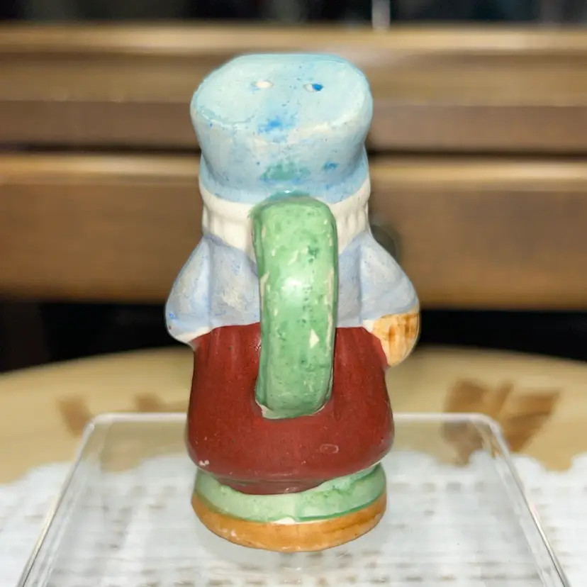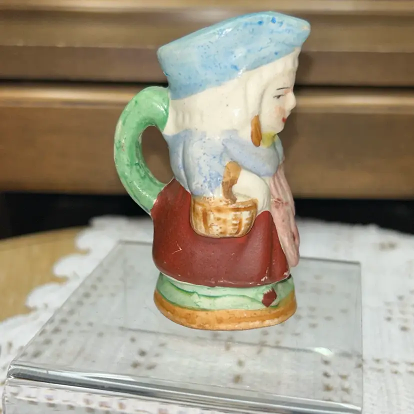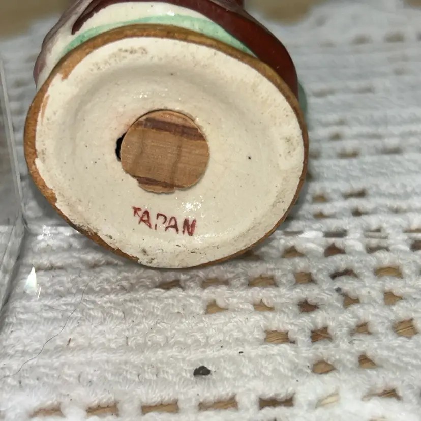 Made in Japan. Stopper present. 2.25” tall, 1.5” diameter bottom. Handle on back. Some cold paint wear. No chips or cracks.