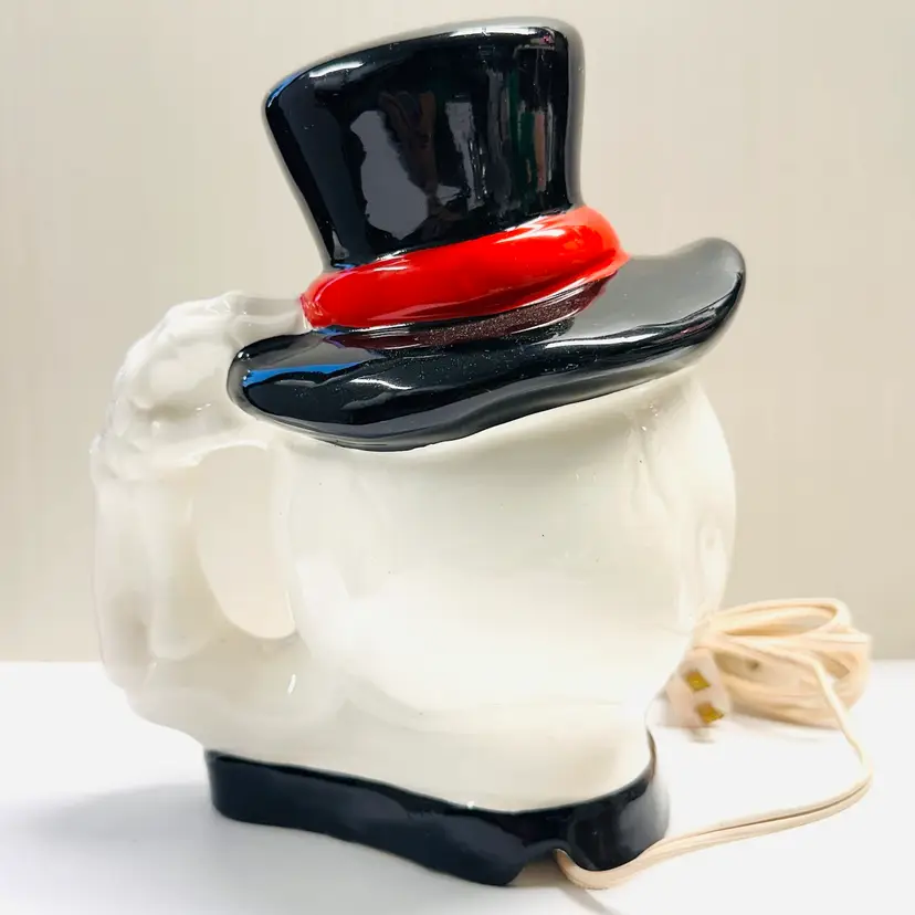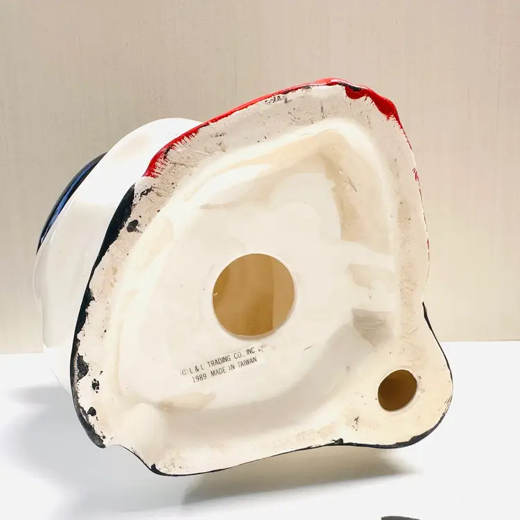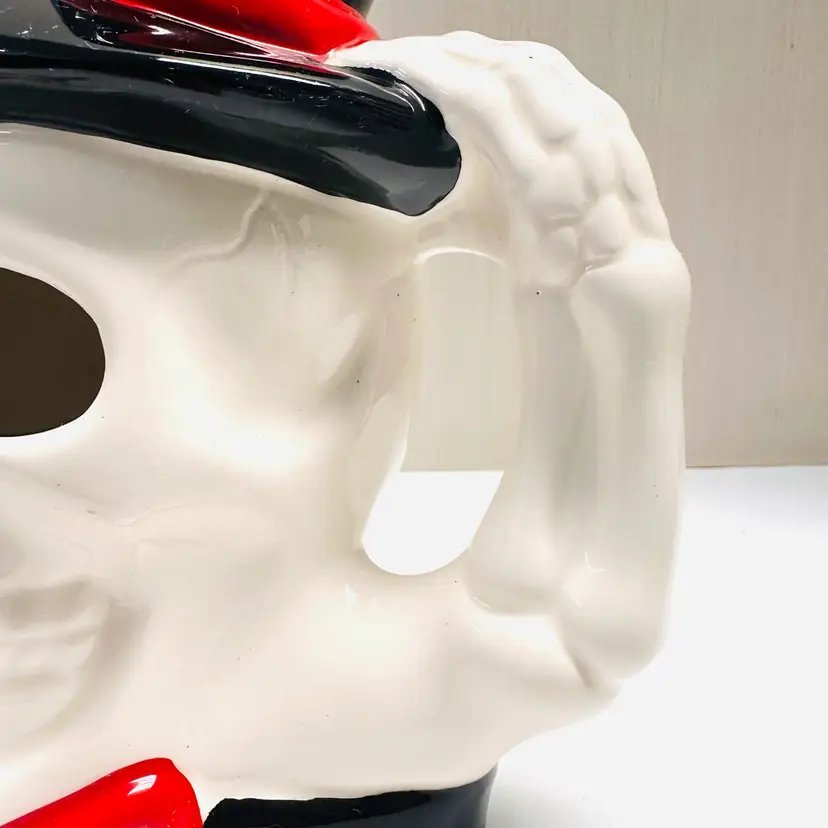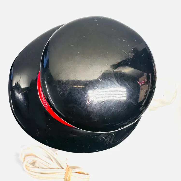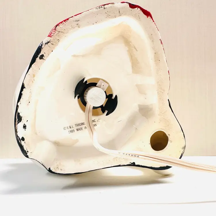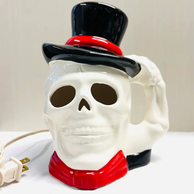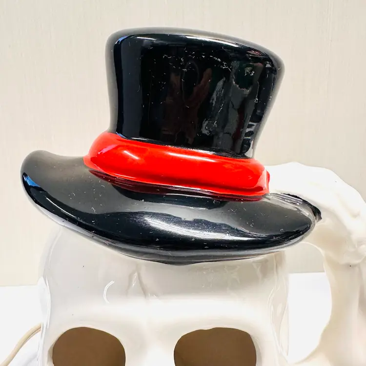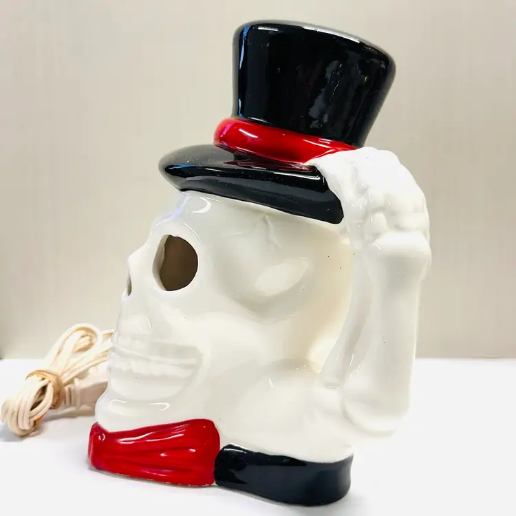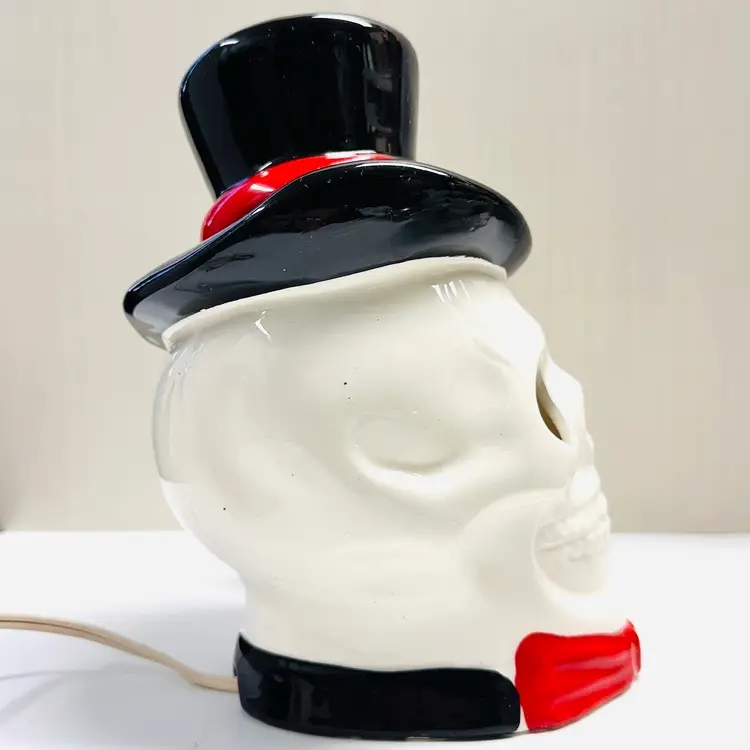Previously owned Skull wearing black top hat and red bow tie lamp. Made in Taiwan. Please note that this does not come with light bulb.