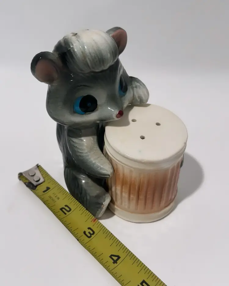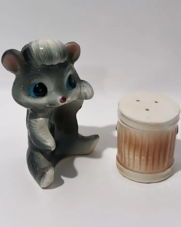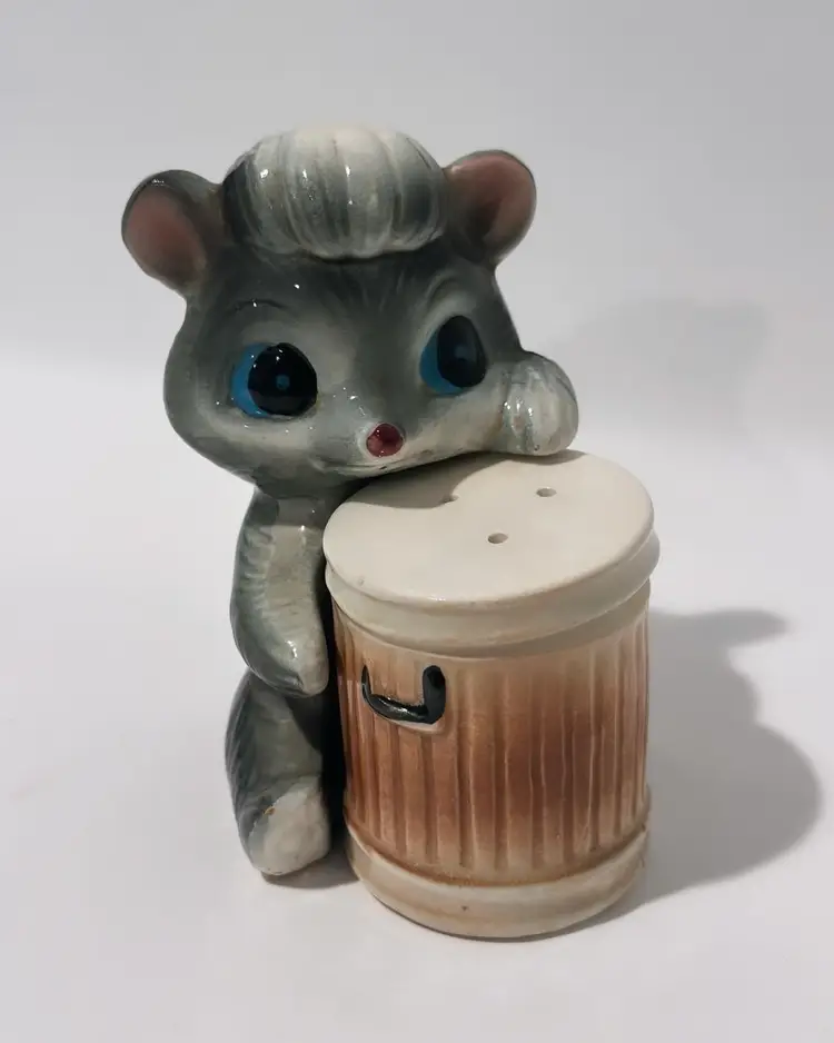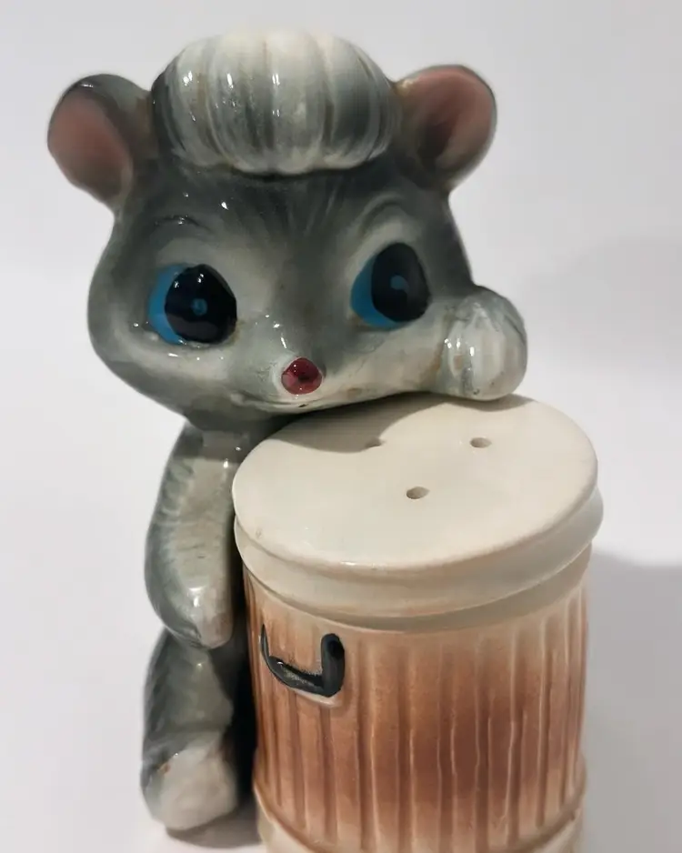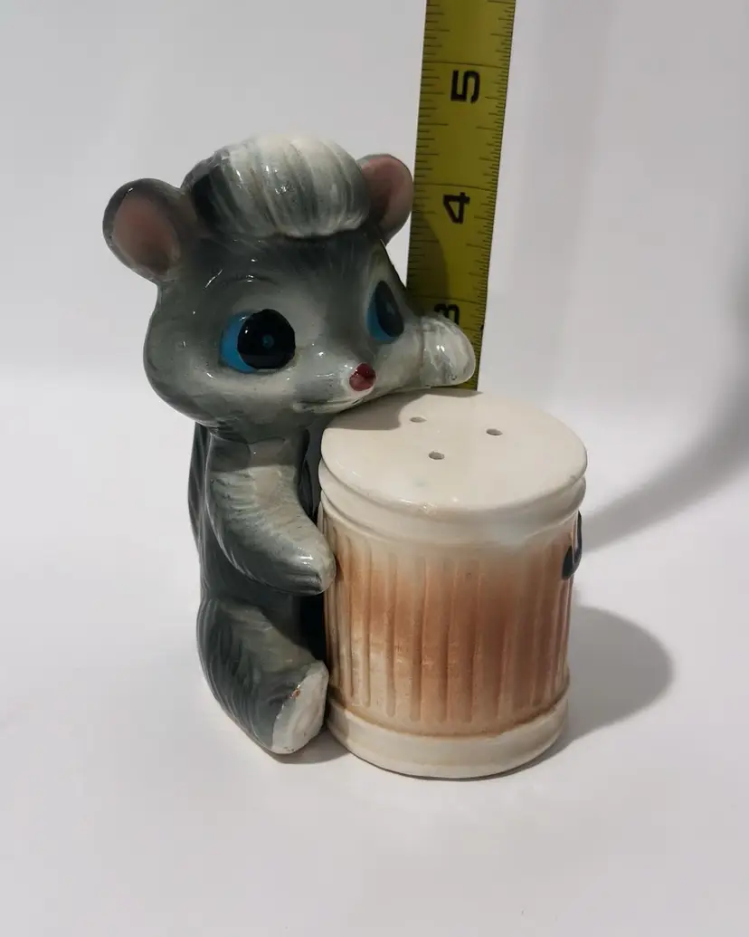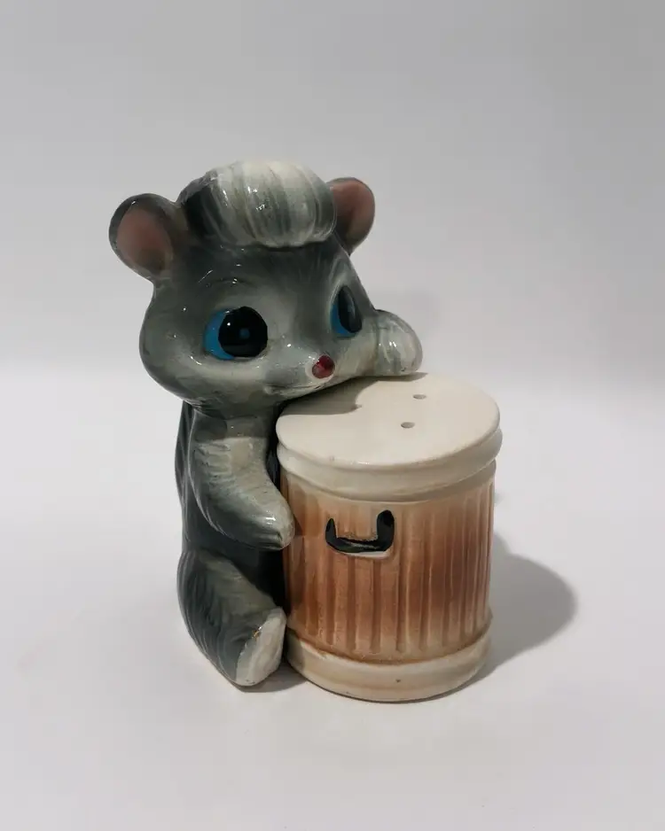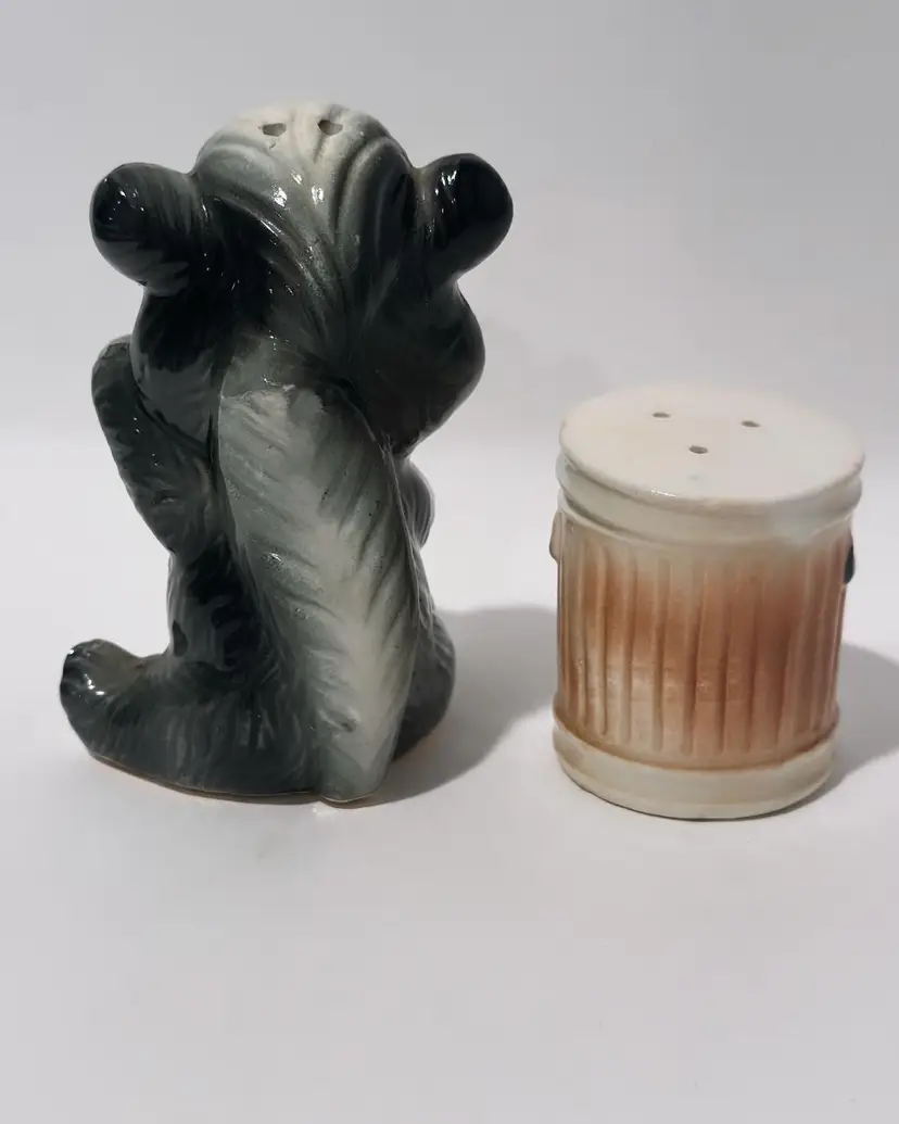 Add some playful charm to your kitchen or dining room with these vintage skunk hugging trash can salt and pepper shakers. Made in Japan, these collectibles are perfect for all occasions and feature a colorful design that will brighten up any table setting. The set includes a pepper shaker and a salt shaker.