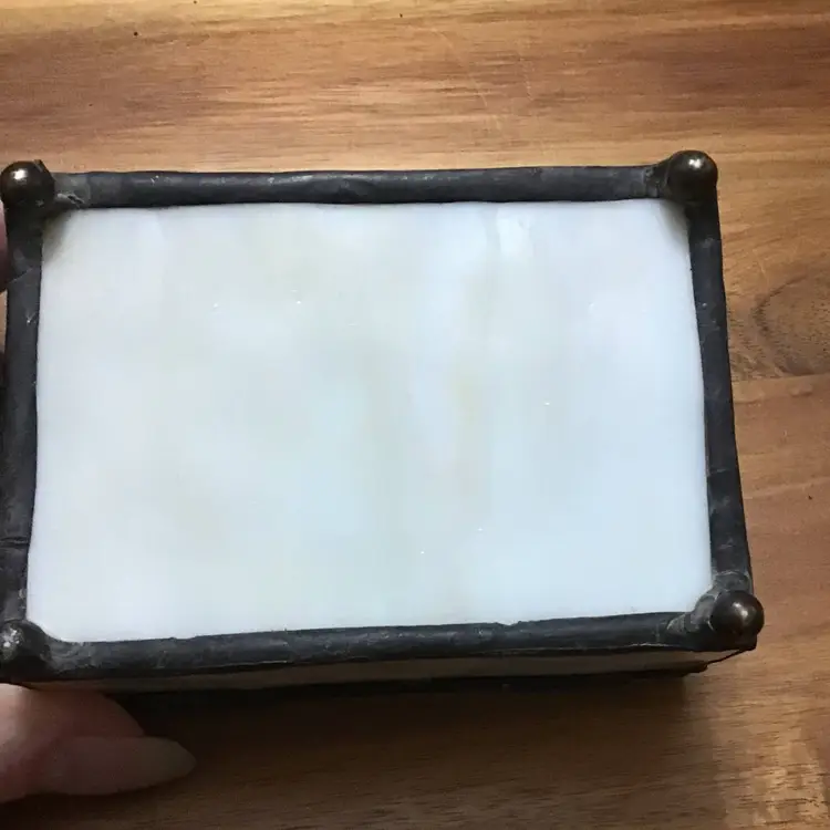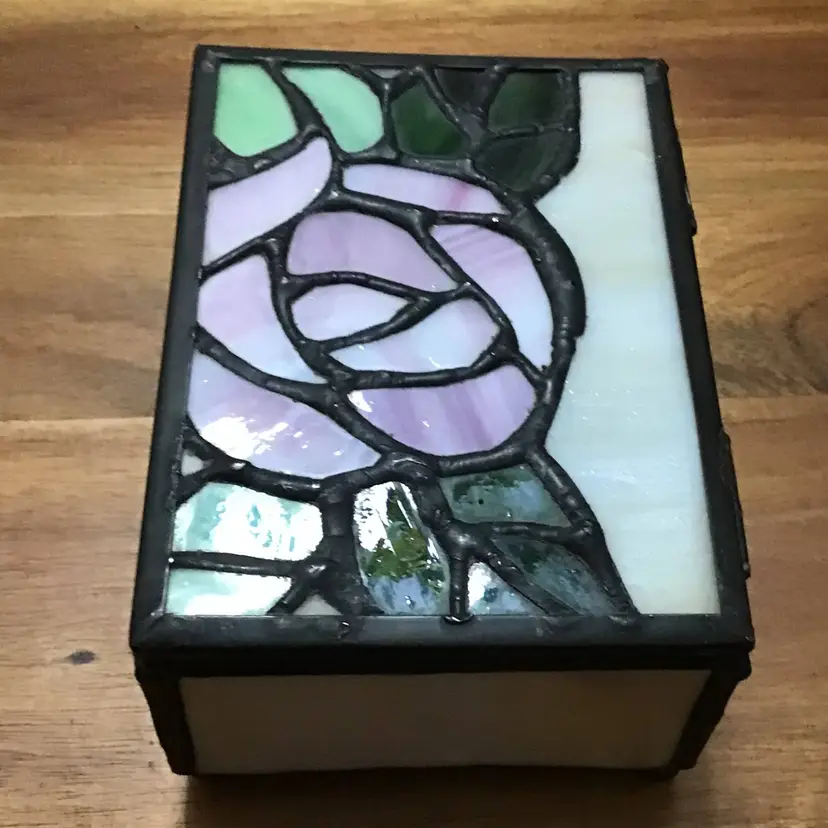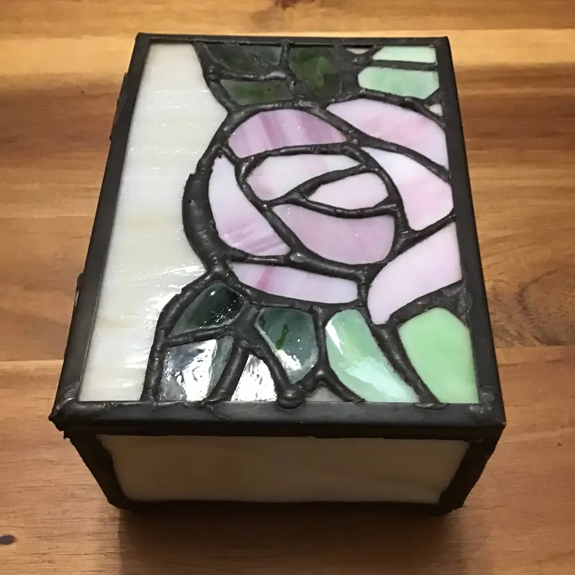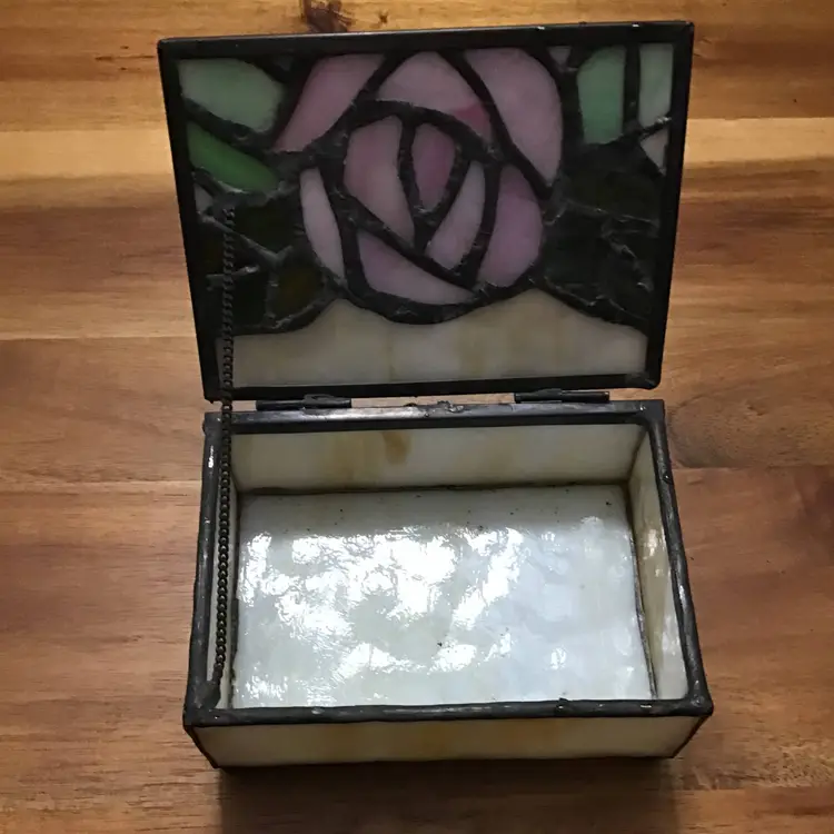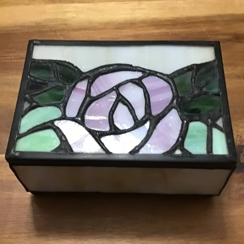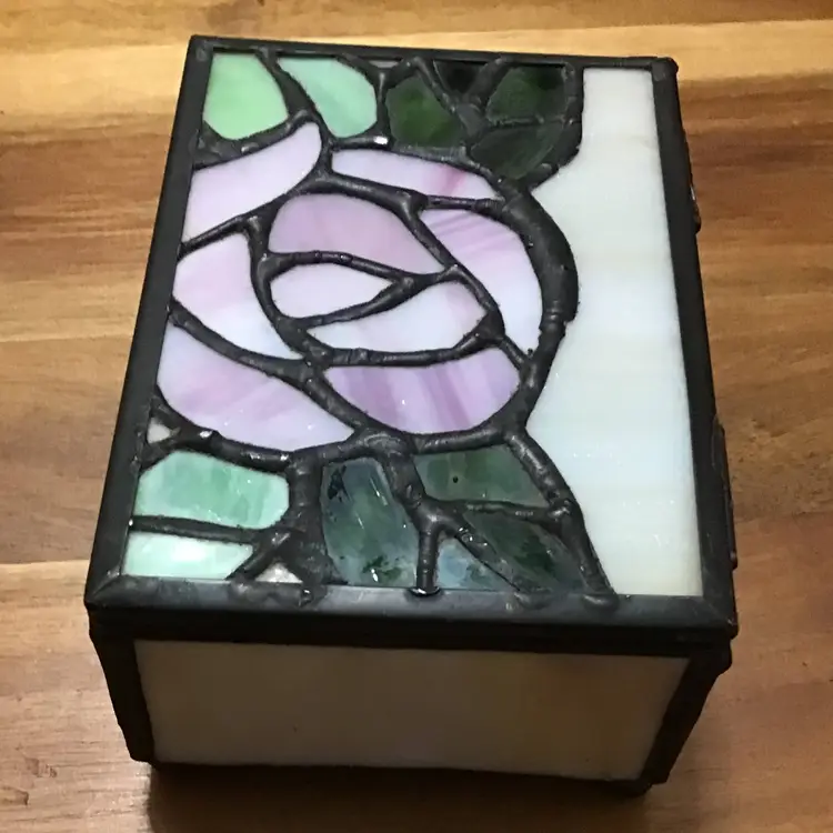 Vintage Slag Stained Glass Trinket Hinged Jewelry Box Pink Rose Design Rectangle This vintage trinket box is a unique addition to any room. The beautiful pink rose design is made of stained glass and features a hinged lid. Measuring 4 inches in length, 3 inches in width, and 1.5 inches in height, it is the perfect size for storing jewelry or trinkets. Handmade with care, this keepsake trinket box will add a touch of art to your collection. The glossy finish and rectangular shape make it a versatile item that can be placed in any room. Whether you're a teen, adult, or girl, this trinket box is suitable for all occasions.