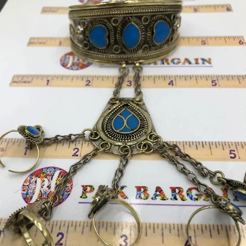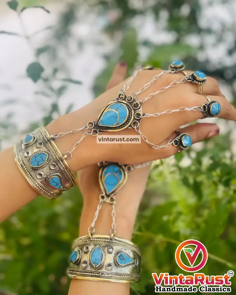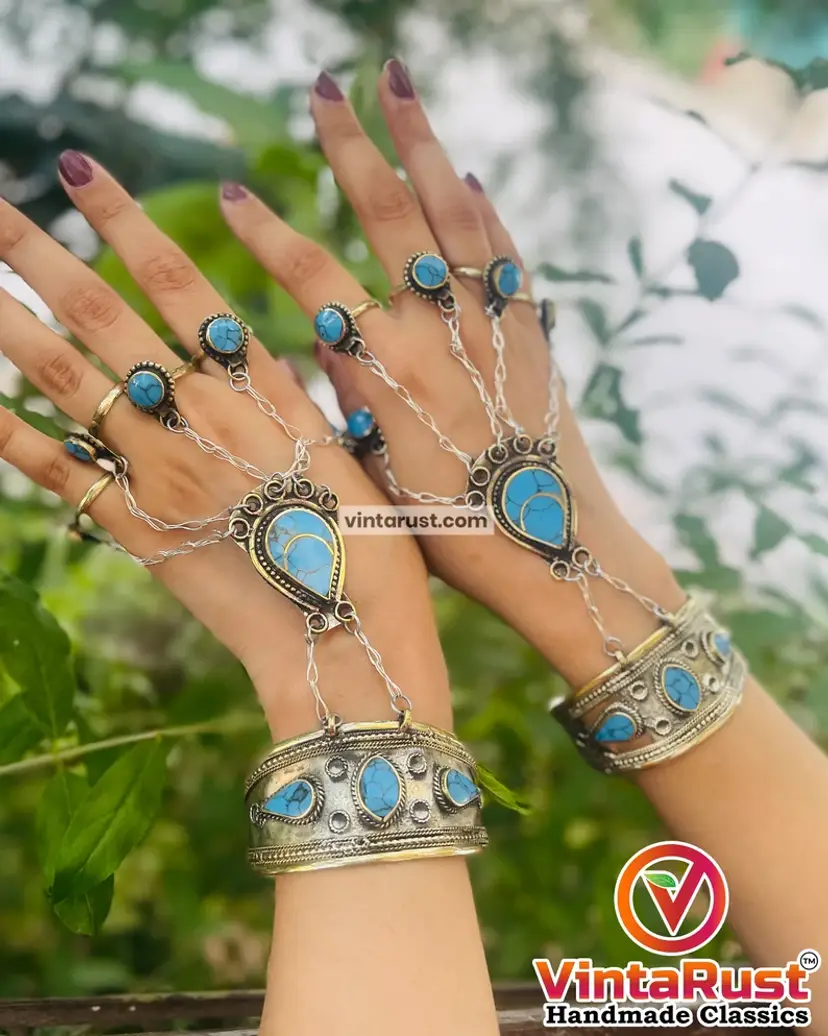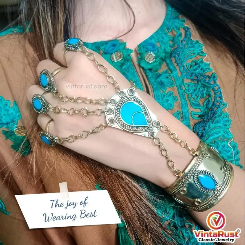 The ethnic turquoise stone embedded hand piece is a beautiful silver oxidized jewelry piece. The commendable design has five rings and a bracelet attached at the other end.