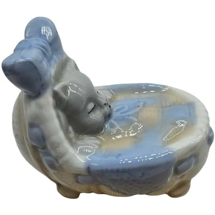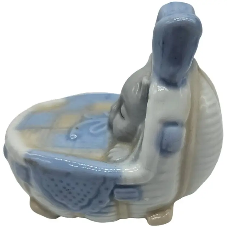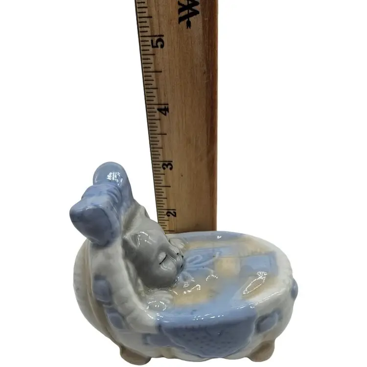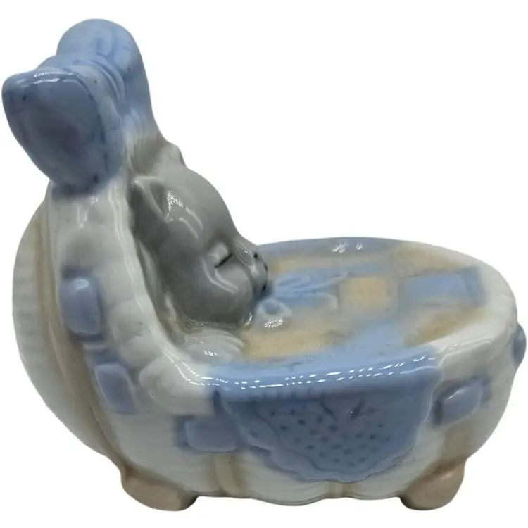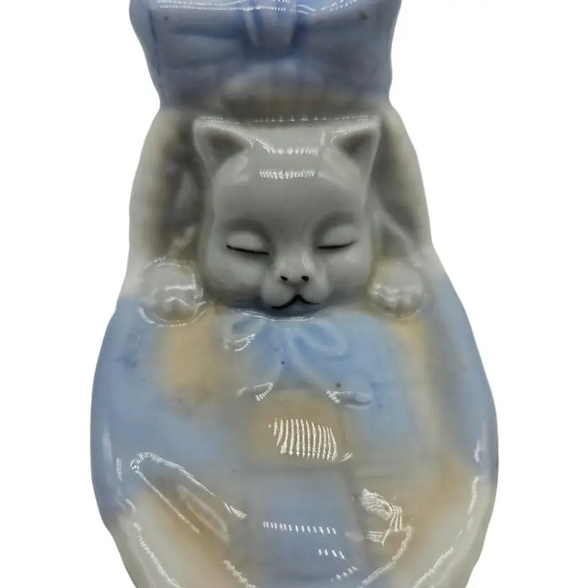 Adorable vintage ceramic figurine featuring a sleeping kitten in a cozy basket. Perfect for cat lovers and collectors of charming critters. Excellent condition with lovely pastel colors.