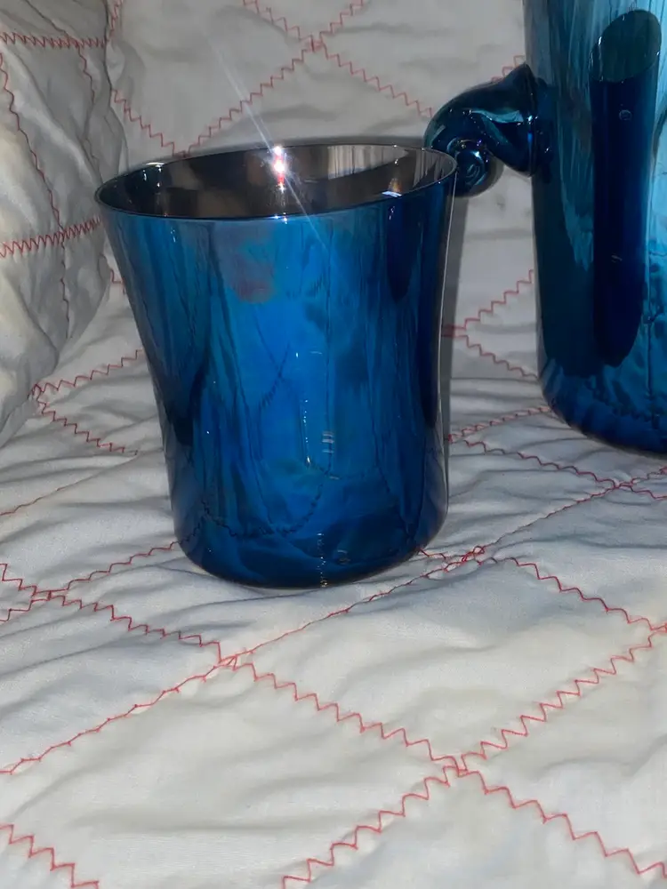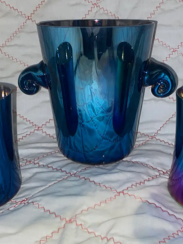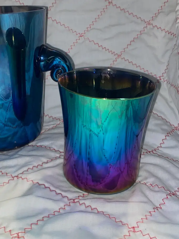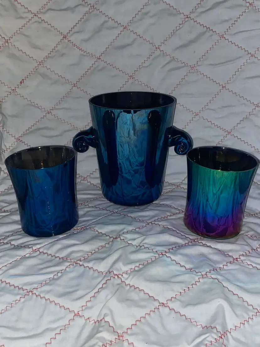Vintage made in Slovakia Iridescent ice bucket with 2 glasses. The bucket is 6” tall and the glasses are 4” tall. This set was in my latest Estate sale Haul and believe me when I say I do not want to let it go it’s so pretty! It is free of cracks or chips.