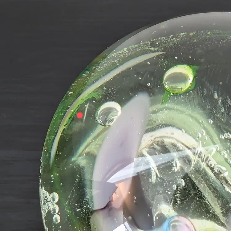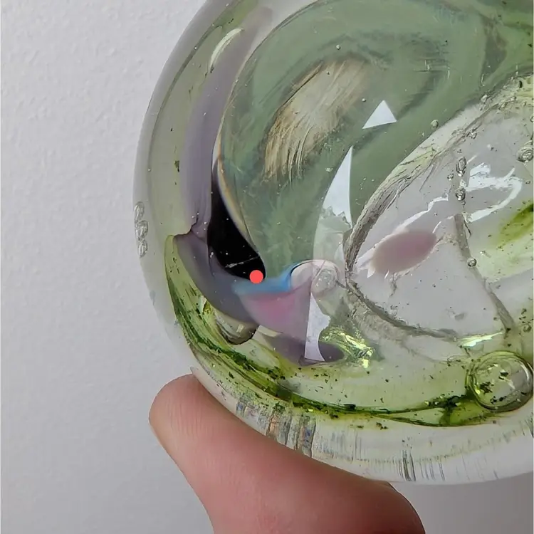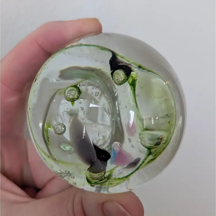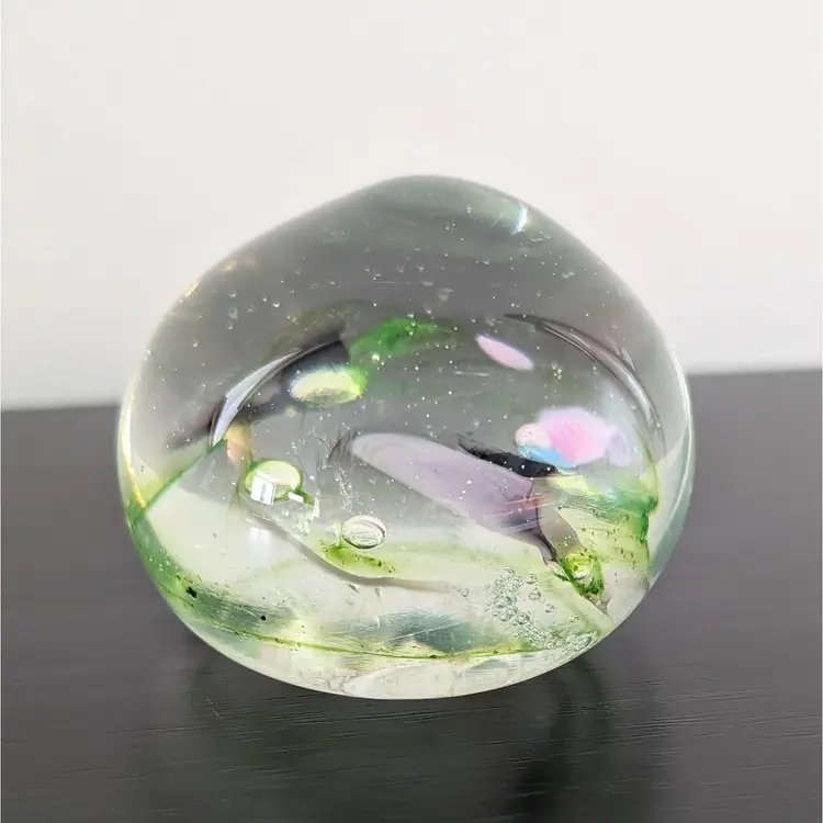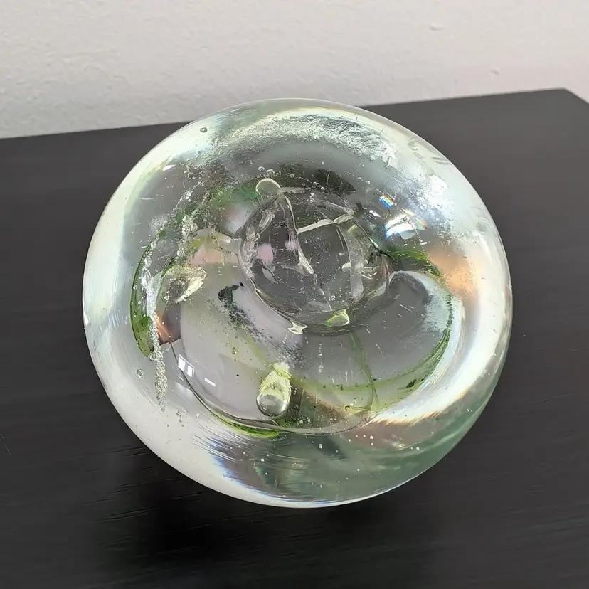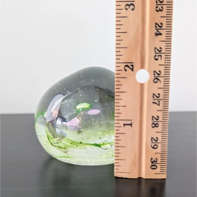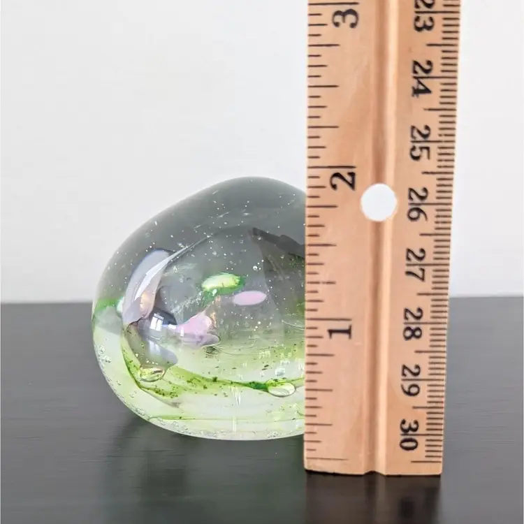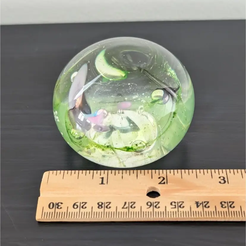 Cute, little paperweight with a slightly pointed top. There is a green swirl with some purple, blue, black and large controlled bubble accents. It is not signed and the pontil on the bottom is a little sharp but it's concave from the base. There are a few minor scratches on the surface (see red dots on pictures).