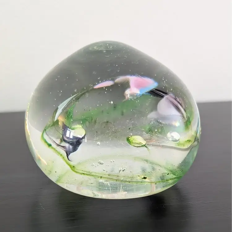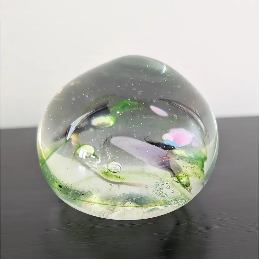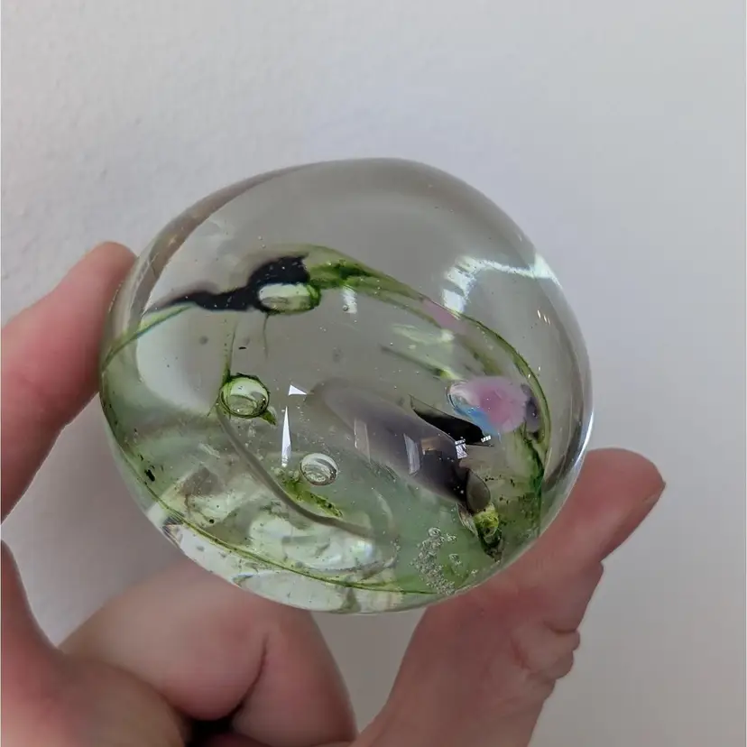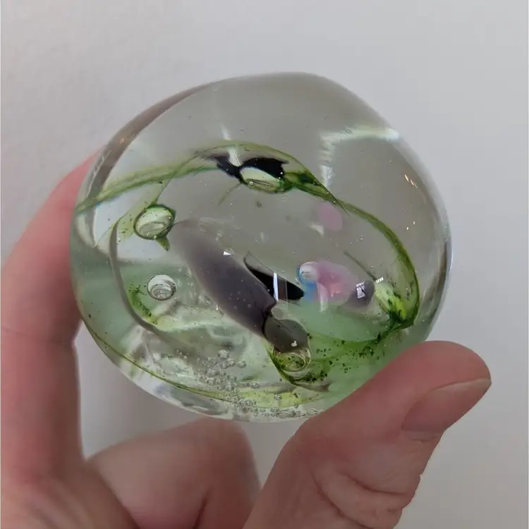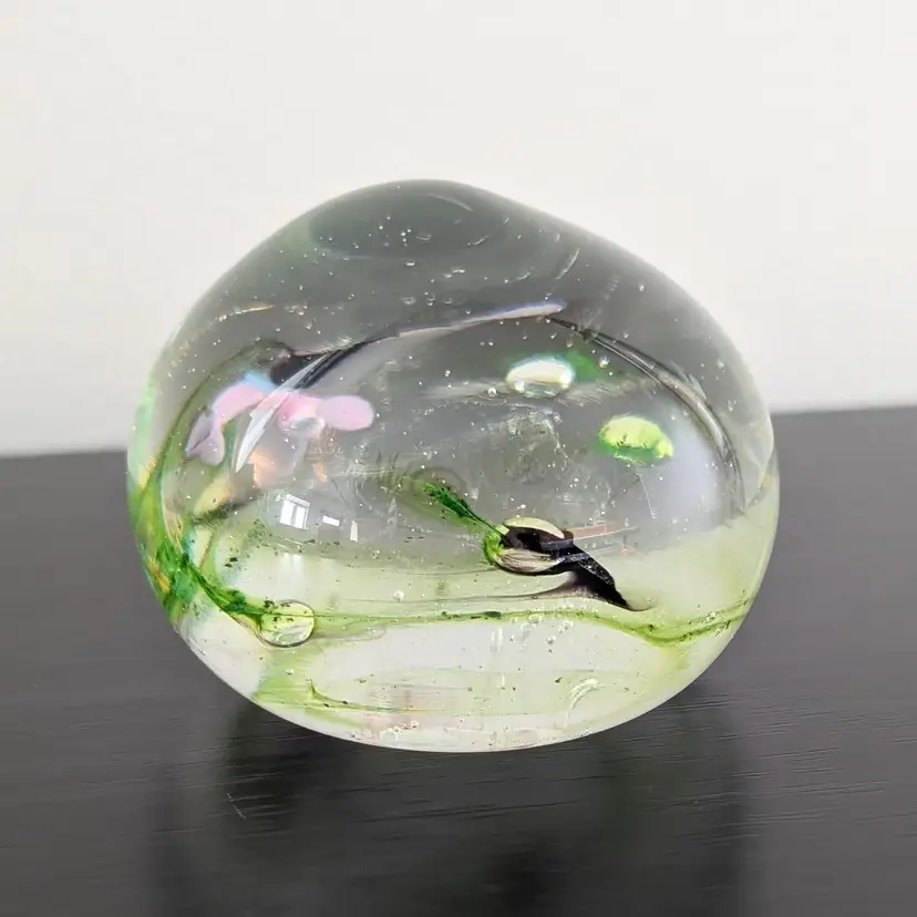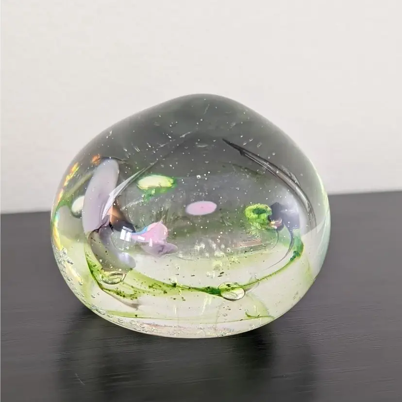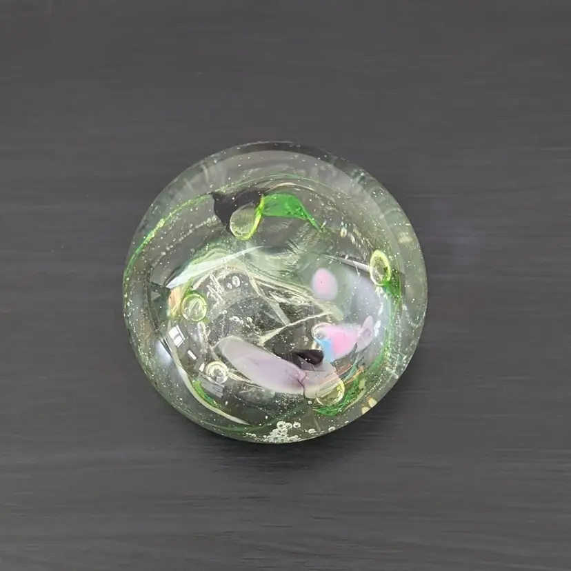 Cute, little paperweight with a slightly pointed top. There is a green swirl with some purple, blue, black and large controlled bubble accents. It is not signed and the pontil on the bottom is a little sharp but it's concave from the base. There are a few minor scratches on the surface (see red dots on pictures).