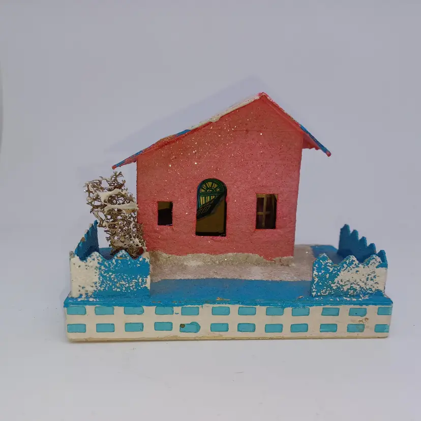 Vintage Small Cardboard Sugar Glitter House Christmas Tree Ornament, Putz Pink Measures 3 3/4 inches tall 5 inches long In good vintage condition Circa 1950s the windows are intact but they are folded back don't really know how to glue them back in place without placing a hole in the back (which these usually have )or taking the roof off- I will leave that up to the new owner please see all pictures as they're the best description all items from the smoke-free home with pets experienced shipper