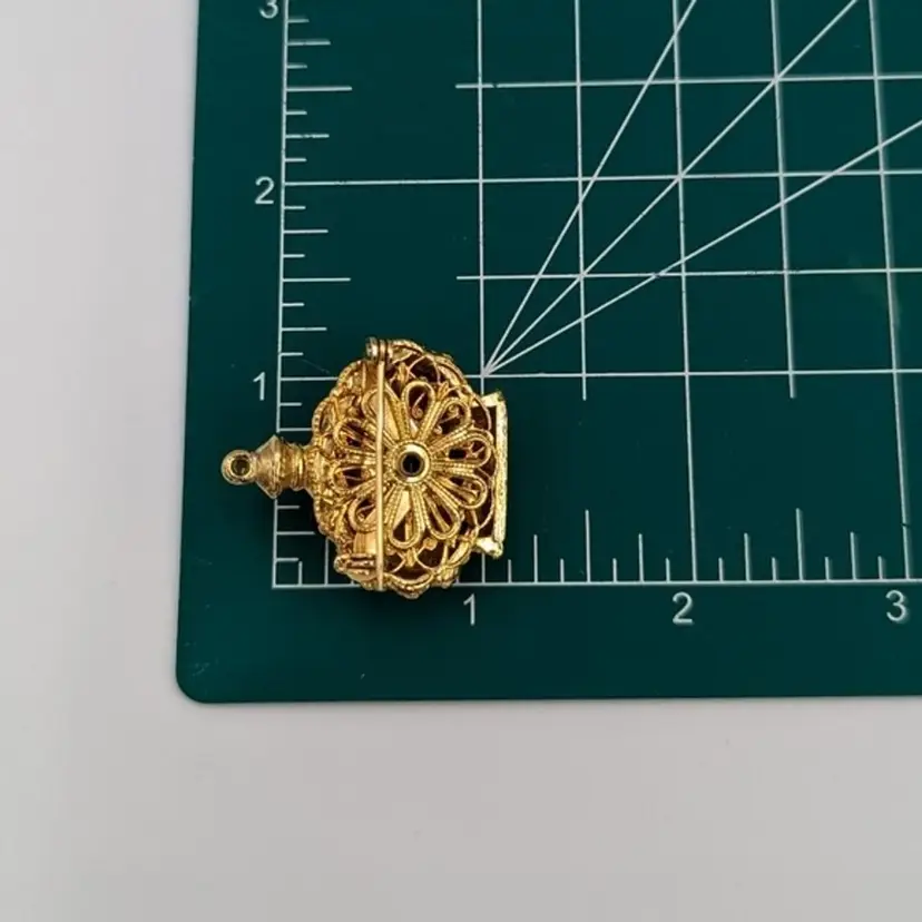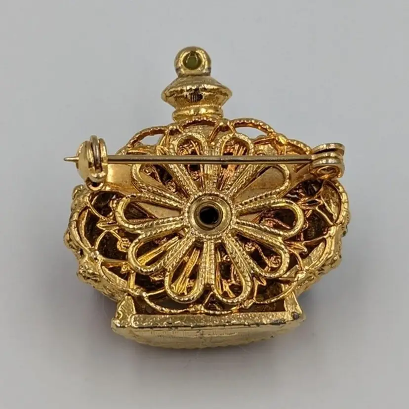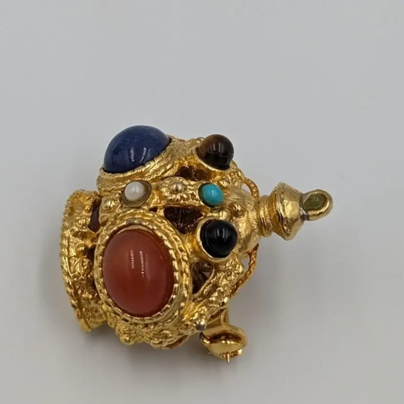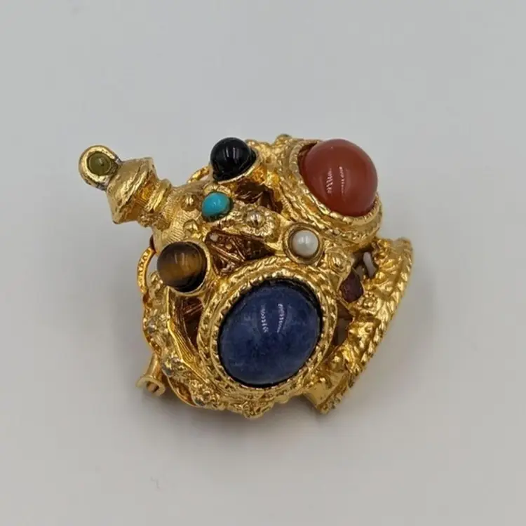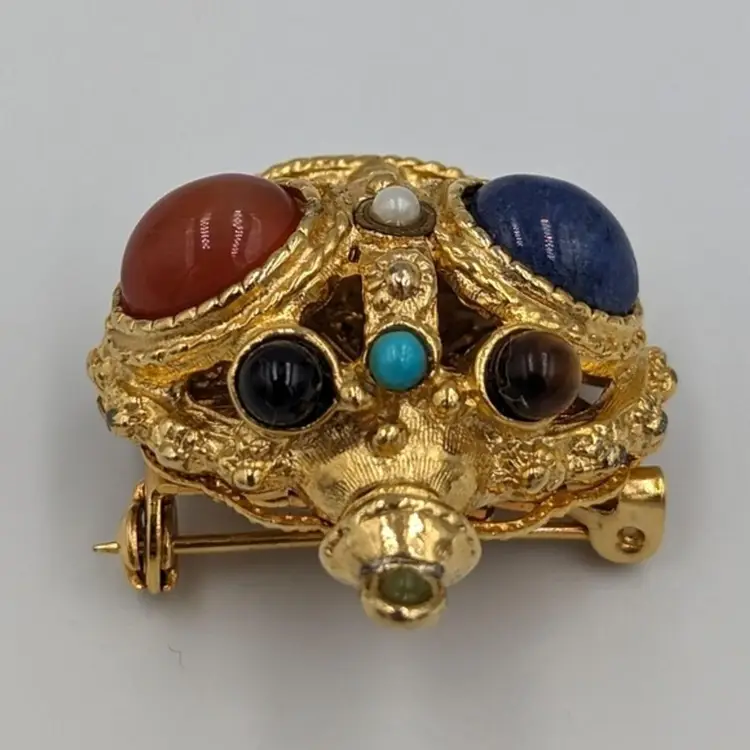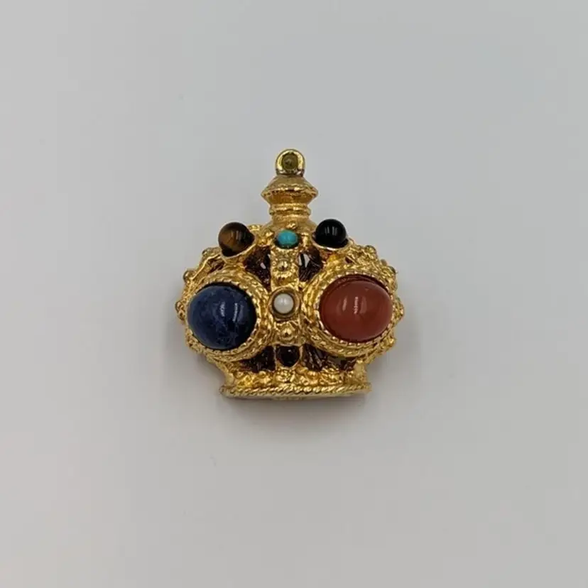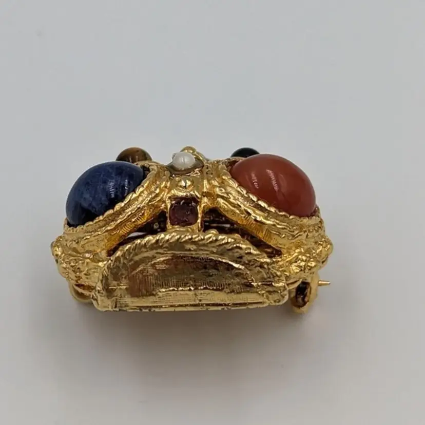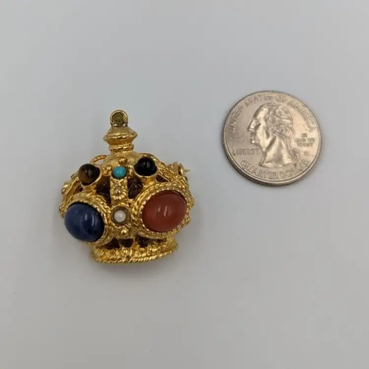 Vintage Small Crown Gold Tone Semiprecious Gemstones/Glass Cabochons Brooch Unmarked Measurements about 1" x 1" Good vintage condition