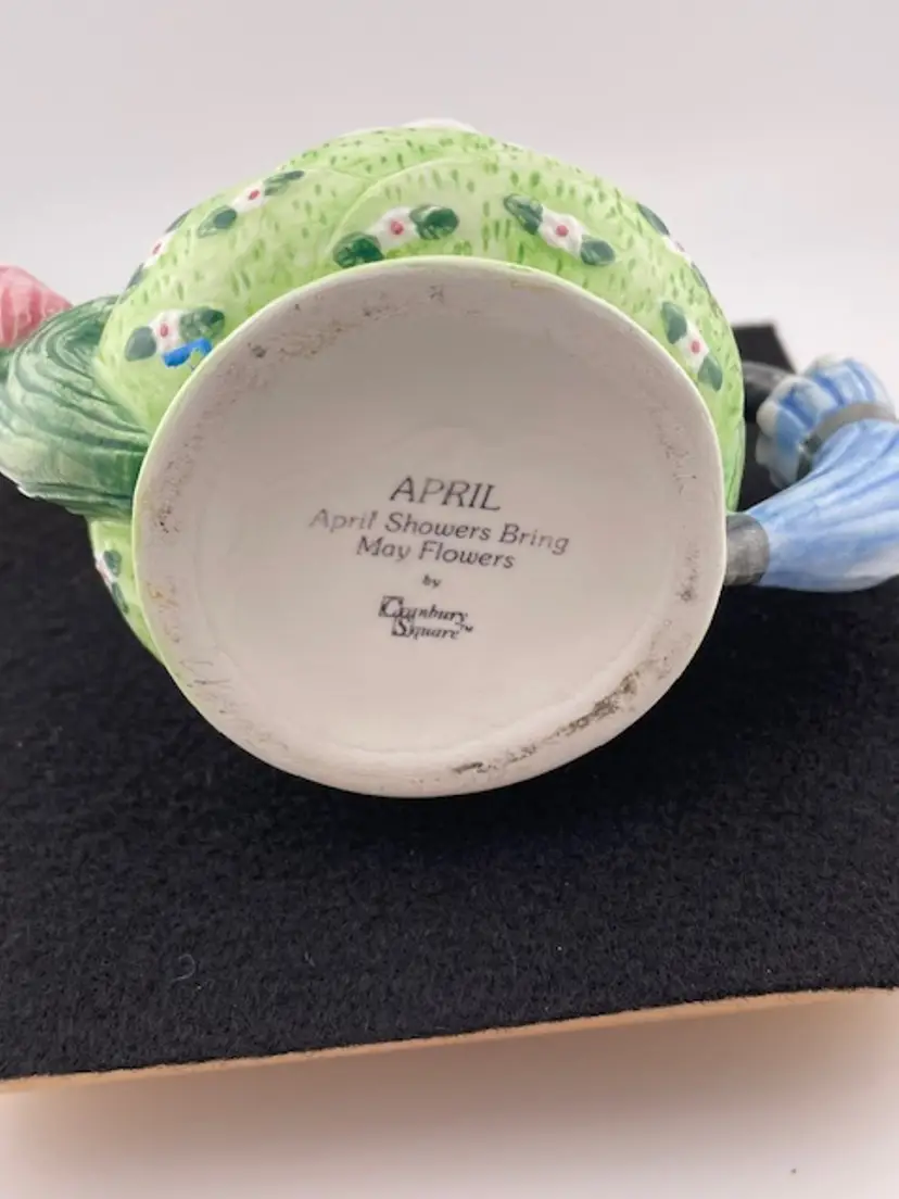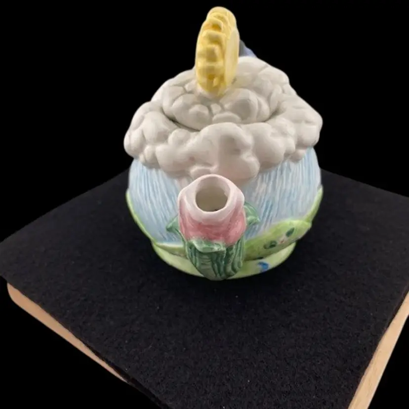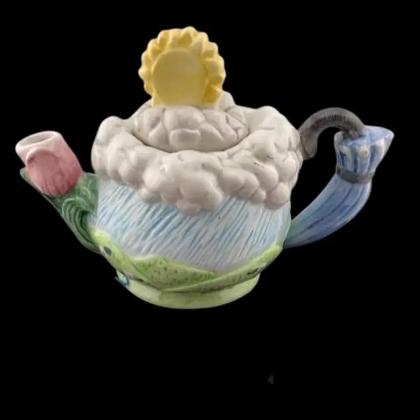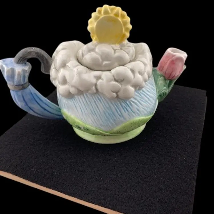 This adorable teapot would be cute for a little girls teaparty. It has an umbrella handle, a tulip spout and a sun with clouds on the lid. It is in good condition with no chips or cracks.