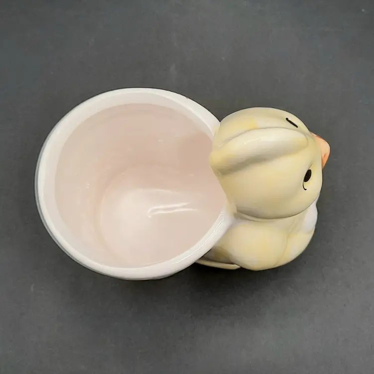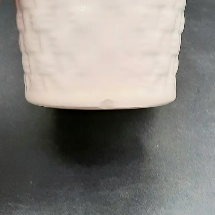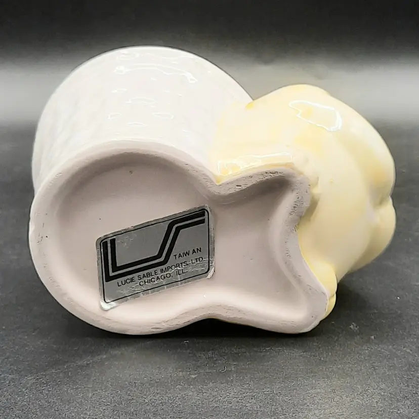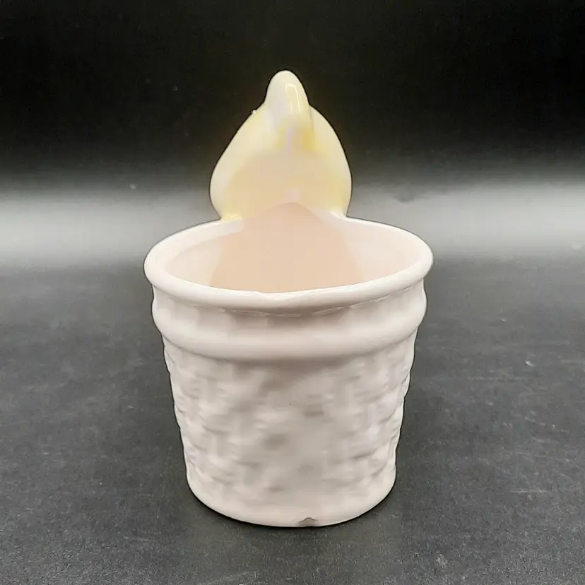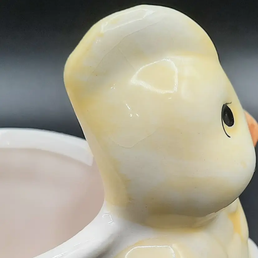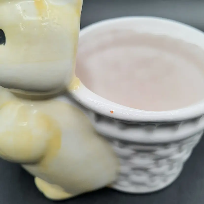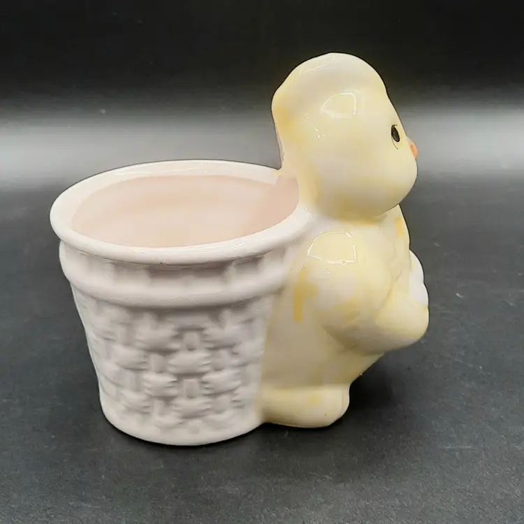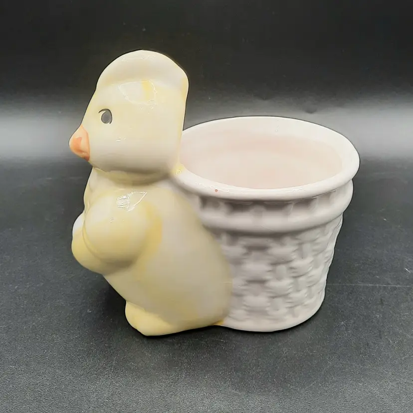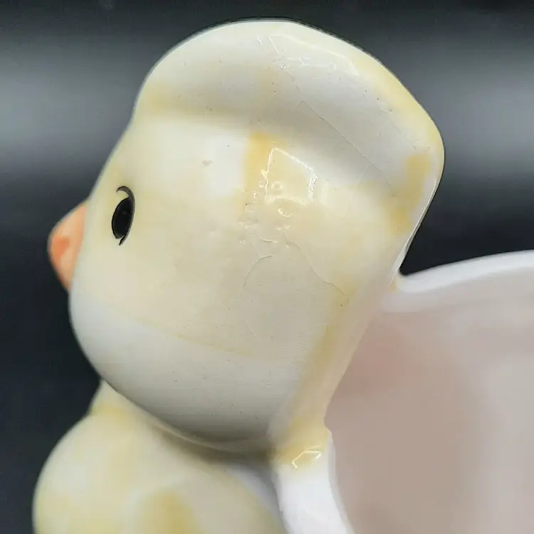 This adorable little fella is 3 3/4"L x 2 1/2"W x 3 3/4"H, he does have a small chip on back bottom edge, what looks like a speck of orange paint on the rim of his basket and some crazing.