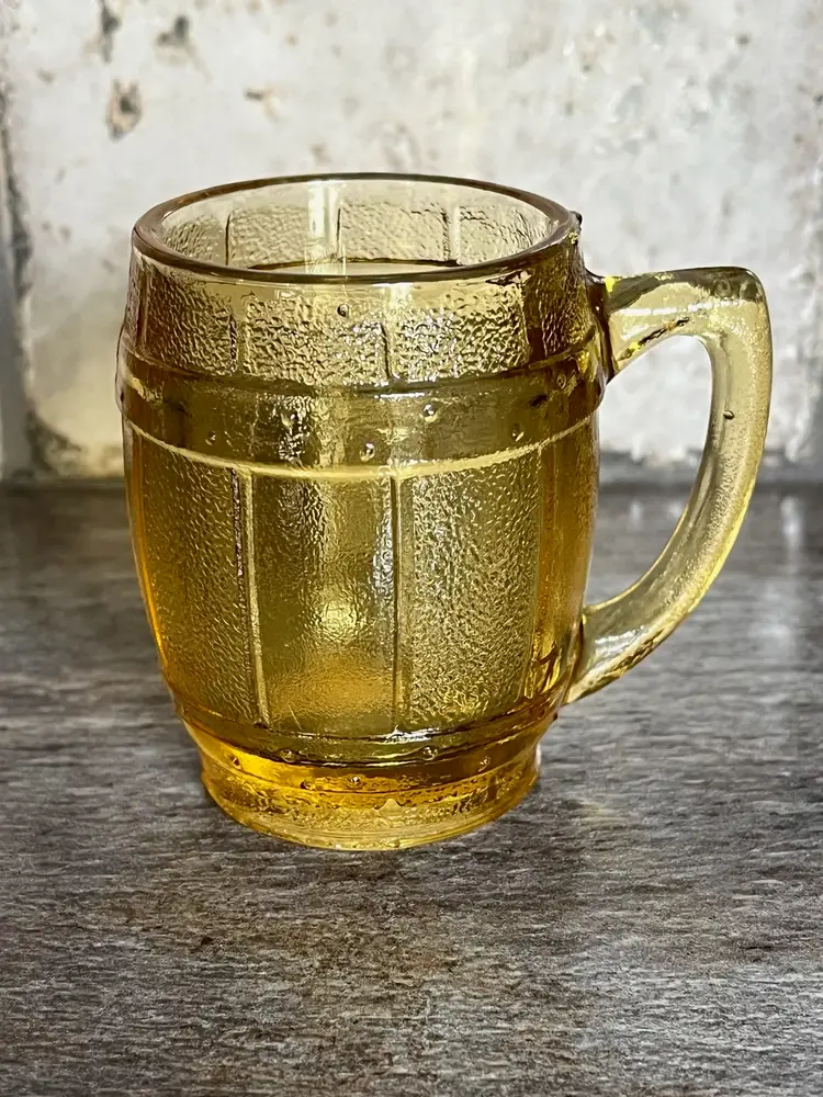 A vintage gold glass root beer mug. Great for toothpicks, a shot glass and pretty if displayed. It measures approximately 2 1/2 inches tall and wide including the handle. No damage.