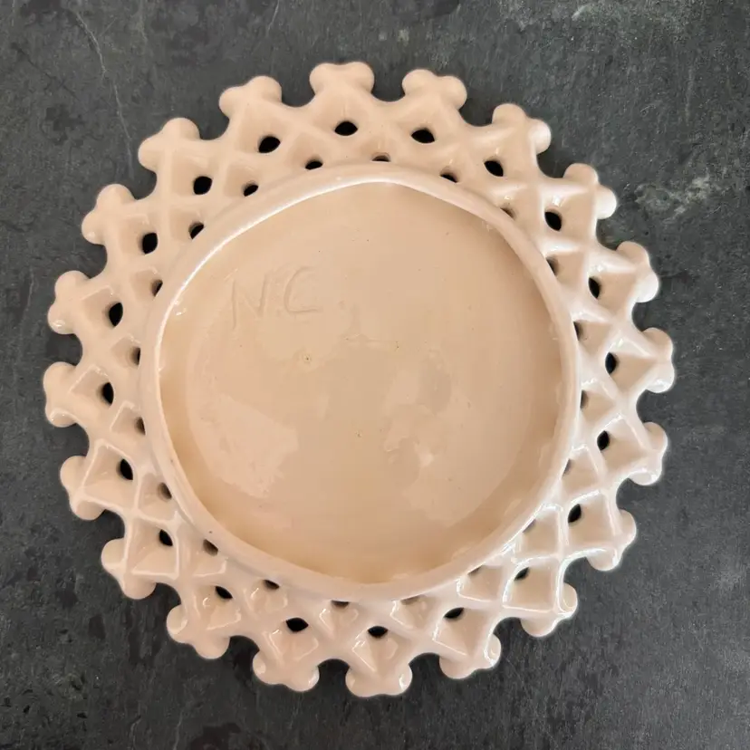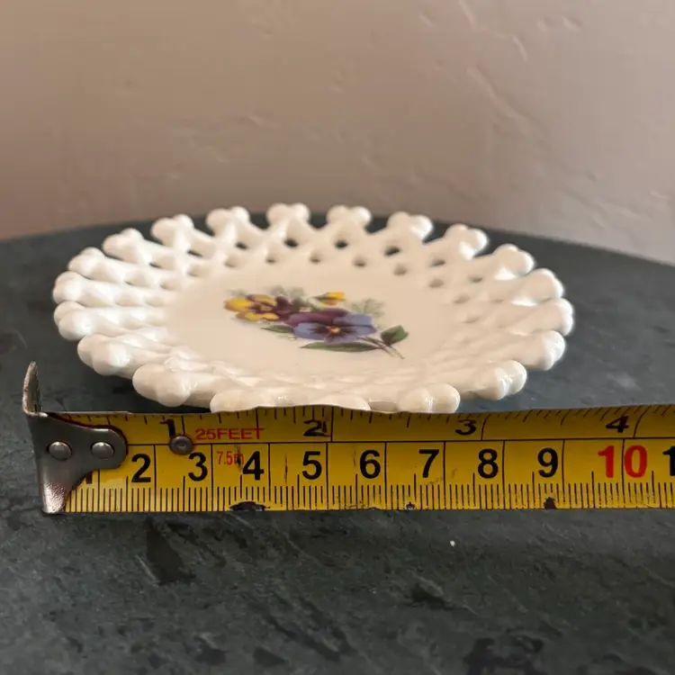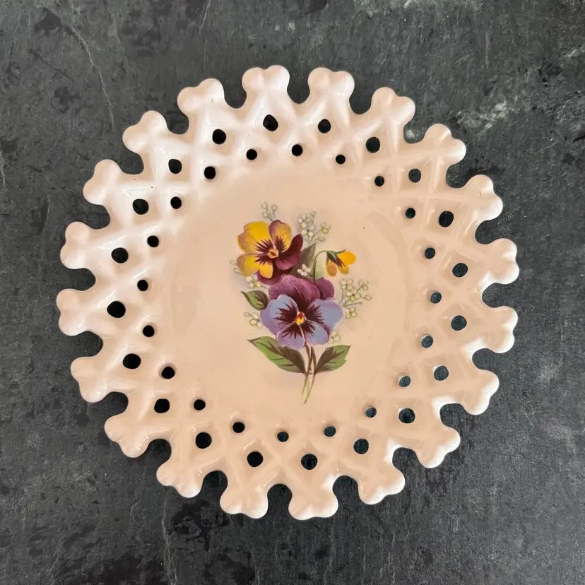 Pretty pansy decorative plate with N.C. marking 3 1/2"diameter Vintage wear as shown- no chips or cracks