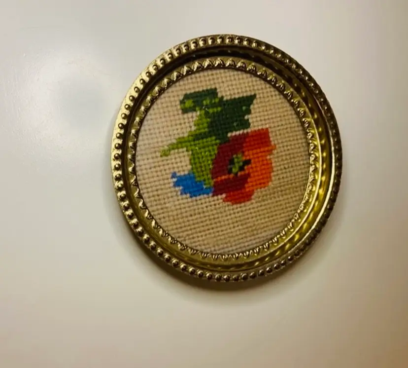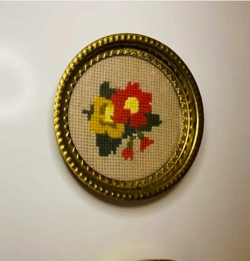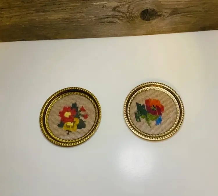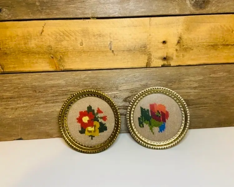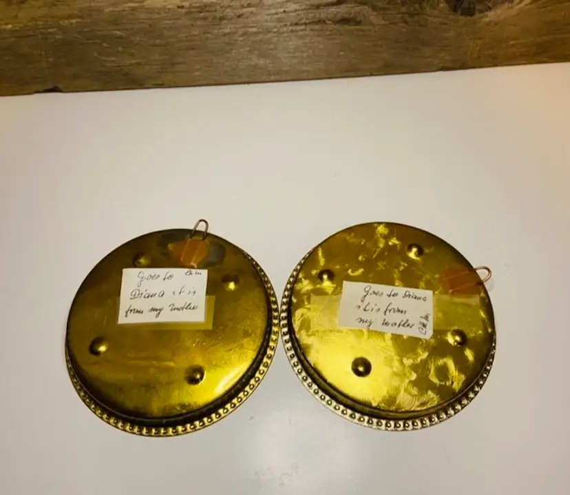 This set of 2 small round brass wall hangings were made by a mother and designated for Diana. Placed in 2 coaster stye brass frames. Both imperfectly perfect. In good used condition. Hangers on the back for hanging on your favorite room or gallery wall.