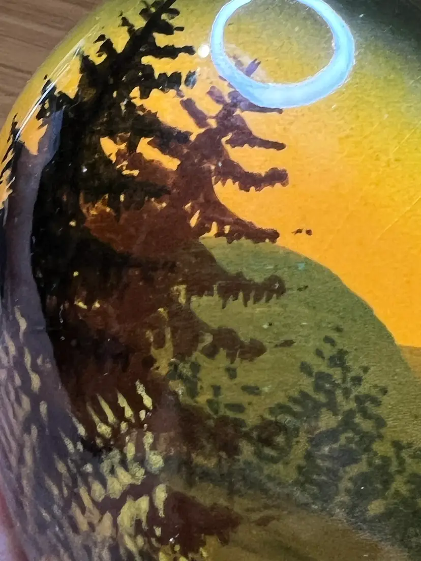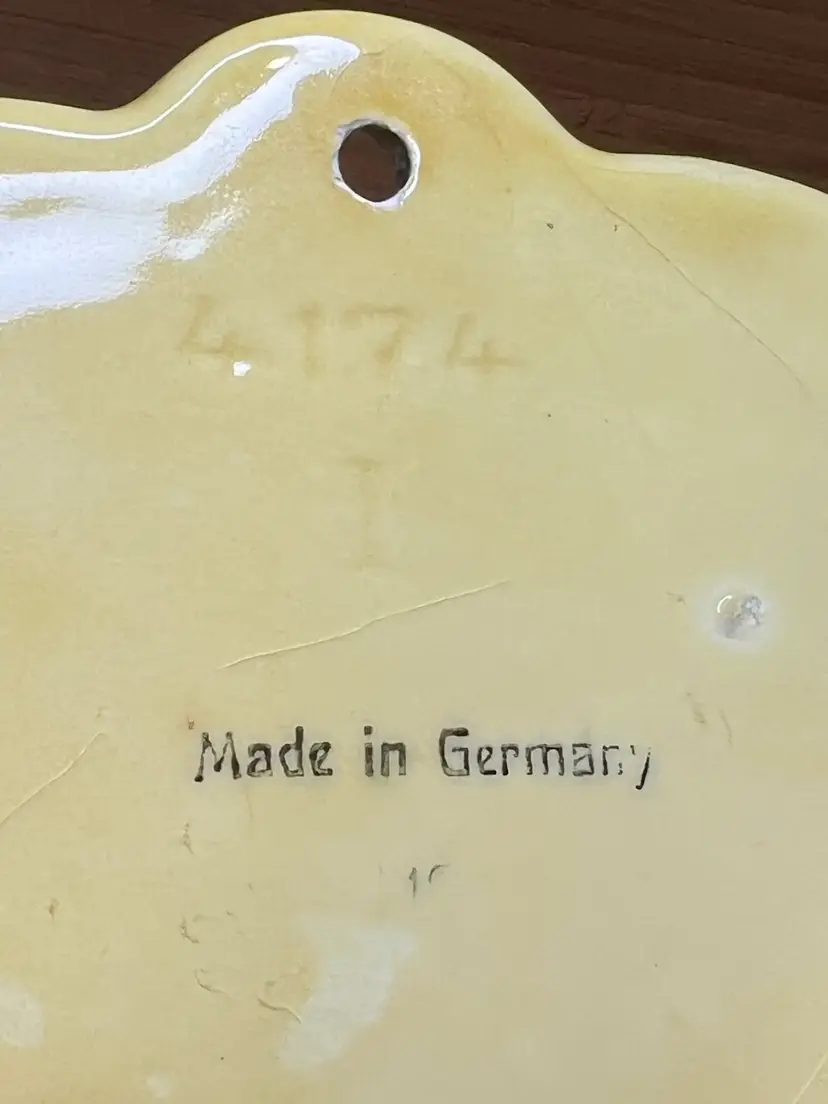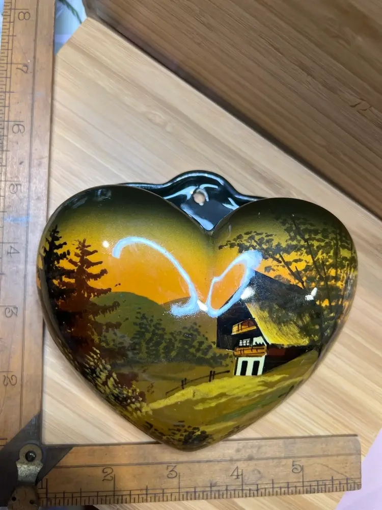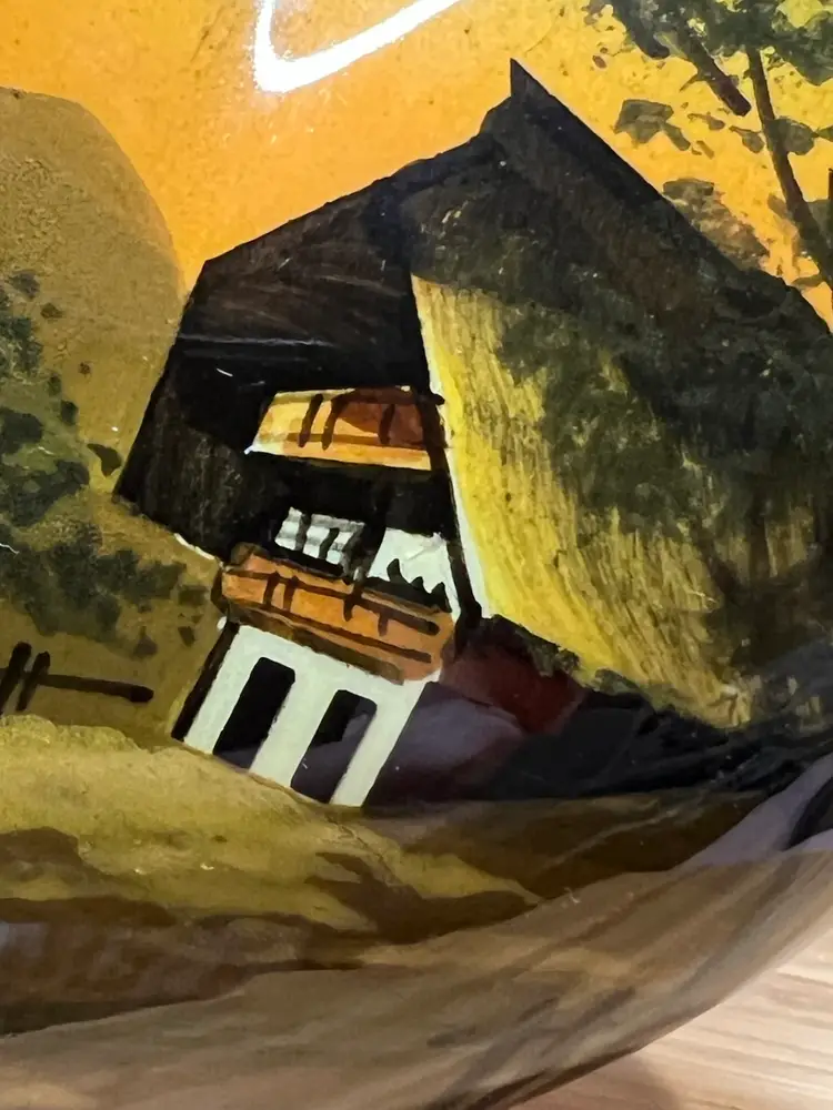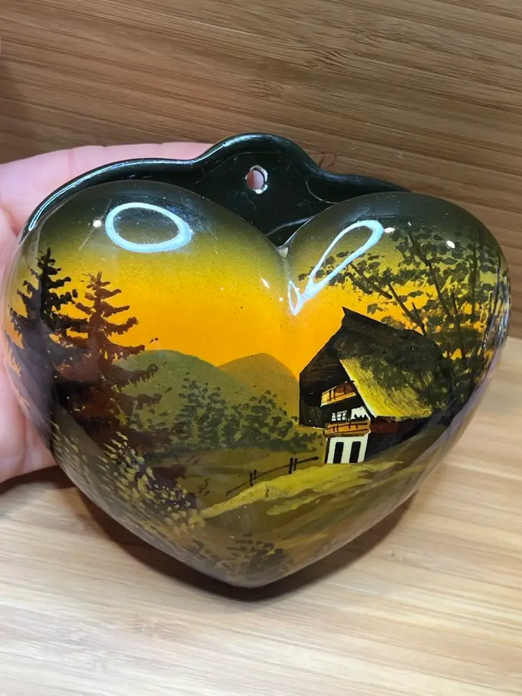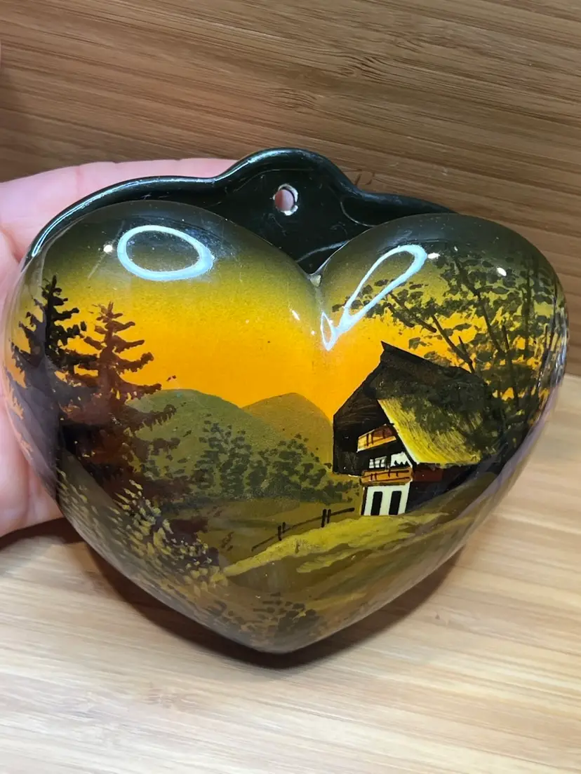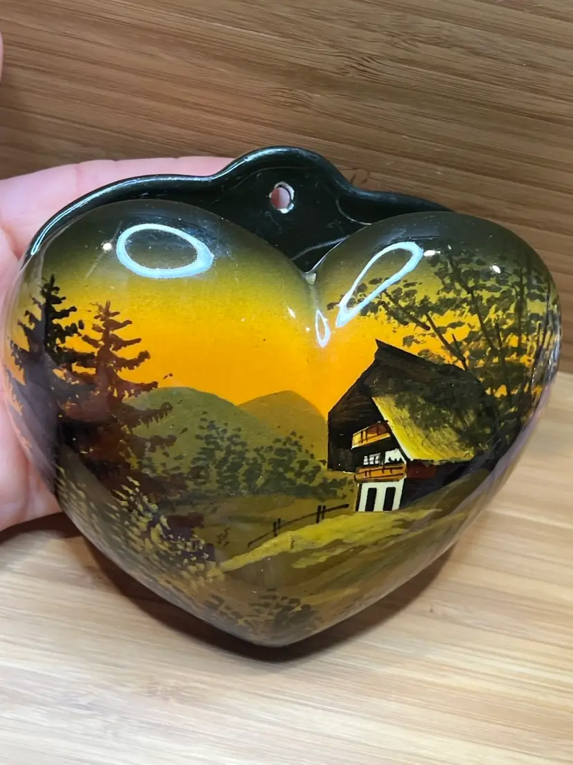 vintage SMF Schramberg Majolica German wall pocket vase, specifically from the 1950s Black Forest series. It’s a shaped ceramic wall planter.Hand-painted Black Forest chalet scene. Made by Schramberger Majolikafabrik (SMF) in Germany. Approximately 4 inches tall and 5 inches wide. It’s a wonderful condition with no chips or cracks slight crazing present on the back