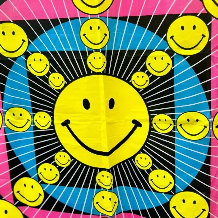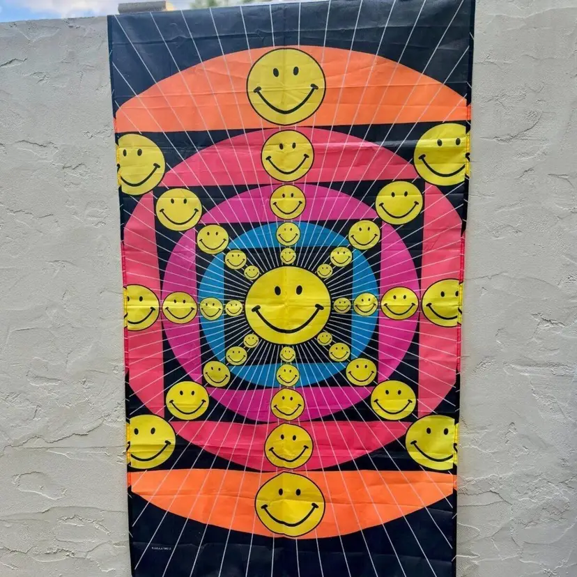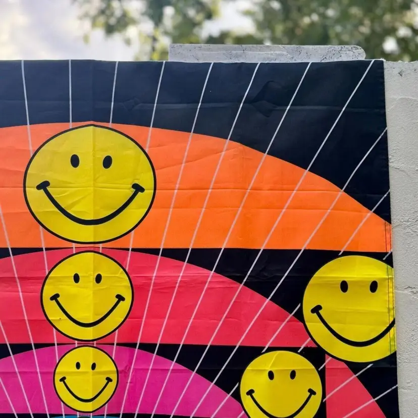 Check out this amazing groovy smiley face vintage flag! The colors are very vivid. Marked 1997. This flag is big! Approximately 61" x 35.5". There are some minor blemishes but overall it looks in great shape for its age. It has metal grommets at the top on each end. Good pre owned condition. Could be used a flag or hung up in a room as a wall hanging. Really cool 90s does 70s decor.