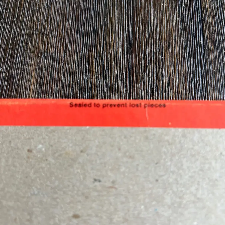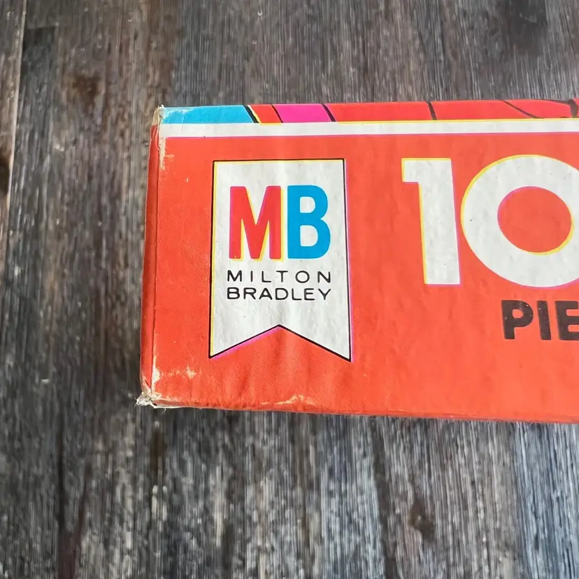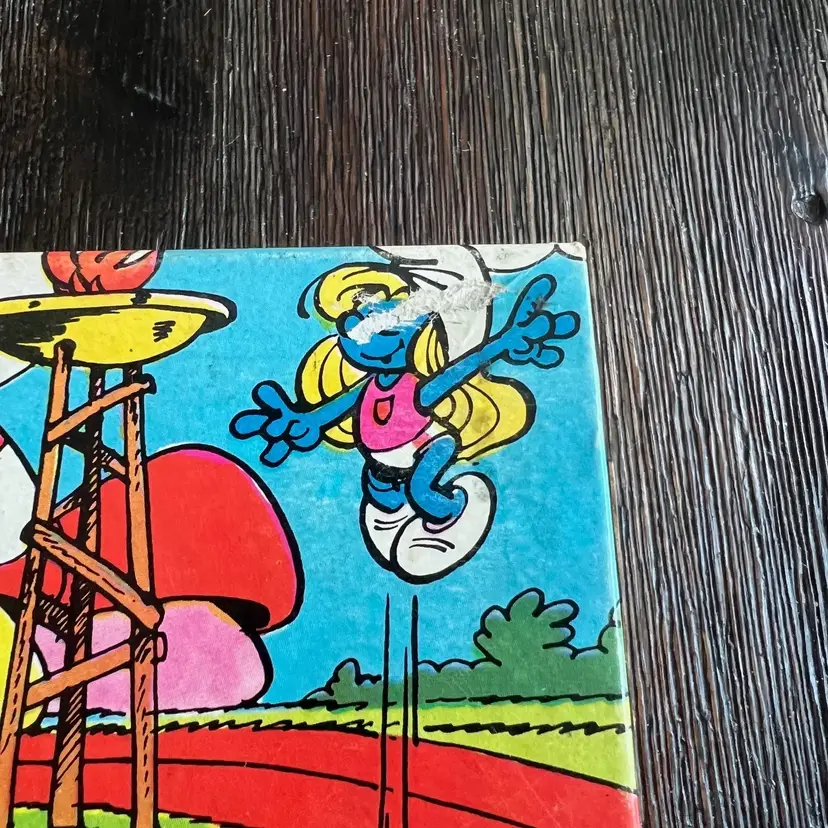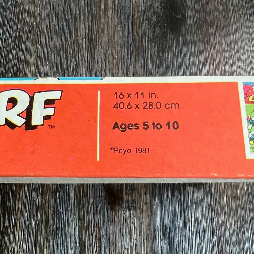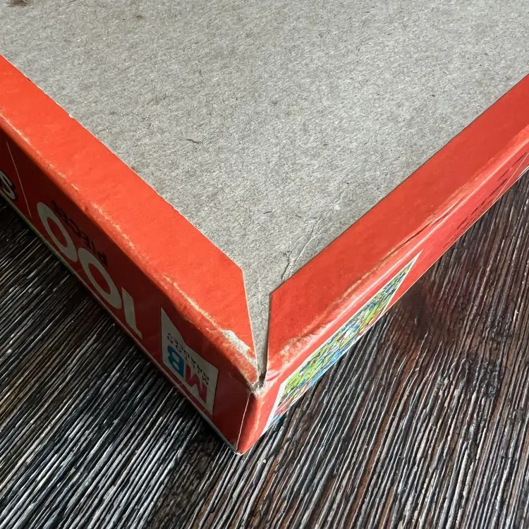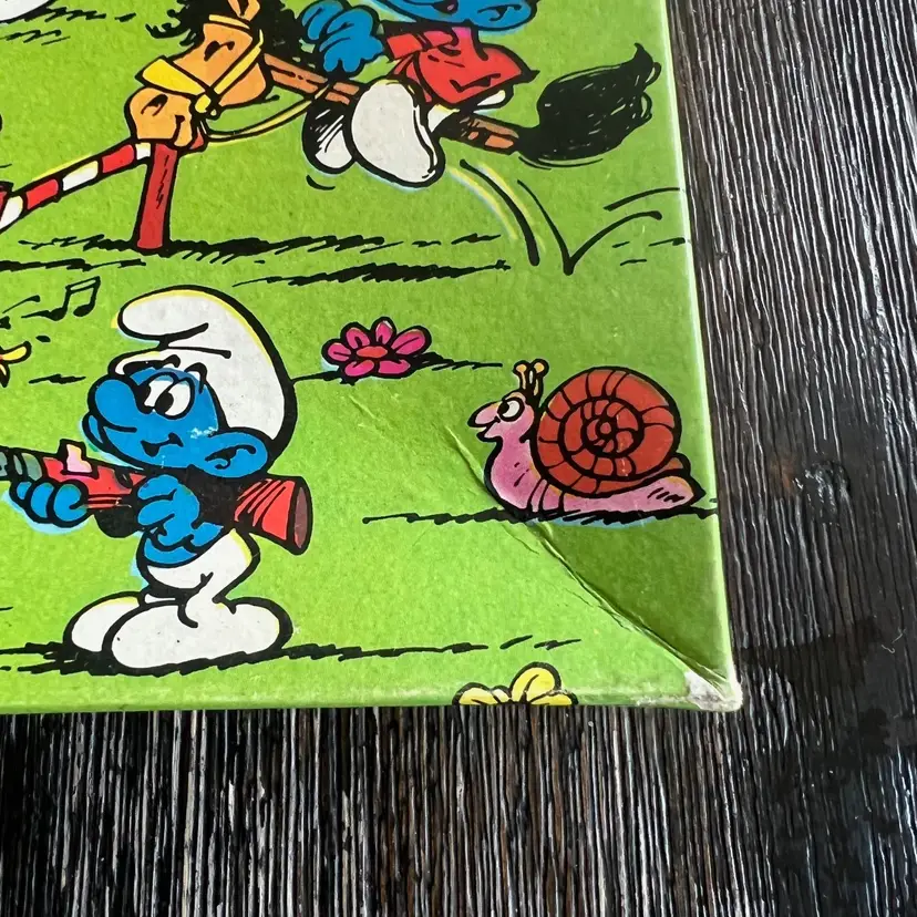 The puzzle is still sealed. The box lid has some dishing (it curves inward a bit). The box and lid have some a few creases and some wear. There is a scuff in the top right corner near Smurfette (see pictures). The bottom of the box has several small spots / stains (see pictures).
