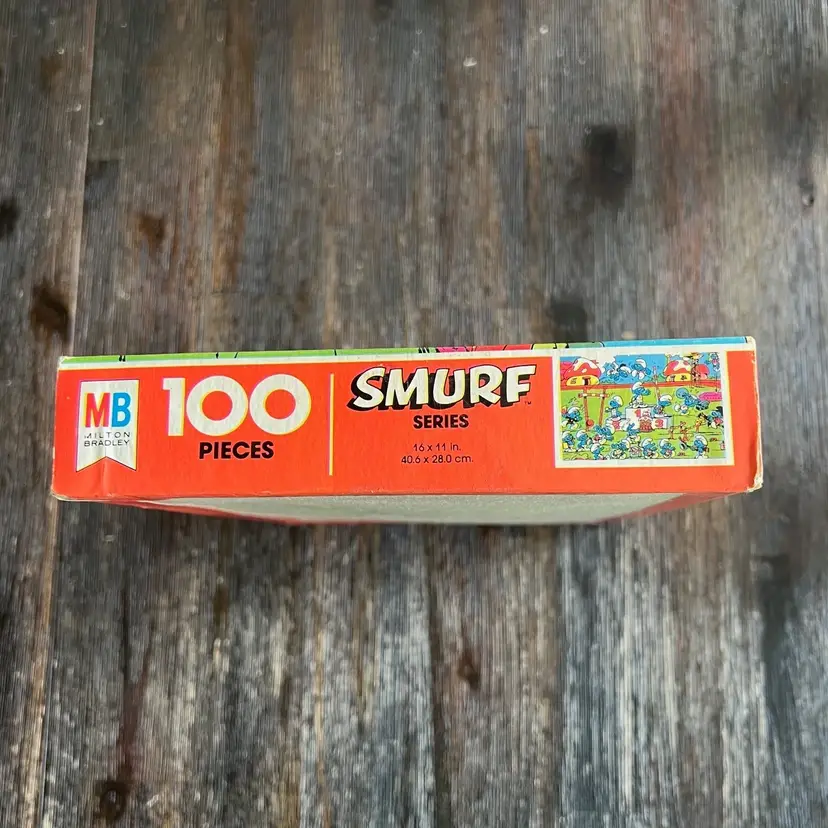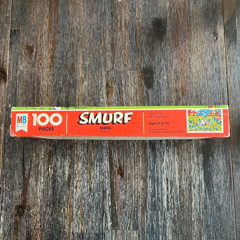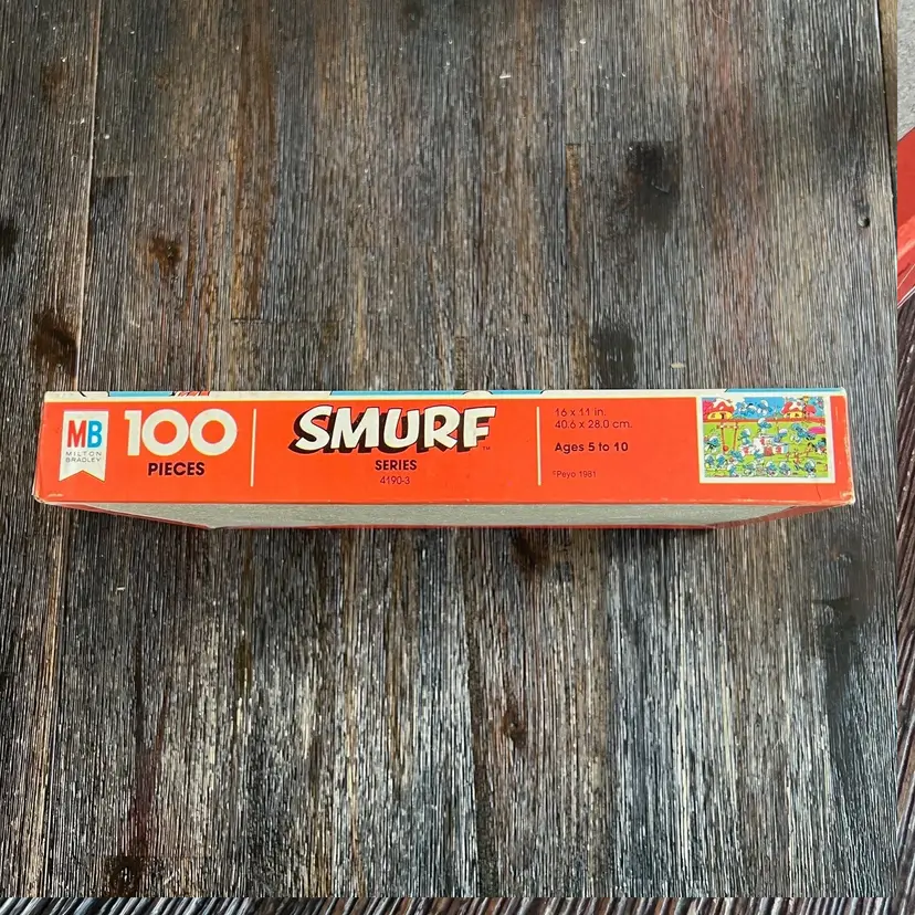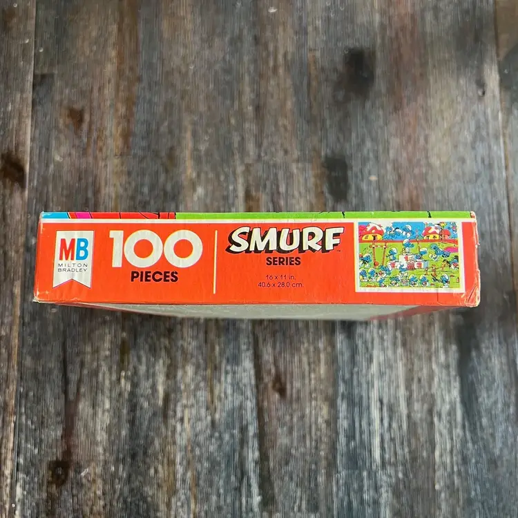 This is a vintage 100-piece Smurf puzzle from Milton Bradley, dated 1981. The box identifies it as Series 4190-3.