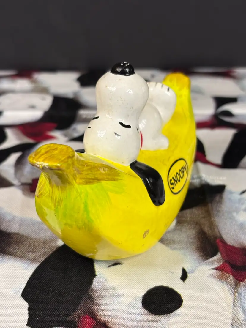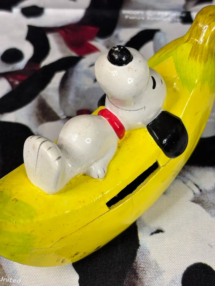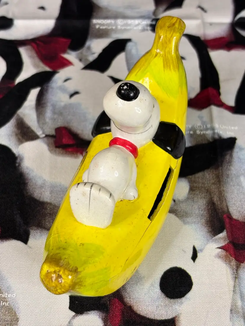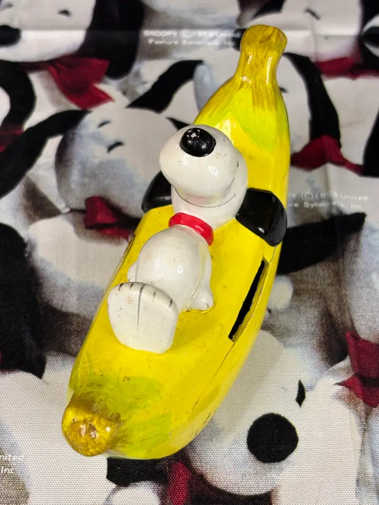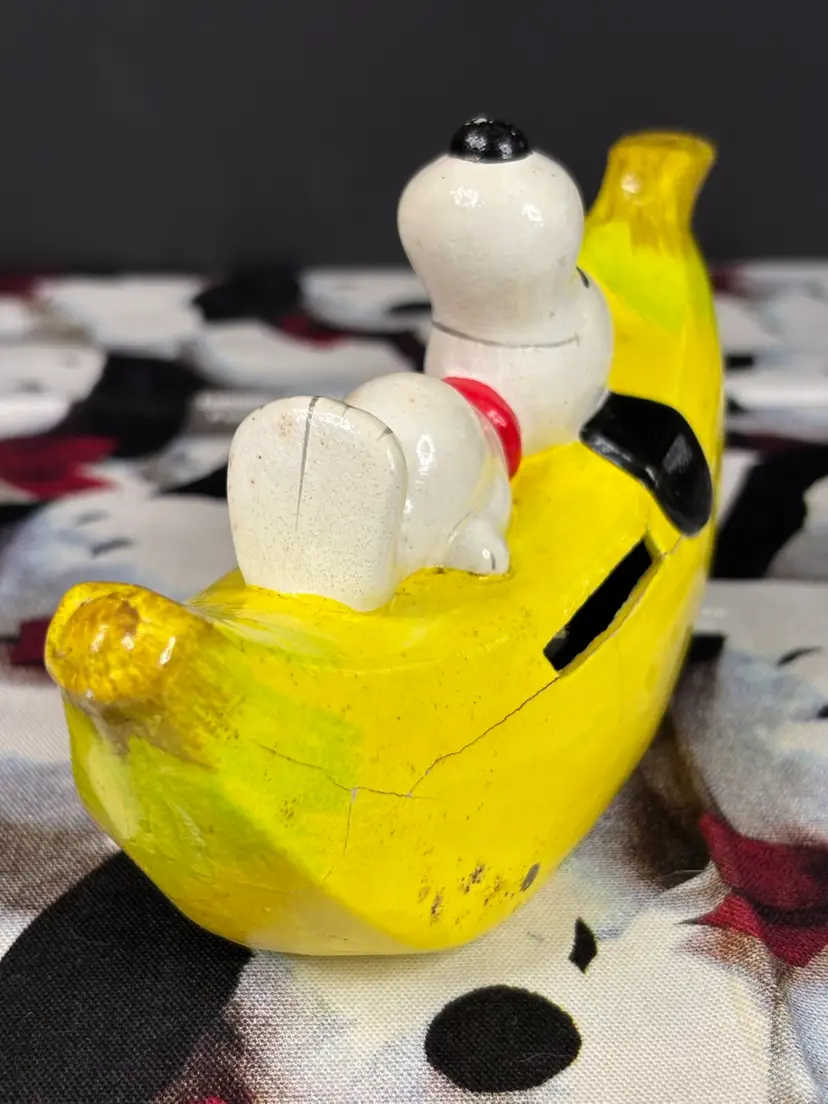 This is a very cool vintage piece of Snoopy laying on a banana. Everything I’ve seen about this piece says it’s ceramic, but it seems more like paper maché material. There are some spots on the banana that make it look like it’s a little over ripe, I’m not sure if these are original or how they got there. There are also some cracks on the back by the coin drop. Depending on how it’s displayed, these wouldn’t be noticeable on the shelf since they’re in the back. Comes complete with the stopper. Add it to your collection today!