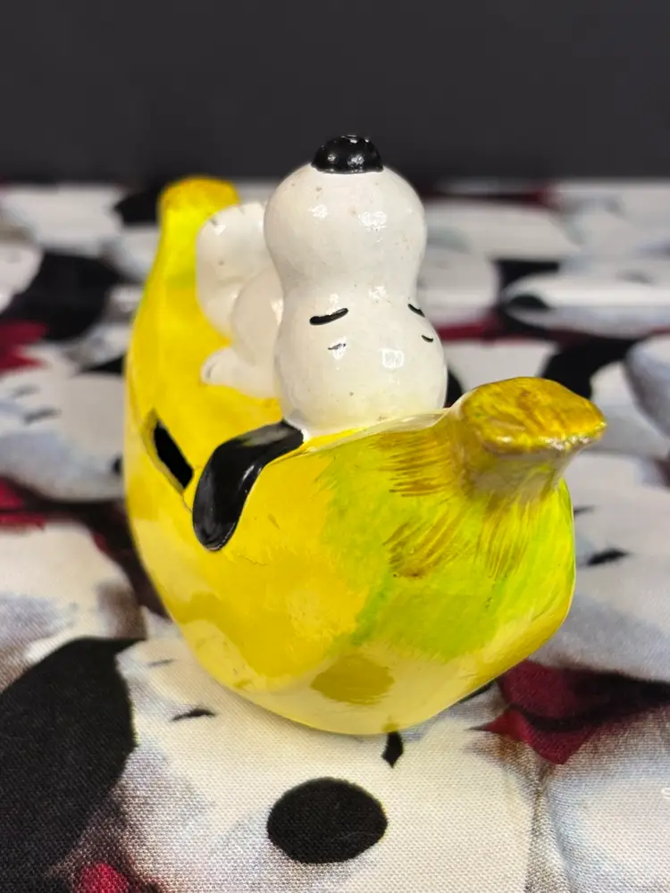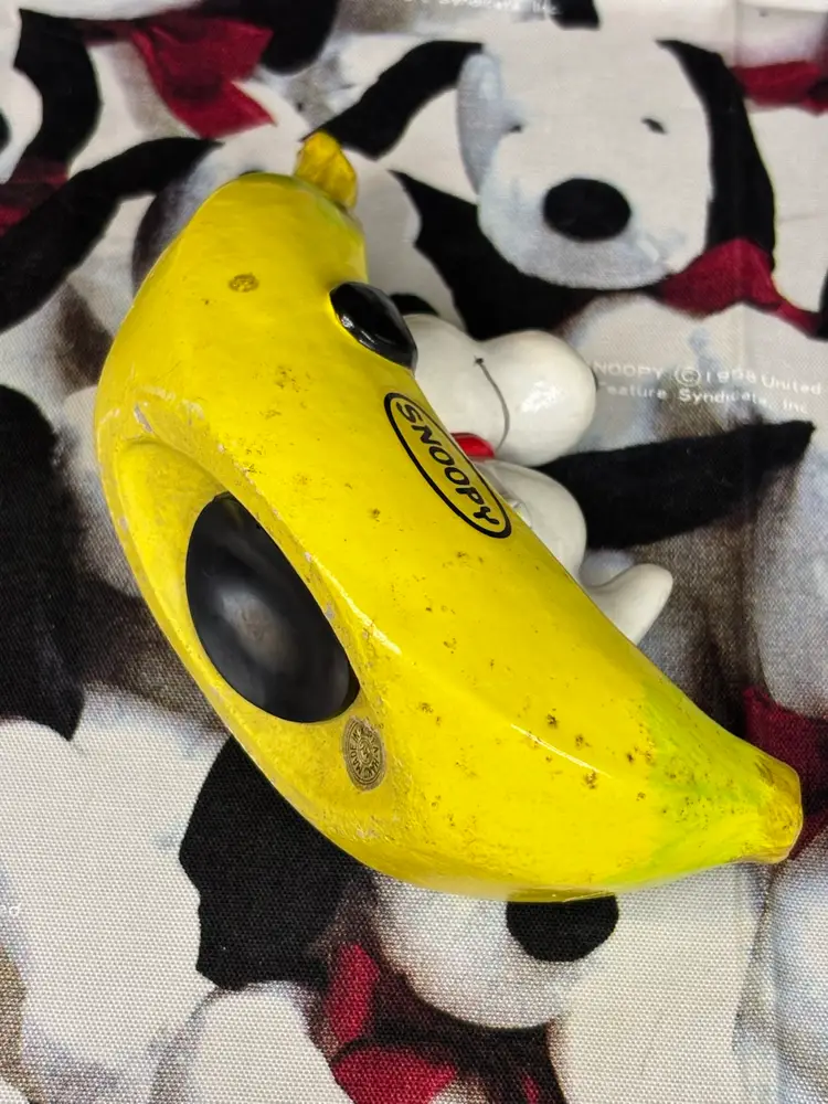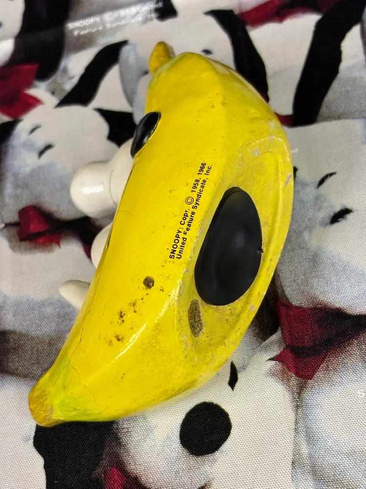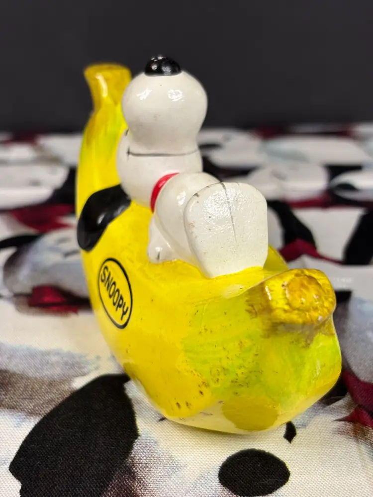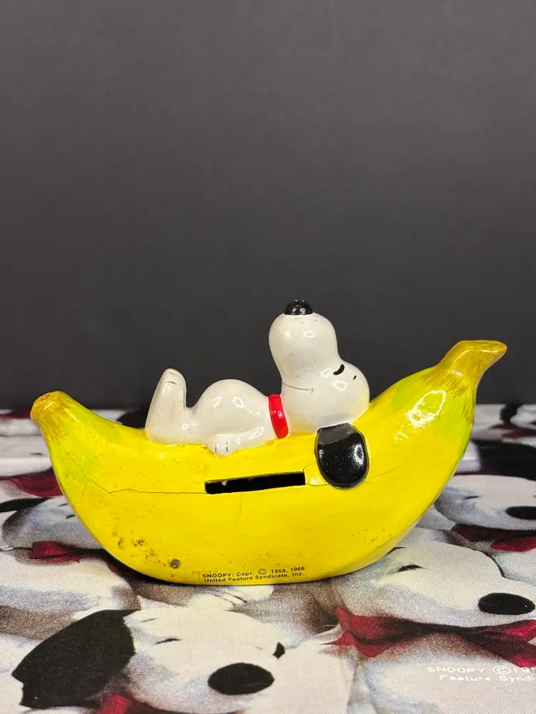 This is a very cool vintage piece of Snoopy laying on a banana. Everything I’ve seen about this piece says it’s ceramic, but it seems more like paper maché material. There are some spots on the banana that make it look like it’s a little over ripe, I’m not sure if these are original or how they got there. There are also some cracks on the back by the coin drop. Depending on how it’s displayed, these wouldn’t be noticeable on the shelf since they’re in the back. Comes complete with the stopper. Add it to your collection today!