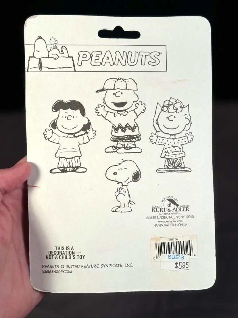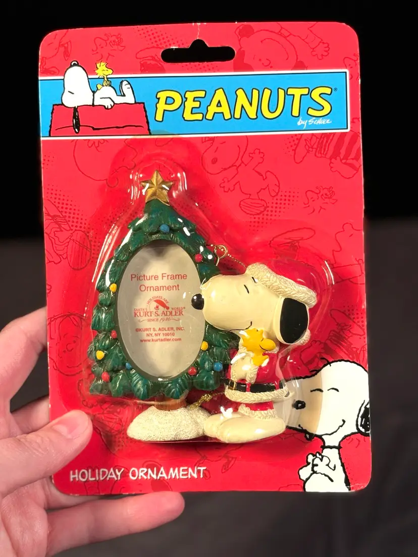 Here’s Santa Snoopy by the Christmas tree. Who would you put in the frame?? This ornament is new in the package. The yellowing appears to be merely on the plastic packaging and not on the ornament itself. It is made by Kurt Adler and would be a great addition to any collection.